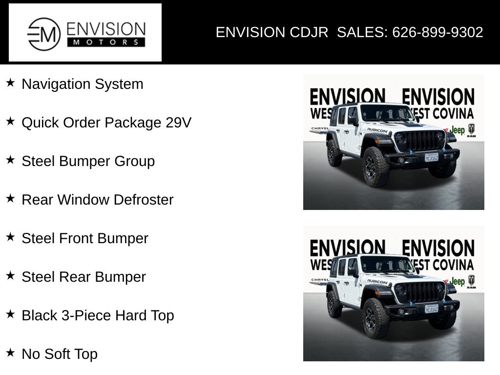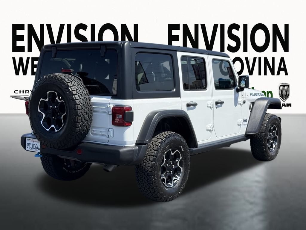 WE SPECIALIZE IN ALL CREDIT PROFILES! See what we can do for you! Call to find out (626) 899-9302.Certified. Clean CARFAX.Odometer is 7003 miles below market average! 2.0L I4 DOHC, Black 3-Piece Hard Top, Freedom Panel Storage Bag, Navigation System, No Soft Top, Quick Order Package 29V, Rear Window Defroster, Rear Window Wiper/Washer, Steel Bumper Group, Steel Front Bumper, Steel Rear Bumper.Bright White Clearcoat2022 Jeep Wrangler Unlimited Rubicon 4xe 4WD 8-Speed Automatic 2.0L I4 DOHCFCA US LLC Certified Pre-Owned Details: * Limited Warranty: 3 Month/3,000 Mile (whichever comes first) after new car warranty expires or from certified purchase date * Roadside Assistance * Vehicles Up to 75,000 Miles and/or 5 Model Years. 24-Hour Towing & Roadside Assistance, Car Rental Allowance, CARFAX® Vehicle History ReportTM and an Introductory 3-month Subscription to SiriusXM® Satellite Radio & Certified Warranty Upgrades * Transferable Warranty * Vehicle History * Powertrain Limited Warranty: 84 Month/100,000 Mile (whichever comes first) from original in-service date * 125 Point Inspection * Warranty Deductible: $100**********All Pricing and Advertised Prices for any/all vehicles offered for sale does not include dealer installed accessories which can be purchased for an additional cost.********** The Factory Rebates may not be available on this vehicle if you elect to take advantage of a Special Alternative APR or Special Lease program. Some Factory Rebates are California Resident specific and may vary for residents of other states. NO sales to Dealers, Brokers or Exporters. For out of state purchase, customers must be present to purchase. If shipping is required, dealership must facilitate; no exceptions. Please contact us for special Multi-Vehicle or Fleet pricing. Prices are plus government fees and taxes, any finance charges, $85 documentary fee, $29 electronic registration fee, any emission testing charge and $1.75 per new tire state tire fee. *** We make every effort to provide accurate information, but please verify before purchasing. Leasing & financing available on approved credit. Trade-ins accepted. Subject to prior sale.