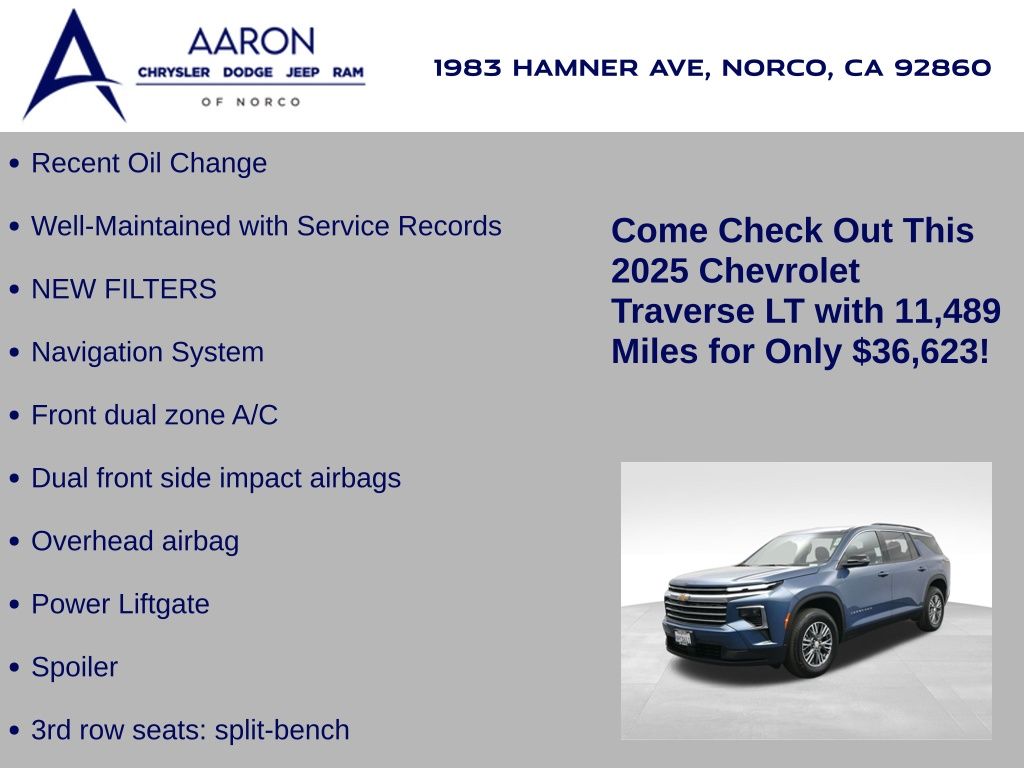Offering bold style, advanced technology, and family-friendly versatility, this 2025 Chevrolet Traverse LT FWD is a modern midsize SUV designed to make every journey more comfortable and connected. With only 11,489 miles and a clean one-owner Carfax history, this Lakeshore Blue Metallic Traverse is powered by a responsive 2.5L turbocharged engine paired with a smooth 8-speed automatic transmission, delivering both confident acceleration and an EPA-estimated 23 MPG combined (21 city/27 highway). The LT trim offers a premium driving experience with Jet Black premium cloth seating, heated front seats, a power drivers seat, and tri-zone automatic climate control to keep everyone comfortable. Its roomy interior features flexible seating for up to eight passengers and smart storage solutions for cargo of all shapes and sizes. Technology is front and center with a standard 17.7-inch diagonal color display, wireless Apple CarPlay and Android Auto, Wi-Fi hotspot capability, OnStar, HD rear vision camera, and Google built-in compatibility for navigation, music, and voice assistance. Safety is a top priority, with Chevrolet Safety Assist bringing forward collision alert, automatic emergency braking, lane keep assist with lane departure warning, following distance indicator, front pedestrian braking, and IntelliBeam auto high beams. The LT trim also adds adaptive cruise control for long-distance comfort and rear cross-traffic braking for added confidence in parking situations. Exterior highlights include sleek roof rails, 18-inch Grazen Metallic machined-face aluminum wheels, and LED signature lighting for a refined, modern look. With its low mileage, remaining factory warranty, and impressive blend of comfort, performance, and innovation, this 2025 Chevrolet Traverse LT is ready to serve as the ultimate daily driver or road trip companion. Visit us today to see why the redesigned Traverse continues to stand out in the competitive three-row SUV segment.