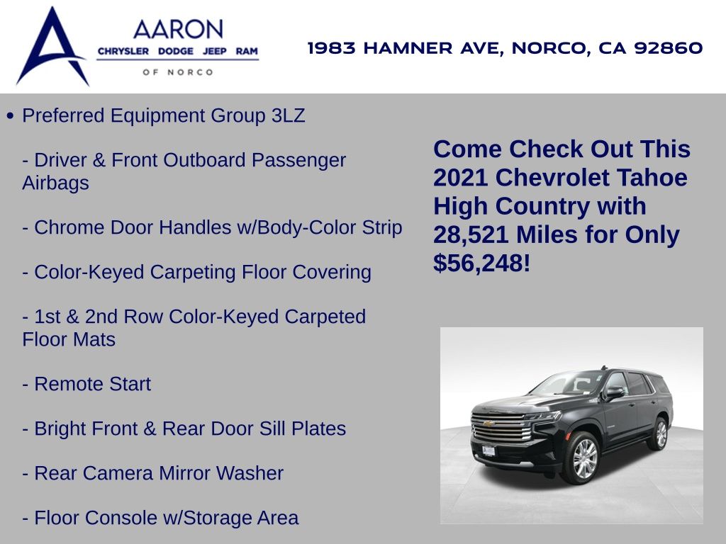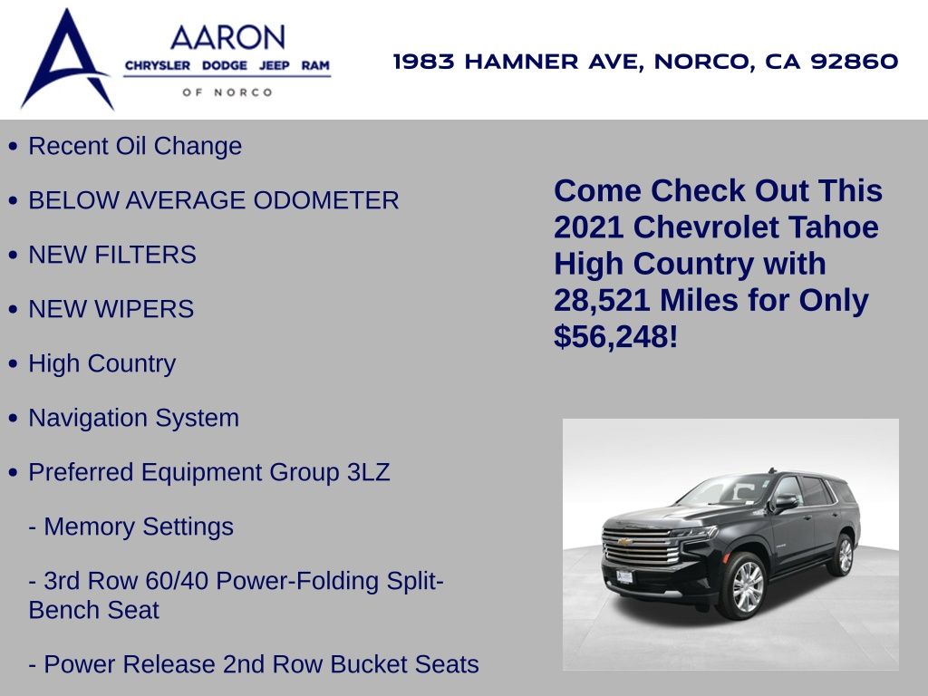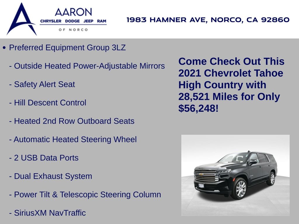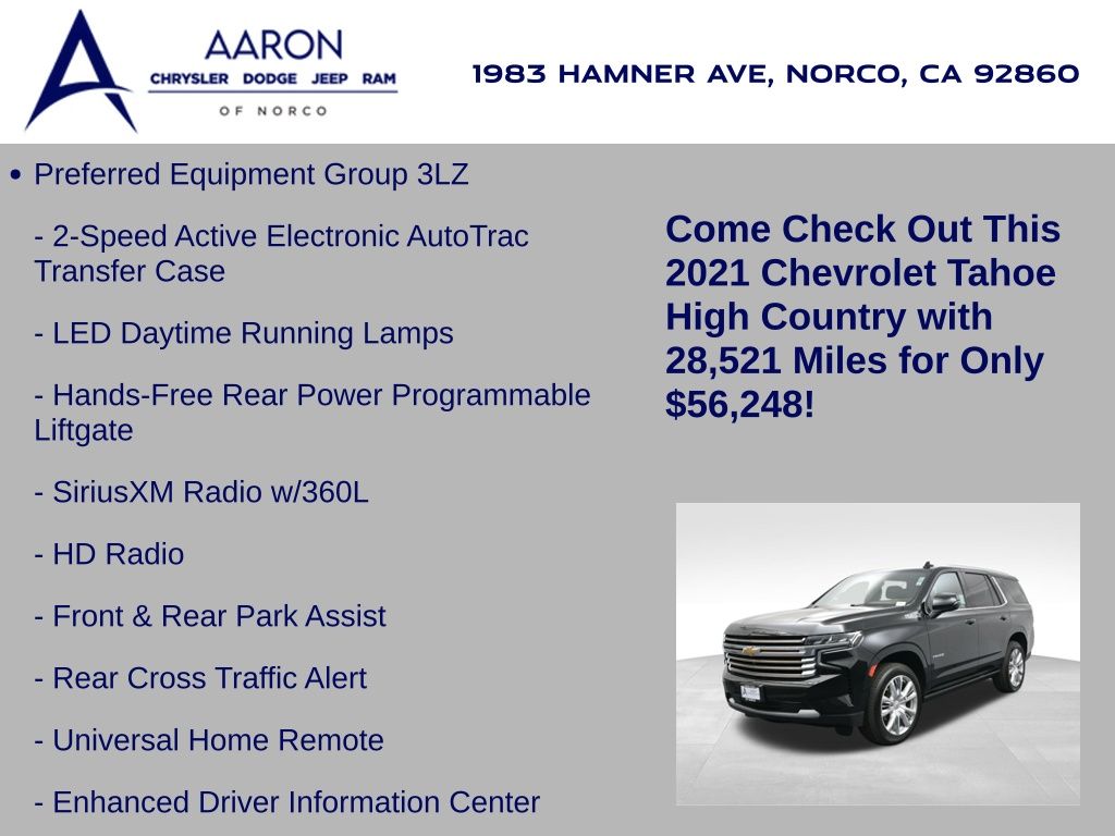 Priced below KBB Fair Purchase Price!Recent Oil Change, BELOW AVERAGE ODOMETER, NEW FILTERS, NEW WIPERS, High Country, Tahoe High Country, 4D Sport Utility, EcoTec3 6.2L V8, 10-Speed Automatic with Overdrive, 4WD, Jet Black/Mocha Leather, 15" Diagonal Multi-Color Head-Up Display, 1st & 2nd Row Color-Keyed Carpeted Floor Mats, 2 USB Data Ports, 2-Speed Active Electronic AutoTrac Transfer Case, 3rd Row 60/40 Power-Folding Split-Bench Seat, Adaptive Cruise Control, Advanced Trailering Package, Advanced Trailering System, Alloy wheels, Apple CarPlay/Android Auto, Automatic Heated Steering Wheel, Bright Front & Rear Door Sill Plates, Chrome Door Handles w/Body-Color Strip, Color-Keyed Carpeting Floor Covering, Driver & Front Outboard Passenger Airbags, Dual Exhaust System, Dual-Pane Power Panoramic Sunroof, Enhanced Automatic Emergency Braking, Enhanced Driver Information Center, Extra Capacity Cooling System, Floor Console w/Storage Area, Front & Rear Park Assist, Front dual zone A/C, Hands-Free Rear Power Programmable Liftgate, HD Radio, HD Surround Vision, Heated 2nd Row Outboard Seats, Hill Descent Control, Hitch Guidance w/Hitch View, Infotainment Display, Inside Rearview Auto-Dimming Rear Camera Mirror, Integrated Trailer Brake Controller, Lane Change Alert w/Side Blind Zone Alert, Lane Keep Assist w/Lane Departure Warning, Leather-Wrapped Steering Wheel, LED Daytime Running Lamps, License Plate Front Mounting Package, Max Trailering Package, Memory Settings, Navigation System, Outside Heated Power-Adjustable Mirrors, Overhead airbag, Power Liftgate, Power Release 2nd Row Bucket Seats, Power Tilt & Telescopic Steering Column, Power-Retractable Assist Steps, Preferred Equipment Group 3LZ, Premium Package, Rear Camera Mirror Washer, Rear Cross Traffic Alert, Rear Pedestrian Alert, Remote Start, Safety Alert Seat, SiriusXM NavTraffic, SiriusXM Radio w/360L, Spoiler, Trailer Side Blind Zone Alert, Universal Home Remote, Wheels: 22" x 9" Sterling Silver Premium Painted.CARFAX One-Owner.Awards: * JD Power Automotive Performance, Execution and Layout (APEAL) Study * ALG Residual Value