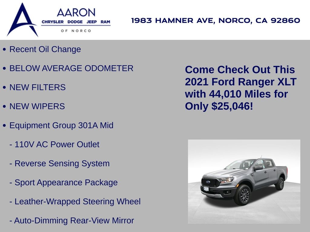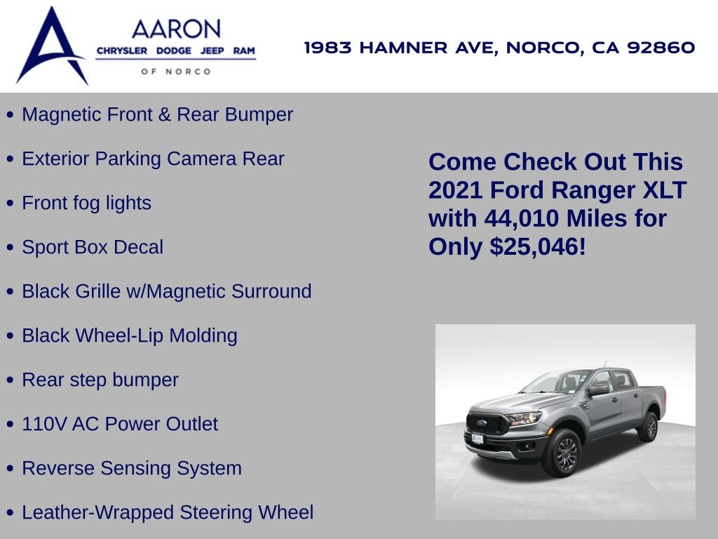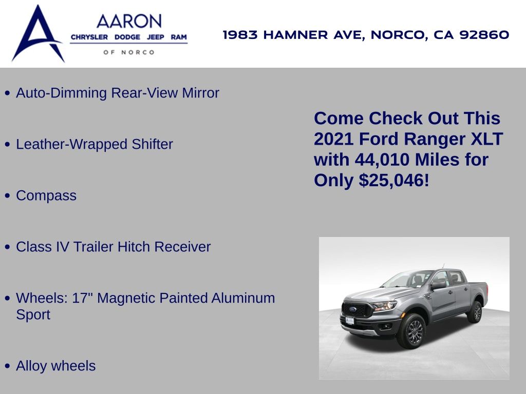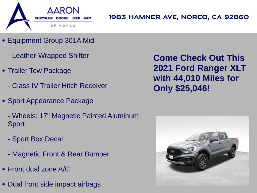 Built for versatility and everyday performance, this 2021 Ford Ranger XLT SuperCrew blends rugged capability with modern comfort and technology. With 44,010 miles, this Carbonized Gray Ranger is powered by a responsive 2.3L EcoBoost engine paired with a smooth 10-speed automatic transmission, delivering strong towing capability and an EPA-estimated 21 MPG city and 26 MPG highway. Equipped with the Trailer Tow Package, Class IV hitch receiver, and 3.73 axle ratio, its ready for work or weekend adventures. The XLT trim with Equipment Group 301A Mid and the Sport Appearance Package adds 17-inch magnetic aluminum sport wheels, premium Ebony cloth front bucket seats, a leather-wrapped steering wheel, black grille with magnetic surround, body-color bumpers, and sport decals for a distinctive look. Inside, youll find features designed for convenience and connectivity, including an 8-inch SYNC 3 touchscreen with Apple CarPlay, Android Auto, SiriusXM, and Bluetooth, plus a premium audio system and FordPass Connect with 4G LTE Wi-Fi hotspot capability. Comfort is enhanced with a power-adjustable drivers seat, dual-zone climate control, and rear under-seat storage, while safety is prioritized with Ford Co-Pilot360, featuring pre-collision assist with automatic emergency braking, lane-keeping system, blind spot information system with cross-traffic alert, a rearview camera, reverse sensing system, and dynamic hitch assist. The exteriors Magnetic front and rear bumpers, black wheel-lip moldings, and fog lamps give it a bold, sporty stance, while the 6,050-lb GVWR and 1,770-lb payload capacity ensure its as capable as it is stylish. Whether youre commuting in comfort or tackling tough jobs, this Ranger XLT delivers the perfect balance of capability, efficiency, and modern features. Come see why its one of the most well-rounded midsize pickups on the market today.