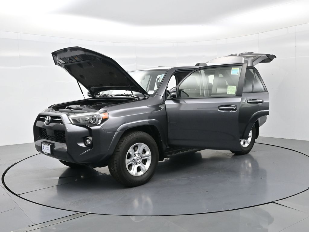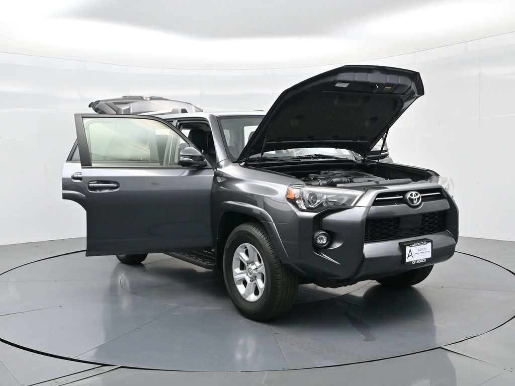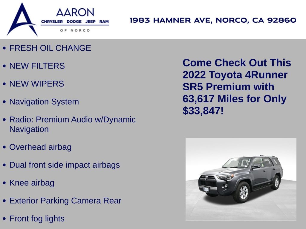 Rugged, reliable, and adventure-ready, this 2022 Toyota 4Runner SR5 Premium delivers legendary off-road capability with everyday comfort and versatility. With 63,617 miles and a clean one-owner Carfax history, this Magnetic Gray Metallic 4Runner is powered by a proven 4.0L DOHC V6 engine paired with a smooth 5-speed automatic transmission, offering dependable performance on highways, trails, and everything in between. Built on a body-on-frame construction for superior durability, it features a robust suspension, 2WD drivetrain, and a Class III towing hitch receiver with a 4- and 7-pin connector for hauling gear or recreational equipment. The SR5 Premium trim adds comfort-focused amenities like SofTex-trimmed heated front seats, an 8-way power-adjustable drivers seat, power moonroof, and a premium audio system with an 8-inch touchscreen, Apple CarPlay, Android Auto, Amazon Alexa, SiriusXM, Bluetooth, and integrated navigation. Safety is well covered with Toyota Safety Sense P, including pre-collision system with pedestrian detection, dynamic radar cruise control, lane departure alert, automatic high beams, blind spot monitor, and rear cross-traffic alert. This example also comes with desirable extras like third-row seating, running boards, all-weather floor liners with cargo tray, and the Preferred Owners Portfolio. Exterior highlights include 17-inch alloy wheels, LED headlights, roof rails, and a power rear window for added versatility. With its spacious interior, configurable seating for passengers and cargo, and Toyotas reputation for long-term reliability, this 4Runner SR5 Premium is equally at home tackling weekend getaways, daily commutes, or extended road trips. Come see why the 4Runner remains a top choice for drivers seeking durability, capability, and comfort in one iconic SUV.