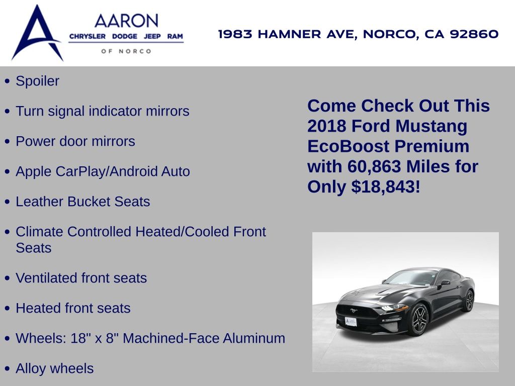 FRESH OIL CHANGE, NEW FILTERS, NEW WIPERS, Mustang EcoBoost Premium, 2D Coupe, EcoBoost 2.3L I4 GTDi DOHC Turbocharged VCT, 10-Speed Automatic, RWD, Alloy wheels, Apple CarPlay/Android Auto, CD player, Climate Controlled Heated/Cooled Front Seats, Equipment Group 200A, Exterior Parking Camera Rear, Front dual zone A/C, Front fog lights, Heated front seats, Knee airbag, Leather Bucket Seats, Overhead airbag, Power door mirrors, Spoiler, Turn signal indicator mirrors, Ventilated front seats, Wheels: 18" x 8" Machined-Face Aluminum.Clean CARFAX.Awards: * 2018 KBB.com 10 Coolest Cars Under $25,000 * 2018 KBB.com 10 Most Awarded Brands * 2018 KBB.com Brand Image Awards