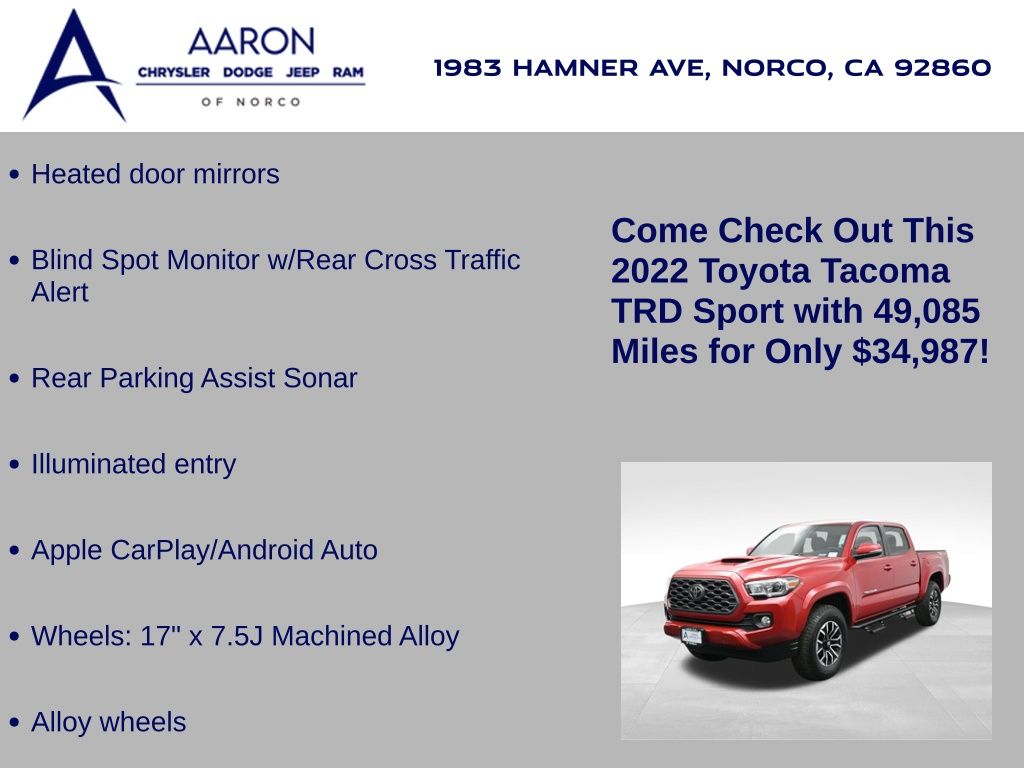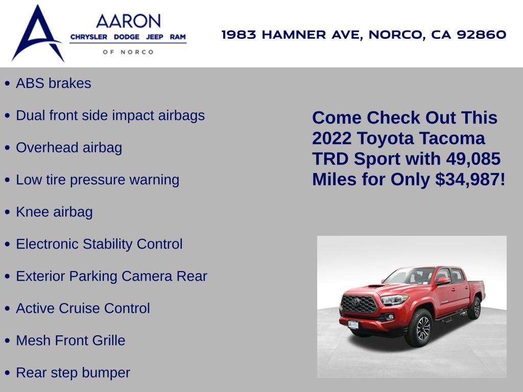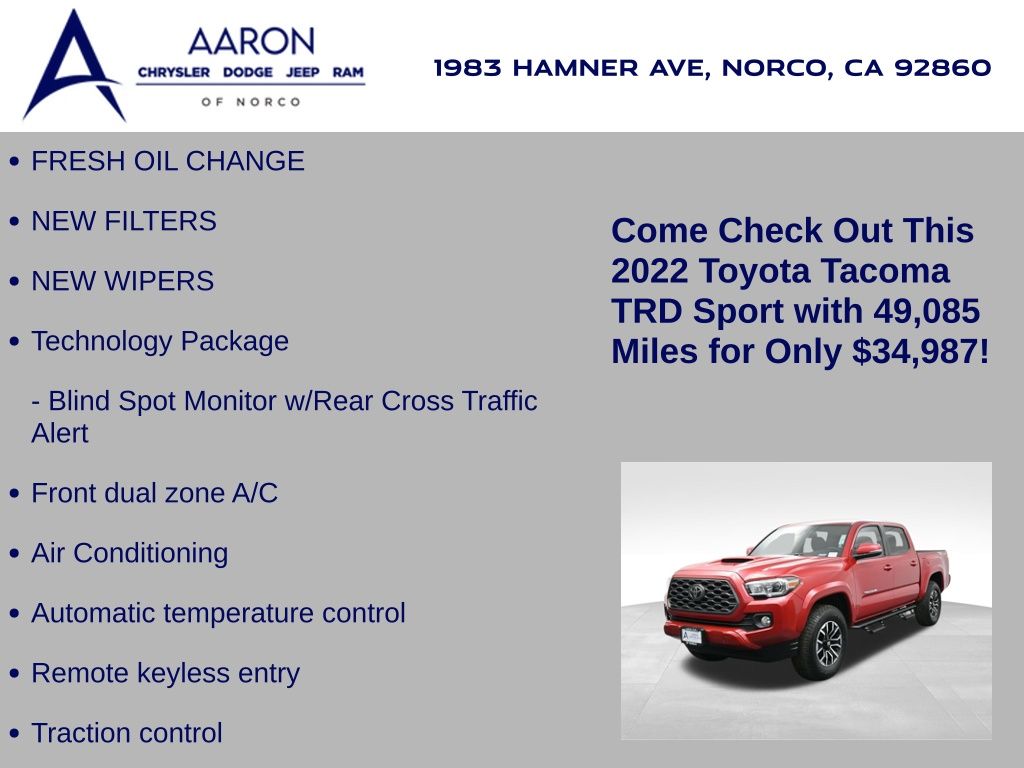 FRESH OIL CHANGE, NEW FILTERS, NEW WIPERS, Tacoma TRD Sport V6, 4D Double Cab, 3.5L V6 PDI DOHC 24V LEV3-ULEV70 278hp, 6-Speed Automatic, RWD, ABS brakes, Active Cruise Control, Air Conditioning, Alloy wheels, Apple CarPlay/Android Auto, Automatic temperature control, Blind Spot Monitor w/Rear Cross Traffic Alert, Dual front side impact airbags, Electronic Stability Control, Exterior Parking Camera Rear, Front dual zone A/C, Heated door mirrors, Illuminated entry, Knee airbag, Low tire pressure warning, Mesh Front Grille, Overhead airbag, Rear Parking Assist Sonar, Rear step bumper, Remote keyless entry, Technology Package, Traction control, Wheels: 17" x 7.5J Machined Alloy.CARFAX One-Owner.