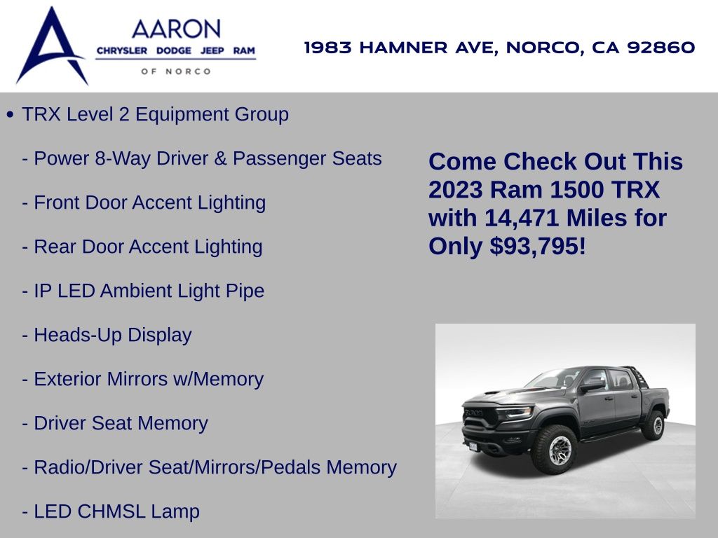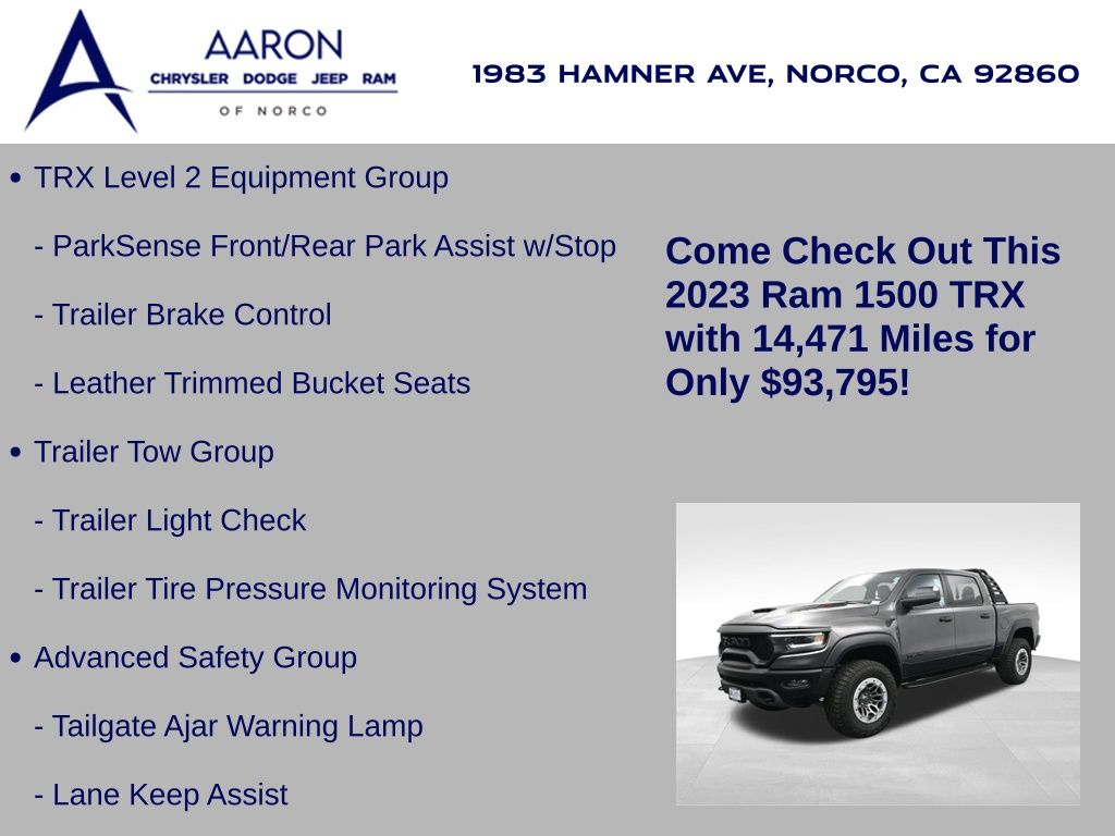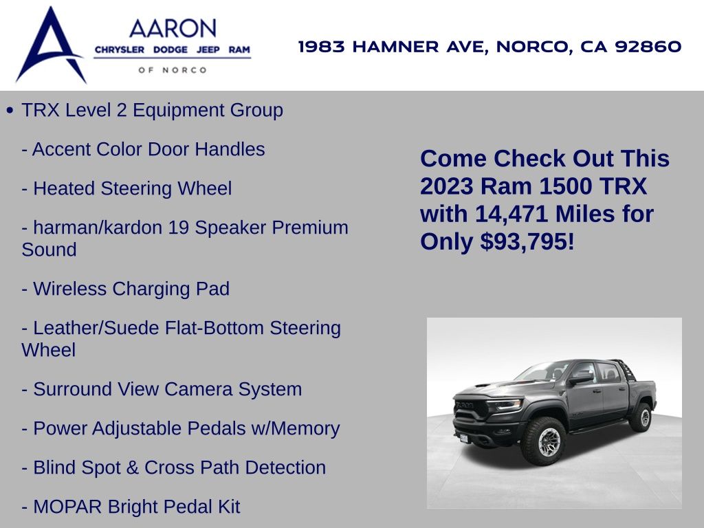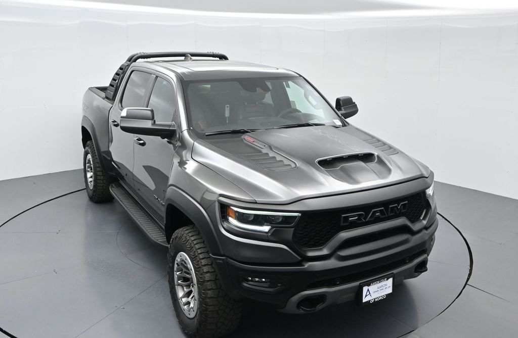 Priced below KBB Fair Purchase Price!FACTORY WARRANTY, FRESH OIL CHANGE, 1500 TRX, 4D Crew Cab, 6.2L Supercharged HEMI V8 SRT, 8-Speed Automatic, 4WD, #2 Seat Foam Cushion, 2-Door Passive Entry, Front Door Locks, 4 Way Front Headrests, Accent Color Door Handles, Adaptive Cruise Control w/Stop & Go, Advanced Safety Group, Bed Utility Group, Blind Spot & Cross Path Detection, Bucket Seats, Center Console Parts Module, Digital Rearview Mirror, Dome Dual LED Reading Lamp, Driver Seat Memory, Driver/Passenger Wrapped Assist Handles, Dual front side impact airbags, Dual-Pane Panoramic Sunroof, Exterior Mirrors w/Memory, Front Door Accent Lighting, Front dual zone A/C, Front fog lights, Front Seat Back Map Pockets, Full Length Premium Upgraded Floor Console, harman/kardon 19 Speaker Premium Sound, Heads-Up Display, Heated Front Seats, Heated Second Row Seats, Heated Steering Wheel, IP LED Ambient Light Pipe, Lane Keep Assist, Leather Trimmed Bucket Seats, Leather/Carbon Flat-Bottom Steering Wheel, Leather/Suede Flat-Bottom Steering Wheel, LED CHMSL Lamp, Luxury Front Door Trim Panel, MOPAR 4 Adjustable Cargo Tie-Down Hooks, MOPAR Bright Pedal Kit, MOPAR Deployable Bed Step, MOPAR Spray In Bedliner, Navigation System, Overhead airbag, ParkSense Front/Rear Park Assist w/Stop, ParkView Rear Back-Up Camera, Pedestrian Emergency Braking, Pick-Up Box Lighting, Power 4-Way Driver Lumbar Adjust, Power 4-Way Passenger Lumbar Adjust, Power 8-Way Driver & Passenger Seats, Power Adjustable Pedals w/Memory, Premium Wrapped IP Bezel, Quick Order Package 29Y, Radio: Uconnect 5 Nav w/12.0" Display, Radio/Driver Seat/Mirrors/Pedals Memory, Rain Sensitive Windshield Wipers, Real Carbon Fiber Interior Accents, Rear 60/40 Folding Seat, Rear 60/40 Folding Split Recline Seat, Rear Door Accent Lighting, Rear Underseat Compartment Storage, Rear Window Defroster, Remote Tailgate Release, Sun Visors w/Illuminated Vanity Mirrors, Surround View Camera System, Tailgate Ajar Warning Lamp, Trailer Brake Control, Trailer Light Check, Trailer Tire Pressure Monitoring System, Trailer Tow Group, TRX Carbon Fiber Package, TRX Level 2 Equipment Group, Universal Garage Door Opener, Ventilated Front Seats, Ventilated Rear Seats, Wireless Charging Pad.Clean CARFAX.CARFAX One-Owner.