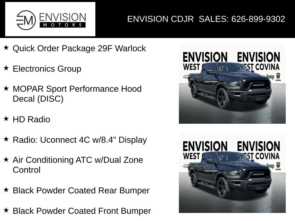 WE SPECIALIZE IN ALL CREDIT PROFILES! See what we can do for you! Call to find out (626) 899-9302.Certified.1-Year SiriusXM Guardian Trial, 8.4" Touchscreen Display, Air Conditioning ATC w/Dual Zone Control, Apple CarPlay, Bi-Function Halogen Projector Headlamps, Black Door Handles, Black Exterior Truck Badging, Black Grille w/RAM Lettering, Black Headlamp Filler Panel, Black Powder Coated Front Bumper, Black Powder Coated Rear Bumper, Black RAM Head Tailgate Badge, Black Wheel Flares, Cluster 7.0" TFT Color Display, Electronics Group, Front Wheel Well Liners, Google Android Auto, HD Radio, Media Hub (2 USB, AUX), MOPAR Sport Performance Hood Decal, MOPAR Sport Performance Hood Decal (DISC), ParkSense Rear Park Assist System, Quick Order Package 29F Warlock, Radio: Uconnect 4C w/8.4" Display, Semi-Gloss Black Hub, Sport Tail Lamps, USB Host Flip, Warlock, Warlock Interior Accents, Wheels: 20" x 9" Semi-Gloss Black Aluminum.Diamond Black Crystal Pearlcoat2021 Ram 1500 Classic Warlock RWD 8-Speed Automatic 3.6L V6 24V VVTFCA US LLC Certified Pre-Owned Details: * Transferable Warranty * Vehicles Up to 75,000 Miles and/or 5 Model Years. 24-Hour Towing & Roadside Assistance, Car Rental Allowance, CARFAX® Vehicle History ReportTM and an Introductory 3-month Subscription to SiriusXM® Satellite Radio & Certified Warranty Upgrades * Roadside Assistance * Powertrain Limited Warranty: 84 Month/100,000 Mile (whichever comes first) from original in-service date * Vehicle History * Warranty Deductible: $100 * Limited Warranty: 3 Month/3,000 Mile (whichever comes first) after new car warranty expires or from certified purchase date * 125 Point Inspection**********All Pricing and Advertised Prices for any/all vehicles offered for sale does not include dealer installed accessories which can be purchased for an additional cost.********** The Factory Rebates may not be available on this vehicle if you elect to take advantage of a Special Alternative APR or Special Lease program. Some Factory Rebates are California Resident specific and may vary for residents of other states. NO sales to Dealers, Brokers or Exporters. For out of state purchase, customers must be present to purchase. If shipping is required, dealership must facilitate; no exceptions. Please contact us for special Multi-Vehicle or Fleet pricing. Prices are plus government fees and taxes, any finance charges, $85 documentary fee, $29 electronic registration fee, any emission testing charge and $1.75 per new tire state tire fee. *** We make every effort to provide accurate information, but please verify before purchasing. Leasing & financing available on approved credit. Trade-ins accepted. Subject to prior sale.