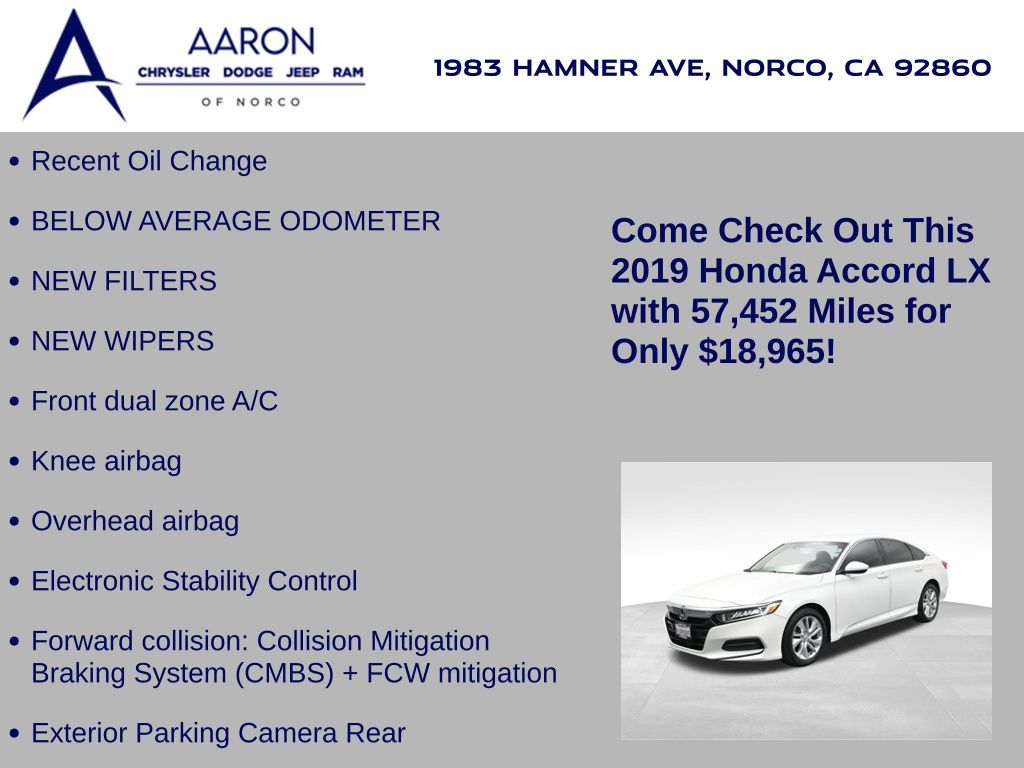 This 2019 Honda Accord LX is a sleek and efficient sedan engineered for reliability, safety, and comfort, making it an excellent choice for those who value both performance and economy. Powered by a responsive 1.5L turbocharged 4-cylinder engine paired with a smooth CVT transmission, it delivers outstanding fuel efficiency with an impressive EPA rating of 30 MPG city and 38 MPG highway. The exterior is finished in Platinum White Pearl and features stylish 17-inch silver-painted alloy wheels, LED headlights with auto on/off, body-colored door handles and side mirrors, a chrome grille, and a compact spare tire mounted inside the trunk for space efficiency. Inside, the Accord boasts a spacious Black cloth interior equipped with an ergonomic and modern layout that includes a multi-angle rearview camera, full power accessories, manual front seat adjustments with height and lumbar support, folding rear seats for added cargo flexibility, and dual-zone automatic climate control. Technology and infotainment features include a 160-watt AM/FM audio system with four speakers, a 7-inch display screen, Bluetooth HandsFreeLink and streaming audio, Pandora compatibility, and USB charging ports, offering intuitive control and seamless smartphone integration. The suite of Honda Sensing driver-assistance features enhances safety with Collision Mitigation Braking System, Road Departure Mitigation, Adaptive Cruise Control, Lane Keeping Assist System, and Forward Collision Warning, all contributing to a confident driving experience. Additional highlights include automatic high-beam headlights, LED daytime running lights, electronic brake distribution, and SmartVent side airbags. With only 57,452 miles on the odometer, this Accord is backed by a strong history of regular maintenance and holds multiple accolades including the JD Power Automotive Performance, Execution and Layout (APEAL) Study award and the ALG Residual Value Award, both recognizing it for excellence in long-term value and owner satisfaction. This model offers an ideal blend of fuel economy, advanced safety technologies, comfort, and enduring resale value. Contact us today for more details or to schedule a test drive.