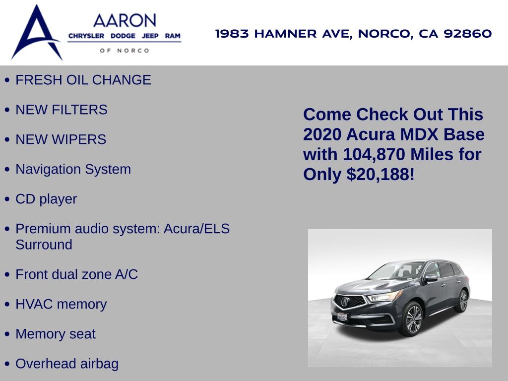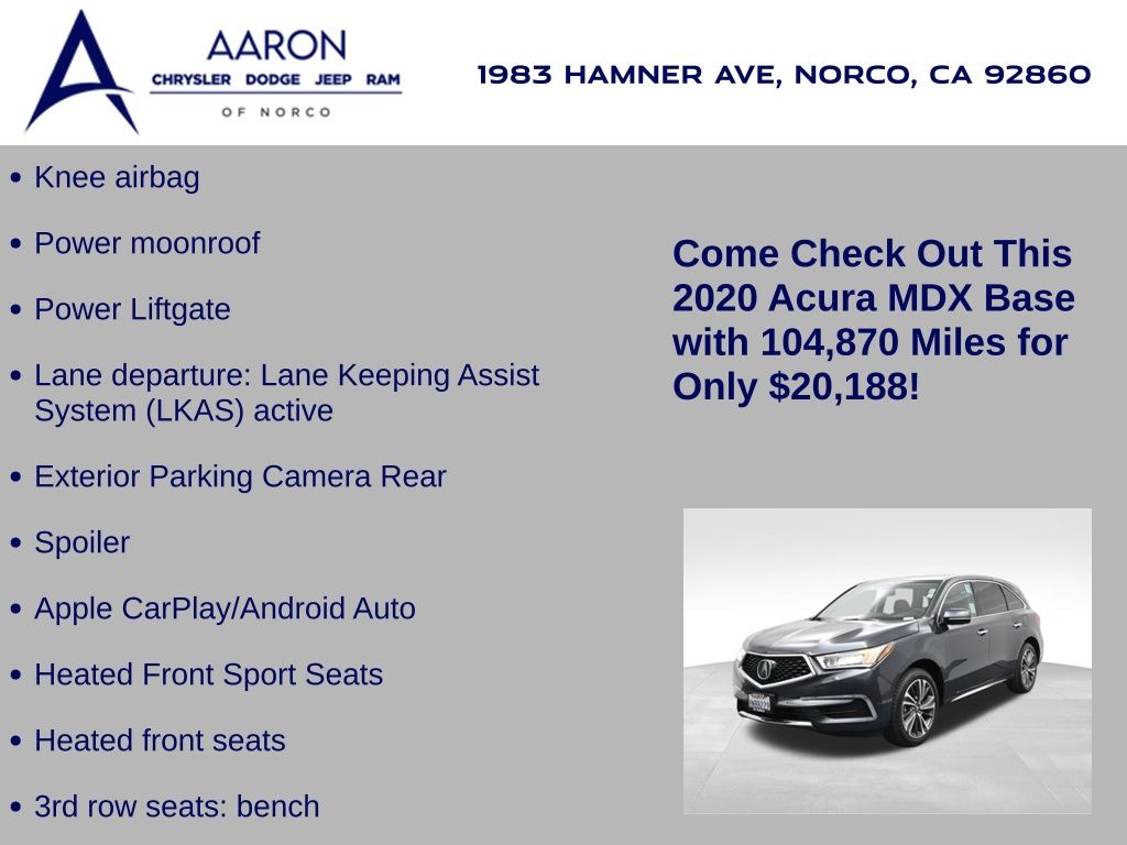 Blending premium craftsmanship, advanced technology, and versatile performance, this 2020 Acura MDX with Technology Package offers luxury SUV refinement with family-friendly functionality. With 104,870 miles, this Gunmetal Metallic MDX is powered by a 3.5L SOHC i-VTEC V6 engine paired with a 9-speed automatic transmission, delivering smooth, responsive power and an EPA-estimated 20 MPG city and 27 MPG highway. The Technology Package adds an upgraded navigation system, ELS Studio premium audio with 10 speakers, HD Radio, blind spot information system, rear cross-traffic monitor, and 20-inch aluminum-alloy wheels for an upscale presence. Inside, the Ebony leather-trimmed cabin seats up to seven with heated front sport seats offering 12-way power adjustment, a power moonroof, tri-zone automatic climate control, and a power tilt/telescoping steering column. The infotainment system includes an 8-inch upper display, 7-inch touch screen, Apple CarPlay, Android Auto, Bluetooth streaming, SiriusXM, and AcuraLink connected services. Safety is comprehensive with Collision Mitigation Braking System, adaptive cruise control, lane keeping assist, road departure mitigation, forward collision warning, and a multi-view rear camera. Additional conveniences include keyless access with push-button start, a power liftgate, second-row sunshades, and multiple USB ports. With its blend of luxury, technology, and proven reliability, this MDX is equally suited for daily commuting, family road trips, or weekend adventures. Visit us today to experience why the Acura MDX remains one of the most respected midsize luxury SUVs on the market.