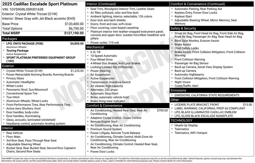 FACTORY WARRANTY, BELOW AVERAGE ODOMETER, FRESH OIL CHANGE, NEW FILTERS, NEW WIPERS, Escalade Sport Platinum, 4D Sport Utility, 6.2L V8, 10-Speed Automatic, 4WD, Sheer Gray w/Jet Black Accents w/Full Semi-Aniline Leather Seats w/Faceted Quilt, 3rd row seats: split-bench, Air Ride Adaptive Suspension, AKG Studio Reference 36-Speaker Audio System, Alloy wheels, Apple CarPlay/Android Auto, Black Illuminated Cadillac Emblem (LPO), Dual front side impact airbags, Exterior Parking Camera Rear, Front dual zone A/C, Genuine wood console insert, Genuine wood dashboard insert, Genuine wood door panel insert, Glass Breakage Sensor, Gloss Black Escalade Nameplate (LPO), Headphones, Heads-Up Display, Heated front seats, Heated rear seats, Knee airbag, Lane Departure Warning System, Memory seat, Navigation System, Night Vision, Night vision lights, Onyx Package (LPO), Overhead airbag, Power Liftgate, Power moonroof, Power Open/Close Doors, Power Panoramic Tilt-Sliding Sunroof, Rear Seat Entertainment System, Soft Closing Front & Rear Doors, Spoiler, Touring Package, Ventilated front seats, Wheel Locks, Wheels: 24" Black Alloy (LPO), Wheels: 24" Transit (LPO).Clean CARFAX.CARFAX One-Owner.