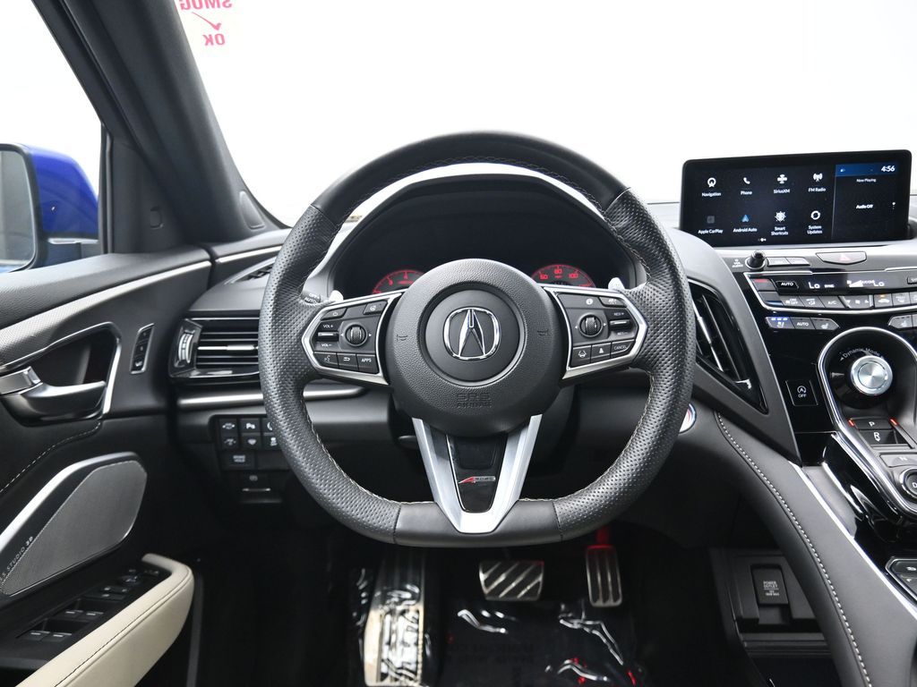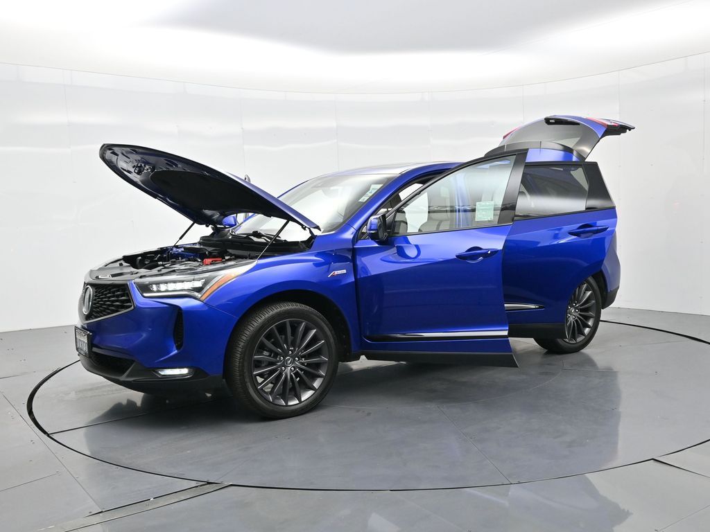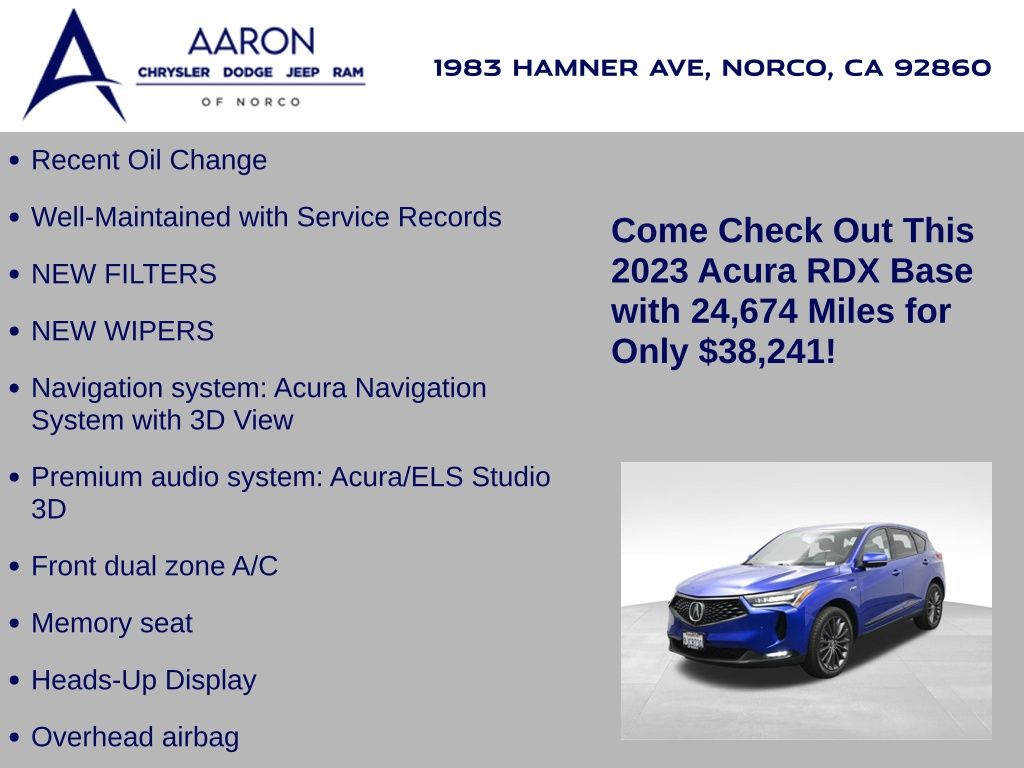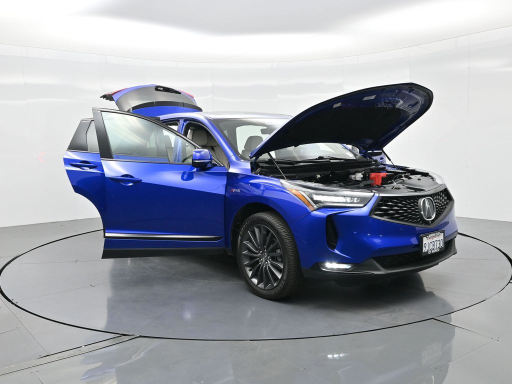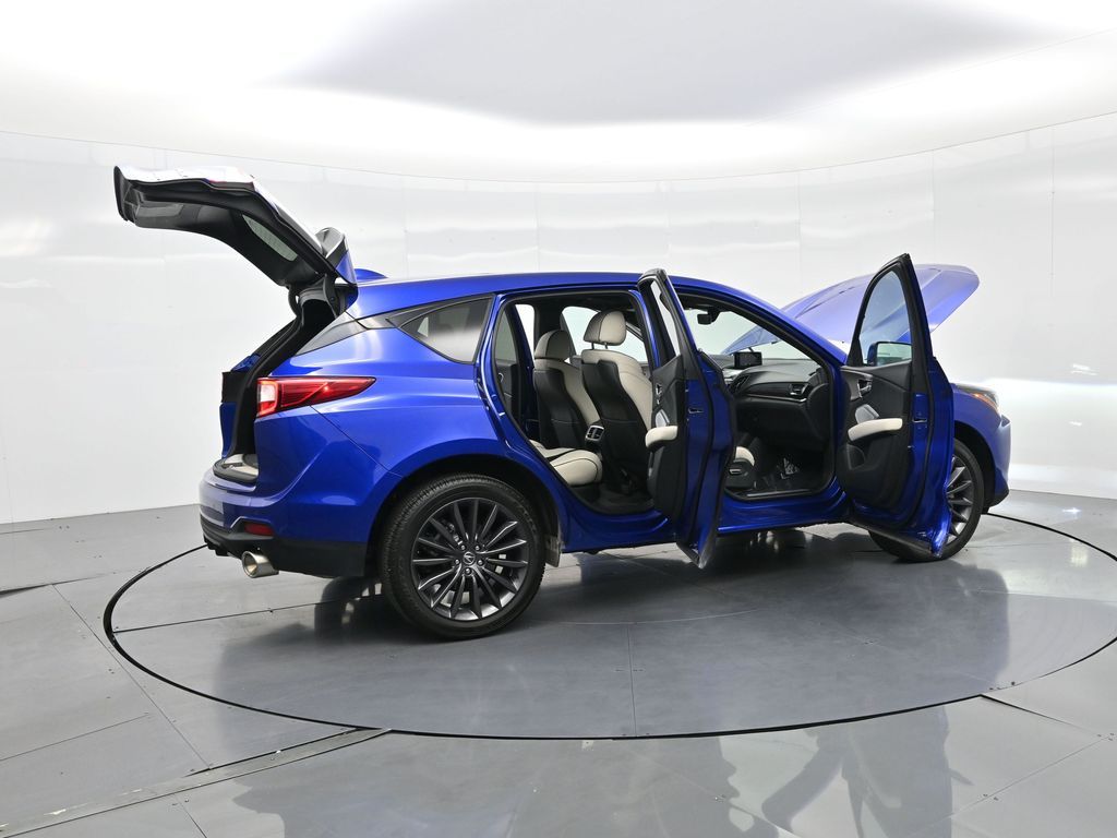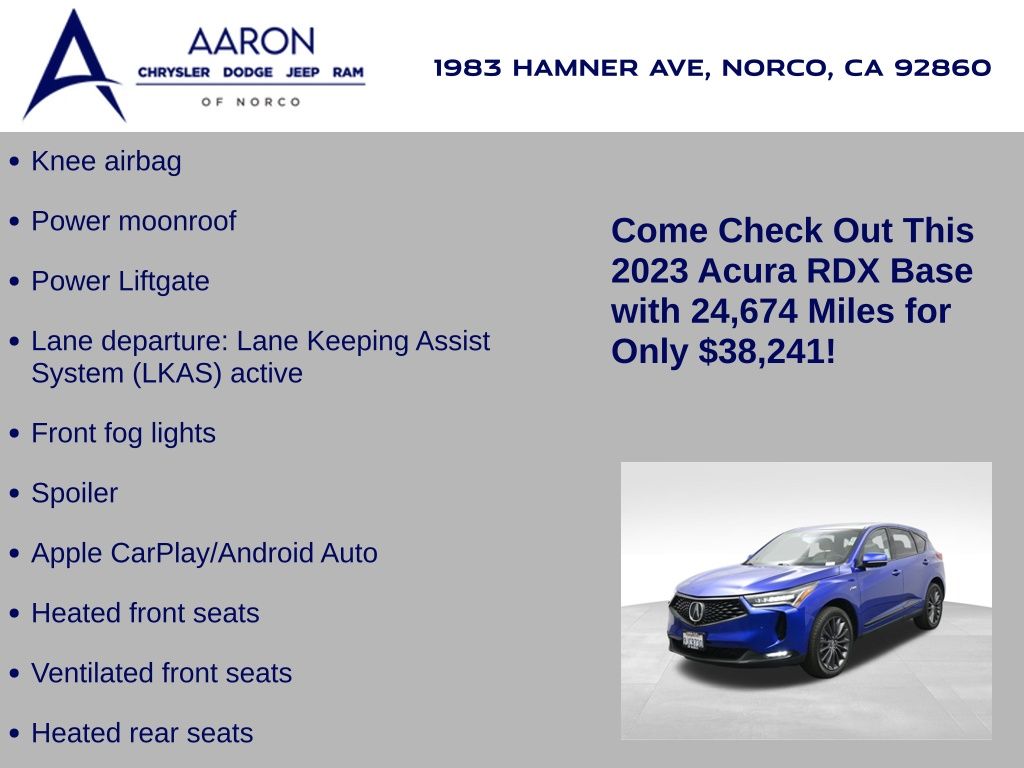 Sophisticated, athletic, and designed with premium performance in mind, this 2023 Acura RDX SH-AWD with Advance and A-Spec Packages offers dynamic driving and upscale refinement, finished in Apex Blue Pearl over a stunning Orchid leather interior and showing only 24,674 miles. Powered by a 2.0 liter VTEC turbocharged engine mated to a smooth 10 speed automatic transmission and torque vectoring Super Handling All Wheel Drive, this luxury SUV delivers 272 horsepower and responsive handling with confidence in any road condition. The Advance Package provides high end features such as heated and ventilated 16 way power front seats, perforated Milano leather upholstery, adaptive dampers, ambient lighting, remote start, acoustic front glass, rain sensing wipers, and a hands free power lift-gate. The A-Spec Package adds aggressive styling touches including 20 inch Shark Gray alloy wheels, gloss black trim accents, sporty interior finishes, and a flat bottom leather wrapped steering wheel with contrast stitching and aluminum pedals. Inside the cabin, technology is front and center with a full color head up display, 10.2 inch center display with True Touchpad Interface, built in navigation, wireless Apple CarPlay and Android Auto, ELS Studio 3D 16 speaker premium audio, and a surround view camera system. Additional tech features include AcuraLink with real time traffic, USB and wireless charging, Alexa built in, Wi-Fi hotspot capability, and HD radio. Safety and driver assistance are comprehensive with AcuraWatch suite including collision mitigation braking, adaptive cruise control with low speed follow, lane keep assist, blind spot information, rear cross traffic monitor, traffic jam assist, and rear parking sensors. This one owner personal lease vehicle is backed by a clean Carfax and strong service history, offering near new condition and remaining factory warranty. With its blend of sharp design, cutting edge technology, and exceptional build quality, this 2023 RDX A-Spec Advance is a luxury crossover built for drivers who demand excitement and refinement in equal measure. Schedule a test drive today and experience why Acura continues to set the standard for precision crafted performance.