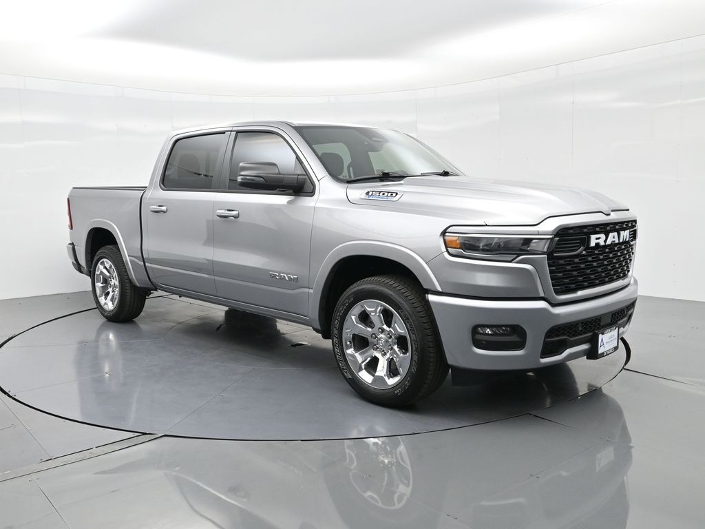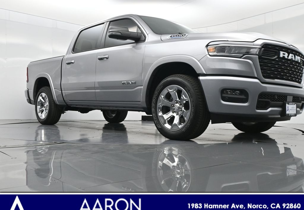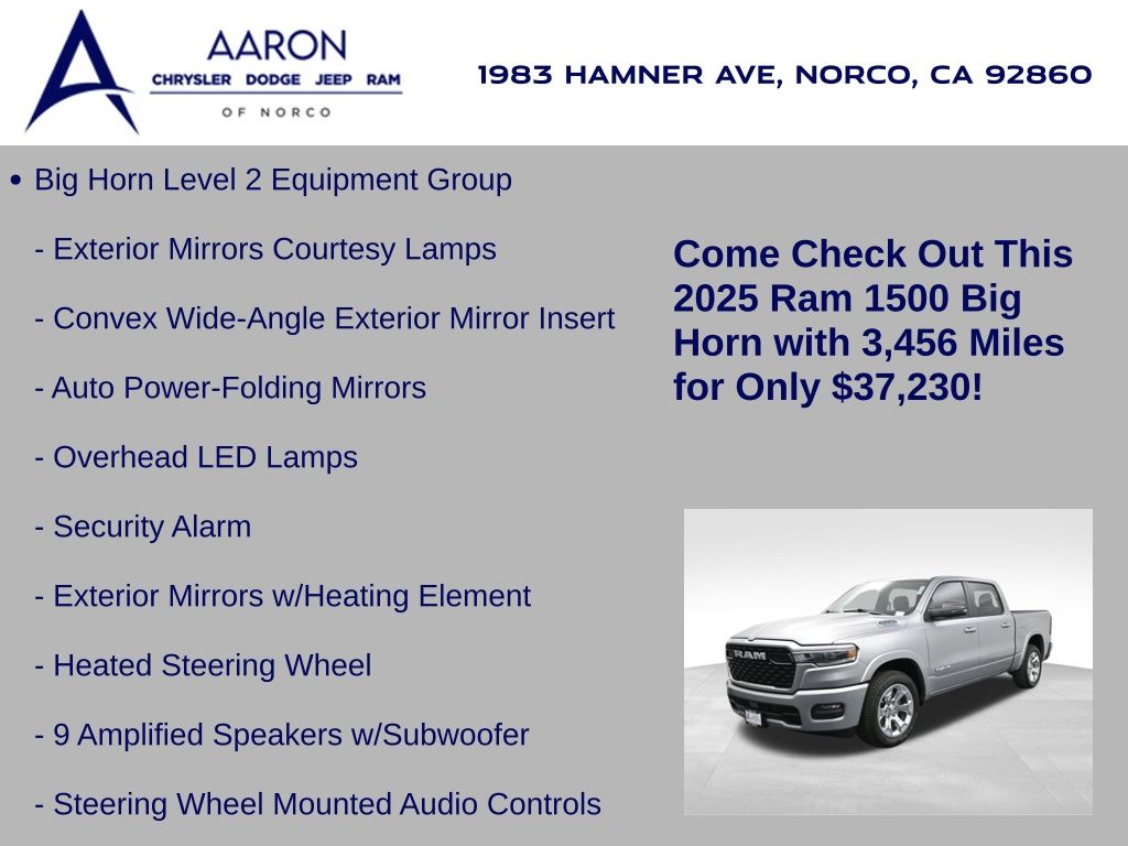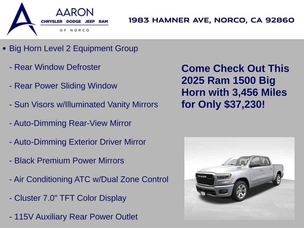 Introducing the bold and refined 2025 Ram 1500 Big Horn Crew Cab 4x2, an exceptionally well-equipped full-size pickup with just 3,456 miles and a spotless 1-owner Carfax history. Powered by the proven 3.6L Pentastar V6 engine with eTorque and paired to a smooth 8-speed automatic transmission, this Ram delivers confident everyday performance with efficiency and reliability. Designed for versatility and comfort, it offers an impressive EPA-estimated 20 MPG city / 25 MPG highway, making it a smart choice for both work and weekend driving. The striking Billet Silver Metallic Clear-Coat exterior is complemented by the optional Sport Appearance Package and Black Interior Accents, giving it a confident and modern stance. Inside, the Big Horn impresses with its spacious Deluxe Cloth Bucket Seat cabin and loaded tech including the upgraded Uconnect 5 NAV system with massive 12-inch touchscreen, wireless Apple CarPlay/Android Auto, integrated navigation, voice command, and SiriusXM 360L with 3-month trial subscription. Stay connected and in control with the 7-inch full-color digital driver display, 115V auxiliary power outlet, and dual-zone auto climate control. Convenience features include remote start, power-sliding rear window, automatic-dimming rearview mirror, and rear under-seat storage bins, while the Heated Front Seats, Heated Steering Wheel, and 8-way Power Driver Seat elevate comfort on colder mornings. This truck is also equipped with the Big Horn Level 2 Equipment Group, bundling advanced driver aids like ParkSense Front & Rear Park-Assist, ParkView Backup Camera, Blind Spot and Cross-Path Detection, and Full-Speed Forward-Collision Warning Plus. Outside, this Ram rides on premium 20-inch polished aluminum wheels with all-season tires, features automatic LED headlamps, chrome grille surround, power-folding heated mirrors, and a factory spray-in bed-liner with a Class IV receiver hitch for towing confidence. The 2025 Ram 1500 Big Horn sets the benchmark for comfort, technology, and performance in a rear-wheel-drive configuration thats ready for everyday driving or weekend towing. Backed by a 5-year/60,000-mile Powertrain Warranty and built for those who demand strength with style, this low-mileage Ram offers unbeatable value and modern capability. Contact us today to schedule a test drive or secure this like-new Big Horn before its gone. Premium full-size pickups in this condition and price point don't last long!