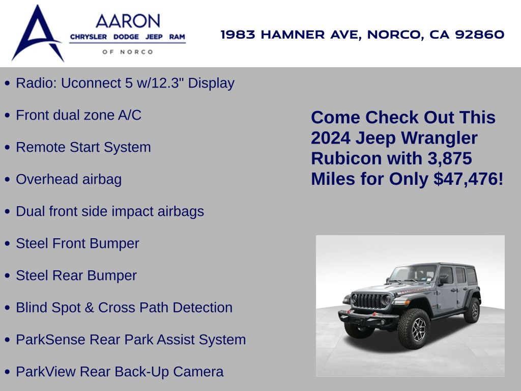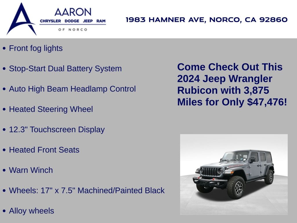 Priced below KBB Fair Purchase Price!FACTORY WARRANTY, BELOW AVERAGE ODOMETER, FRESH OIL CHANGE, NEW FILTERS, NEW WIPERS, Wrangler Rubicon, 4D Sport Utility, 8-Speed Automatic, 4WD, 12.3" Touchscreen Display, Alloy wheels, Apple CarPlay, Auto High Beam Headlamp Control, Blind Spot & Cross Path Detection, Capability Package, Convenience Group, Dual front side impact airbags, Front dual zone A/C, Front fog lights, Google Android Auto, Heated Front Seats, Heated Steering Wheel, Overhead airbag, ParkSense Rear Park Assist System, ParkView Rear Back-Up Camera, Quick Order Package 24R Rubicon, Radio: Uconnect 5 w/12.3" Display, Remote Start System, Safety Group, Steel Front Bumper, Steel Rear Bumper, Stop-Start Dual Battery System, Warn Winch, Wheels: 17" x 7.5" Machined/Painted Black.Clean CARFAX.