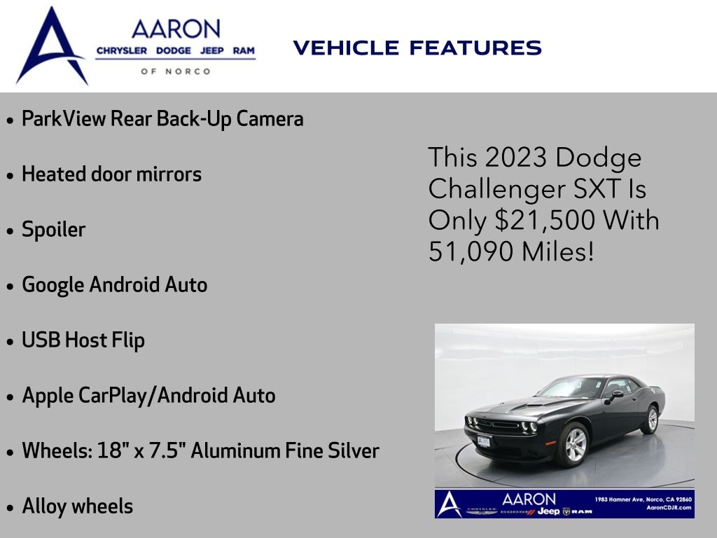 Own the road in unmistakable style with this 2023 Dodge Challenger SXT, a modern American muscle icon that blends bold design with refined technology and everyday drivability. With just 51,090 miles and a clean Carfax history showing 1-owner status, no accidents, and consistent service records, this coupe delivers outstanding value and peace of mind. Under the hood lies a responsive 3.6L Pentastar V6 engine paired to a TorqueFlite 8-speed automatic transmission, providing thrilling rear-wheel-drive performance with an EPA-estimated 19 MPG city and 30 MPG highwayan excellent balance of power and efficiency for a vehicle in its class. Finished in classic Pitch Black Clear-Coat, this Challenger commands presence with its Satin Chrome grille, dual bright exhaust tips, projector headlamps, and 18x7.5-inch aluminum fine silver wheels wrapped in all-season performance tires. Step inside the spacious and driver-focused cabin finished in Black Cloth Performance Seating, and youll find premium comfort and intuitive tech features like the Uconnect 4 system with 7-inch touchscreen, Apple CarPlay, Android Auto, Bluetooth, integrated voice command, and a 276-watt Alpine premium sound system with 6 speakers. Additional highlights include dual-zone automatic climate control, sport suspension, sport mode, push-button start, keyless entry, tilt/telescoping steering wheel, illuminated cupholders, and a leather-wrapped steering wheel with audio controls. Safety is built in with ParkView rear backup camera, electronic stability control, brake assist, all-speed traction control, and Hill-Start Assist. This Challenger also features the Customer Preferred Package 2EA, a compact spare tire, and a 6-month trial of SiriusXM with 360L, ensuring you stay entertained and connected wherever the road leads. Backed by Dodges 5-year/60,000-mile Powertrain Warranty, this vehicle offers iconic design, thrilling performance, and dependable engineering at a tremendous value. Whether you're a first-time buyer looking to step into the performance world or a muscle car enthusiast seeking a clean and well-equipped daily driver, this Challenger SXT checks all the boxes. Don't wait. Inventory like this moves fast. Contact us today to schedule your test drive or reserve this powerhouse before its gone!