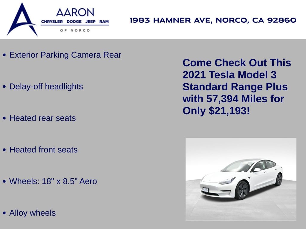 Priced below KBB Fair Purchase Price!NEW FILTERS, NEW WIPERS, Model 3 Standard Range Plus, 4D Sedan, Electric Motor, 1-Speed Automatic, RWD, Alloy wheels, Delay-off headlights, Dual front side impact airbags, Exterior Parking Camera Rear, Front dual zone A/C, Heated front seats, Heated rear seats, Knee airbag, Lane Departure Warning System, Memory seat, Navigation System, Overhead airbag, Radio: Upgraded Audio System, Wheels: 18" x 8.5" Aero.CARFAX One-Owner.