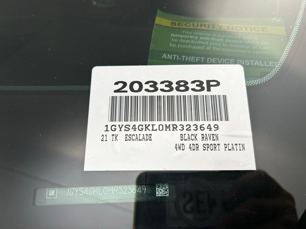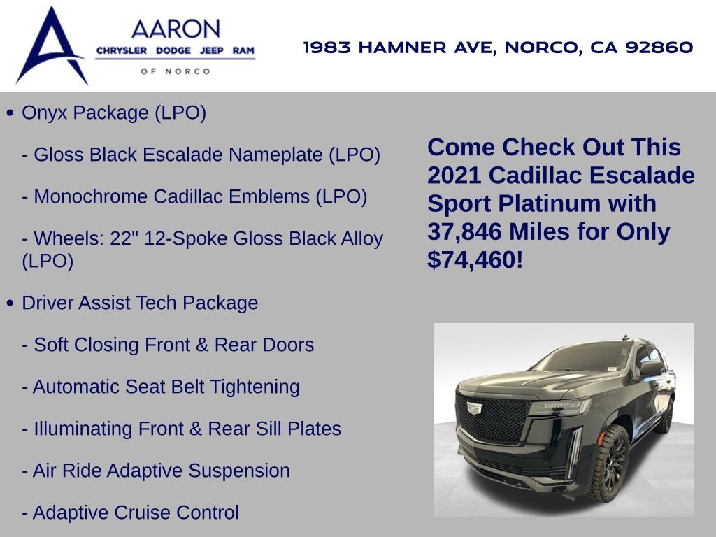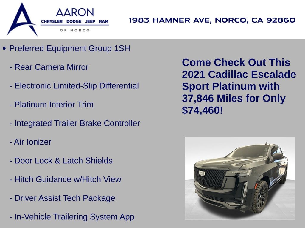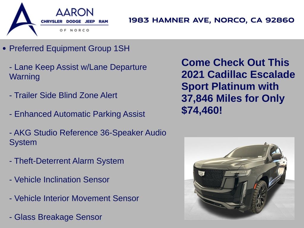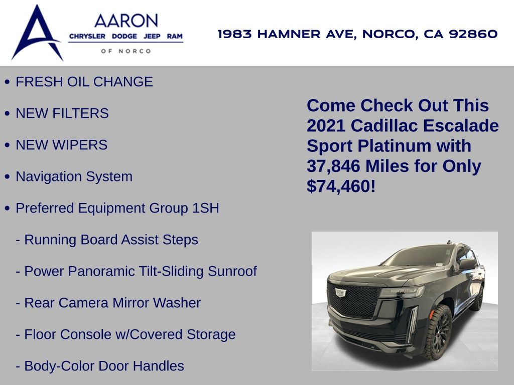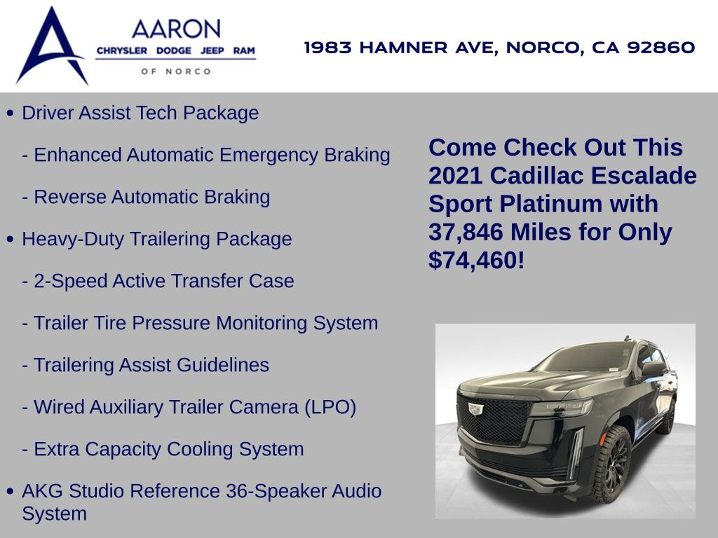 Priced below KBB Fair Purchase Price!FRESH OIL CHANGE, NEW FILTERS, NEW WIPERS, Escalade Sport Platinum, 4D Sport Utility, 6.2L V8, 10-Speed Automatic with Overdrive, 4WD, 2-Speed Active Transfer Case, 3rd row seats: split-bench, A/V remote, Adaptive Cruise Control, Air Ionizer, Air Ride Adaptive Suspension, AKG Studio Reference 36-Speaker Audio System, Alloy wheels, Automatic Seat Belt Tightening, Body-Color Door Handles, Door Lock & Latch Shields, Driver Assist Tech Package, Dual front side impact airbags, Electronic Limited-Slip Differential, Enhanced Automatic Emergency Braking, Enhanced Automatic Parking Assist, Extra Capacity Cooling System, Floor Console w/Covered Storage, Front dual zone A/C, Glass Breakage Sensor, Gloss Black Escalade Nameplate (LPO), Headphones, Heated Driver & Front Passenger Seats, Heated rear seats, Heavy-Duty Trailering Package, Hitch Guidance w/Hitch View, Illuminating Front & Rear Sill Plates, In-Vehicle Trailering System App, Integrated Trailer Brake Controller, Lane Keep Assist w/Lane Departure Warning, Memory seat, Monochrome Cadillac Emblems (LPO), Navigation System, Onyx Package (LPO), Overhead airbag, Platinum Interior Trim, Power driver seat, Power Liftgate, Power moonroof, Power Panoramic Tilt-Sliding Sunroof, Preferred Equipment Group 1SH, Rear Camera Mirror, Rear Camera Mirror Washer, Rear Cross Traffic Alert, Rear Seat Entertainment System, Reconfigurable Full-Color Head-Up Display, Reverse Automatic Braking, Running Board Assist Steps, Soft Closing Front & Rear Doors, Theft-Deterrent Alarm System, Trailer Side Blind Zone Alert, Trailer Tire Pressure Monitoring System, Trailering Assist Guidelines, Vehicle Inclination Sensor, Vehicle Interior Movement Sensor, Ventilated front seats, Wheels: 22" 12-Spoke Gloss Black Alloy (LPO), Wheels: 22" Interim (LPO), Wired Auxiliary Trailer Camera (LPO).CARFAX One-Owner.Awards: * ALG Residual Value