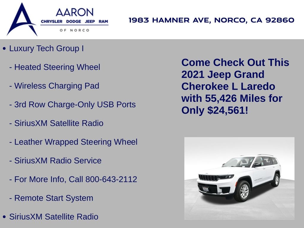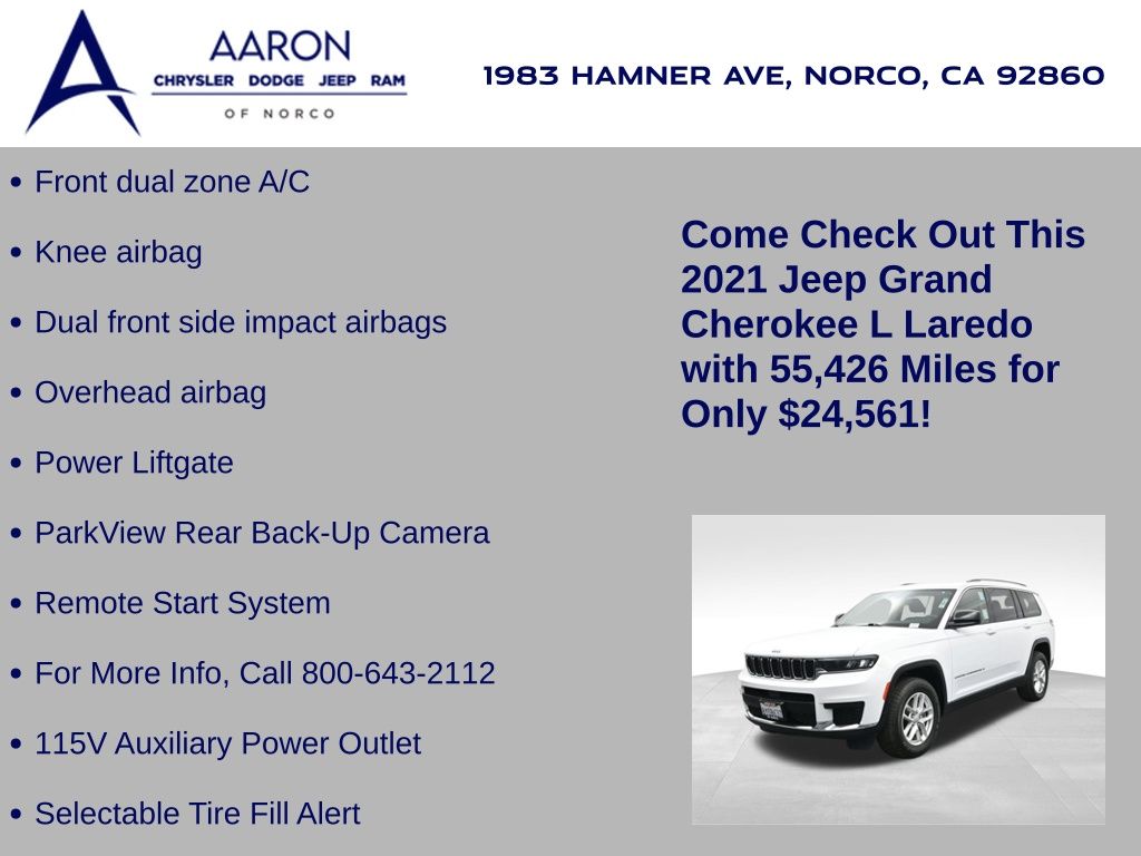 Priced below KBB Fair Purchase Price!FRESH OIL CHANGE, NEW FILTERS, NEW WIPERS, Grand Cherokee L Laredo, 4D Sport Utility, 3.6L V6 24V VVT, 8-Speed Automatic, RWD, 115V Auxiliary Power Outlet, 3rd Row Charge-Only USB Ports, Alloy wheels, Dual front side impact airbags, For More Info, Call 800-643-2112, Front dual zone A/C, Heated Front Seats, Heated Steering Wheel, Knee airbag, Leather Wrapped Steering Wheel, Luxury Tech Group I, Overhead airbag, ParkView Rear Back-Up Camera, Power Liftgate, Quick Order Package 22A, Rain Sensitive Windshield Wipers, Remote Start System, Selectable Tire Fill Alert, SiriusXM Radio Service, SiriusXM Satellite Radio, Wheels: 18" x 8.0" Fully Painted Aluminum, Wireless Charging Pad.Clean CARFAX.CARFAX One-Owner.