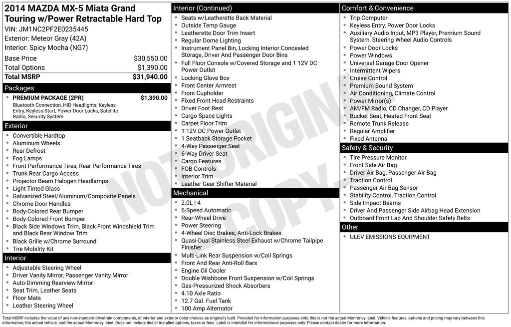 Meteor Gray 2014 Mazda Miata PRHT Grand Touring RWD 6-Speed Automatic Sport 2.0L I4 DOHC VVT 16V Spicy Mocha Leather, 17" x 7" Silver Aluminum Alloy Wheels, Anti-Theft Alarm, Bluetooth® Hands-Free Phone System, Convertible HardTop, Mazda Advanced Keyless Entry System, Premium Package, SIRIUS Satellite Radio, Xenon Headlights.Recent Arrival! Odometer is 45933 miles below market average! 21/28 City/Highway MPGAwards: * 2014 KBB.com 5-Year Cost to Own AwardsReviews: * If you’ve wanted a small, light, 2-seat roadster in the traditional front-engine, rear-drive layout and with more grins per mile than a load of monkeys who have raided the liquor cabinet, there is no better choice than the MX-5 Miata. Source: KBB.com