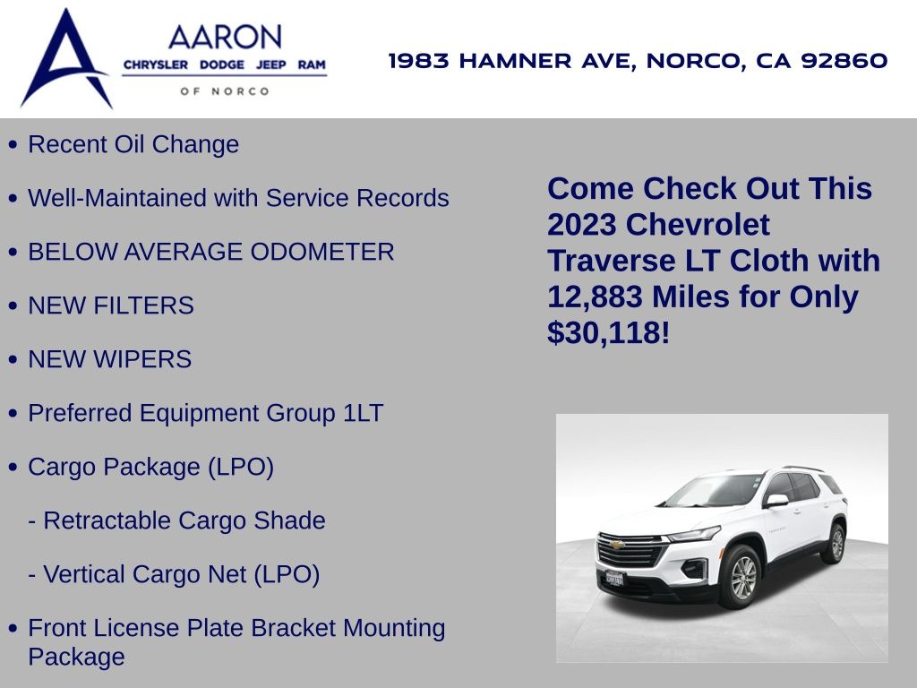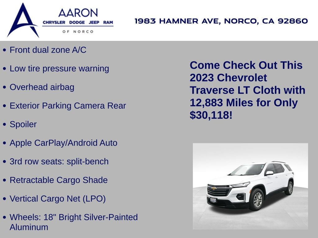 Experience the perfect blend of spacious comfort, family-focused versatility, and smart safety in this 2023 Chevrolet Traverse LT Cloth FWD, a well-equipped midsize SUV with only 12,883 miles and a spotless 1-owner Carfax that shows no accidents, personal lease use, and consistent oil change history. Powered by a responsive 3.6L V6 engine mated to a smooth 9-speed automatic transmission, the Traverse offers confident acceleration and solid efficiency, returning an EPA-estimated 18 MPG city and 27 MPG highway. Finished in clean Summit White with a stylish Jet Black interior, this 8-passenger SUV is designed with growing families in mind. Inside, you'll find premium features such as tri-zone automatic climate control, wireless Apple CarPlay and Android Auto, Chevrolet Infotainment 3 with 7-inch touchscreen, Bluetooth audio streaming, and wireless phone charging, all working together to keep everyone connected and comfortable. Comfort upgrades include a power driver seat with lumbar support, second-row 60/40 split-folding bench seat, and manual fold-flat third row, giving you flexible cargo and seating solutions for every outing. Safety is a top priority with Chevrolet's comprehensive Safety Assist Suite, which includes Forward Collision Alert, Automatic Emergency Braking, Lane Keep Assist with Lane Departure Warning, Front Pedestrian Braking, Following Distance Indicator, and IntelliBeam auto high beams. Additional conveniences include LED headlamps and taillamps, roof rails, power outside mirrors with turn signal indicators, Teen Driver technology, and Rear Cross Traffic Alert with Lane Change Alert and Side Blind Zone Alert. This Traverse also includes dealer-installed vertical cargo net, cargo shade, and seats up to eight passengers in total comfort. Making it the ideal choice for daily commuting, carpool duty, or road trip adventures. Backed by Chevrolets 5-year/60,000-mile powertrain warranty and 3-year/36,000-mile bumper-to-bumper limited warranty, this Traverse LT represents unbeatable value, modern capability, and peace of mind in one smartly designed SUV. Don't miss your chance to drive away in this low-mileage, family-ready Traverse. Contact us today and see why it's one of the most trusted names in the midsize SUV segment.