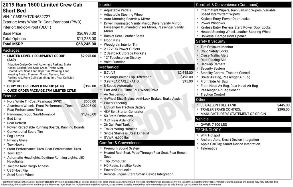 FRESH OIL CHANGE, NEW FILTERS, NEW WIPERS, 1500 Limited, 4D Crew Cab, HEMI 5.7L V8 Multi Displacement VVT, 8-Speed Automatic, 4WD, Adaptive Cruise Control w/Stop & Go, Advanced Brake Assist, Apple CarPlay/Android Auto, Body Color Bumper Group, Body Color Front Bumper, Body Color Rear Bumper w/Step Pads, Dome Dual LED Reading Lamp, Dual front side impact airbags, Dual-Pane Panoramic Sunroof, Front dual zone A/C, Front fog lights, Full Speed Forward Collision Warning Plus, GPS Antenna Input, GPS Navigation, harman/kardon 19 Speaker Premium Sound, Lane Keep Assist, LED Dome/Reading Lamp, Limited Level 1 Equipment Group, Memory seat, Navigation System, Overhead airbag, Parallel & Perp Park Assist w/Stop, Pedal memory, Quick Order Package 27M Limited, Rear step bumper, Remote CD player, USB Host Flip, Ventilated Rear Seats.Awards: * Motor Trend Automobiles of the year * 2019 KBB.com 10 Best Road Trip Cars * NACTOY 2019 North American Truck of the Year * 2019 KBB.com Best Auto Tech Awards * 2019 KBB.com 10 Favorite New-for-2019 Cars