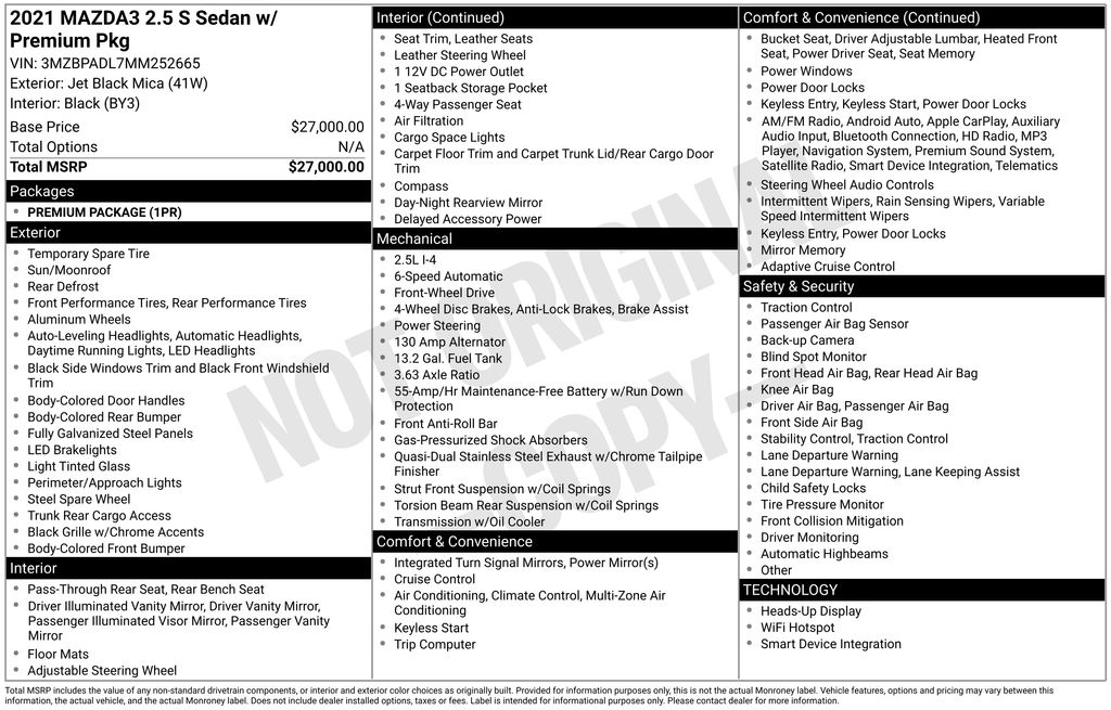 Jet Black Mica 2021 Mazda Mazda3 Premium FWD 6-Speed Automatic I4 AppLink/Apple CarPlay and Android Auto, Exterior Parking Camera Rear, Heated Front Sport Seats, Leather Seat Trim, Navigation System, Power moonroof, Premium Package, Wheels: 18" x 7J Bright Finish Alloy.26/35 City/Highway MPG