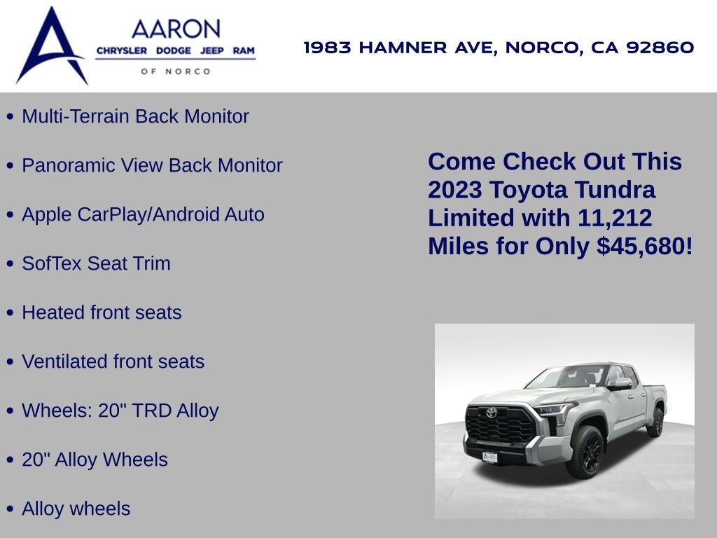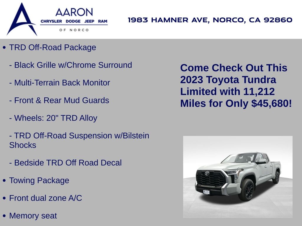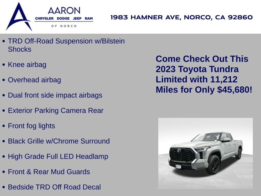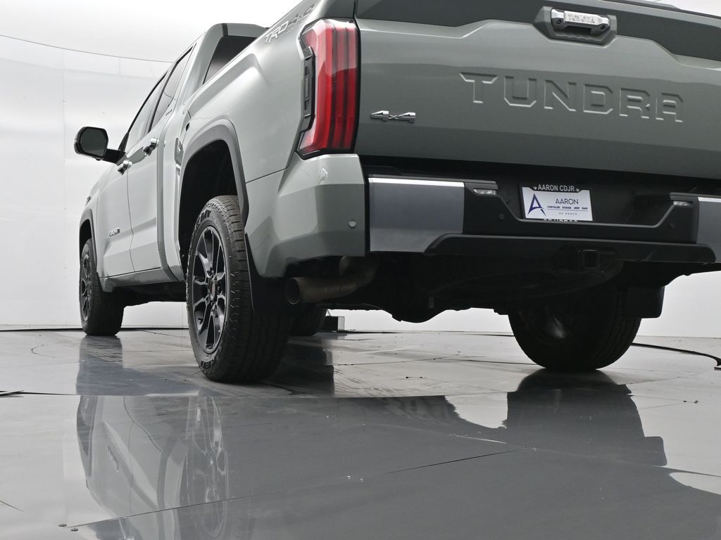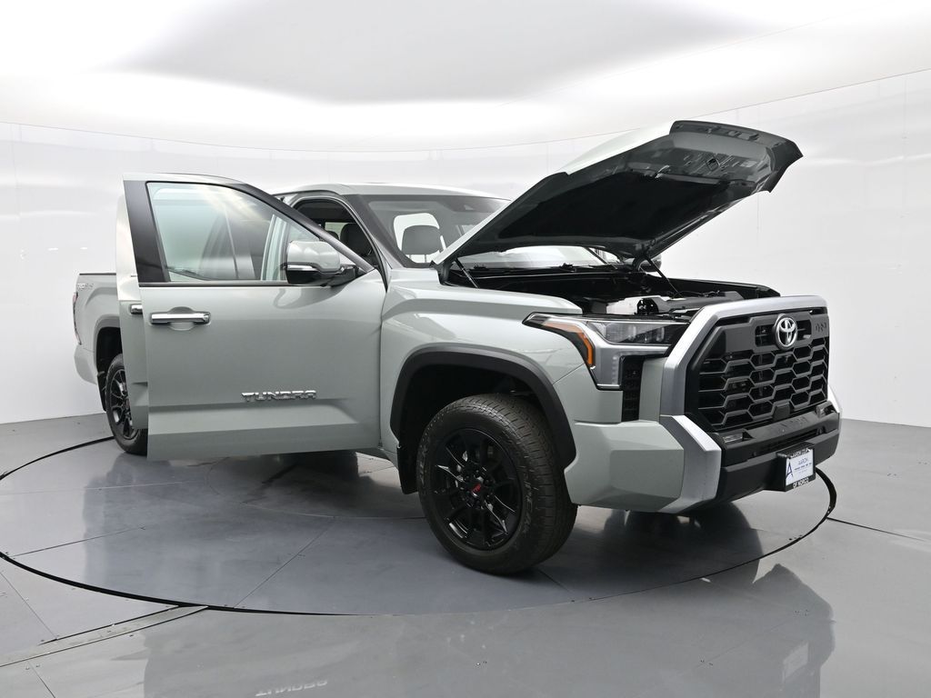 Built to lead with strength, comfort, and cutting-edge technology, this 2023 Toyota Tundra Limited 4x4 CrewMax is a powerhouse full-size pickup engineered for both hard work and premium daily driving. With only 11,212 miles and one previous owner, this well-equipped truck blends low-mileage value with the confidence of Toyotas engineering legacy. Powered by the robust 3.4L i-FORCE Twin-Turbo V6 engine paired with a 10-speed electronically controlled automatic transmission, this Tundra delivers an impressive 389 horsepower, responsive torque, and smooth shifts, all while offering solid efficiency with an EPA-estimated 17 MPG city and 22 MPG highway. The advanced 4WDemand part-time 4WD system with an electronically controlled transfer case, Multi-Terrain Select, and Crawl Control ensures youre ready for everything from job sites to trails. Dressed in Lunar Rock with bold 20-inch wheels, LED lighting, power-folding heated mirrors, and rugged TRD Off-Road Package, including Bilstein shocks, skid plates, and a locking rear differential, this Tundra makes a commanding statement. Inside, luxury meets durability with Boulder SofTex-trimmed heated and ventilated 8-way power front seats, a heated leather-wrapped steering wheel, a panoramic moonroof, and dual-zone automatic climate control. The cabin also features a massive 14-inch touchscreen, JBL premium audio, Apple CarPlay/Android Auto, navigation, Bluetooth, HomeLink, and a full suite of smart storage and charging solutions. Driver confidence is reinforced with Toyota Safety Sense 2.5, including Pre-Collision System with Pedestrian Detection, Lane Tracing Assist, Radar Cruise Control, Blind Spot Monitor with Rear Cross-Traffic Alert, and Parking Assist. Additional factory upgrades include the TRD Front Skid Plate, Limited Power and Premium Packages, all-weather floor liners, heated steering wheel, and PVM with BSM outer mirrors. With a maximum tow rating of 11,175 lbs, 1,820 lb payload capacity, and 4-/7-pin trailer connectors, this Tundra is work-ready from day one. Backed by Toyotas industry-leading 5-year/60,000-mile powertrain warranty, this Tundra Limited 4x4 offers a rare combination of luxury, utility, and reliability. Dont miss your chance to own one of the most sought-after trucks on the marketschedule your test drive today and experience the Toyota Tundra difference firsthand.