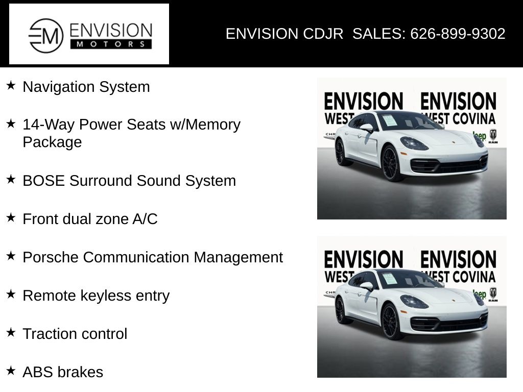 WE SPECIALIZE IN ALL CREDIT PROFILES! See what we can do for you! Call to find out (626) 899-9302.Clean CARFAX.Odometer is 21562 miles below market average! 14-Way Power Seats w/Memory Package, ABS brakes, Alloy wheels, BOSE Surround Sound System, Clear Taillights, Compass, Electronic Stability Control, Front dual zone A/C, Front Seat Ventilation, Heated door mirrors, Heated front seats, Illuminated entry, Lane Change Assist (LCA), Low tire pressure warning, Navigation System, Porsche Communication Management, Power Liftgate, Power moonroof, Remote keyless entry, Soft Close Doors, Traction control, Wheels: 21" SportDesign in High Gloss Black.White2021 Porsche Panamera RWD 8-Speed Porsche Doppelkupplung (PDK) V6**********All Pricing and Advertised Prices for any/all vehicles offered for sale does not include dealer installed accessories which can be purchased for an additional cost.********** The Factory Rebates may not be available on this vehicle if you elect to take advantage of a Special Alternative APR or Special Lease program. Some Factory Rebates are California Resident specific and may vary for residents of other states. NO sales to Dealers, Brokers or Exporters. For out of state purchase, customers must be present to purchase. If shipping is required, dealership must facilitate; no exceptions. Please contact us for special Multi-Vehicle or Fleet pricing. Prices are plus government fees and taxes, any finance charges, $85 documentary fee, $29 electronic registration fee, any emission testing charge and $1.75 per new tire state tire fee. *** We make every effort to provide accurate information, but please verify before purchasing. Leasing & financing available on approved credit. Trade-ins accepted. Subject to prior sale.