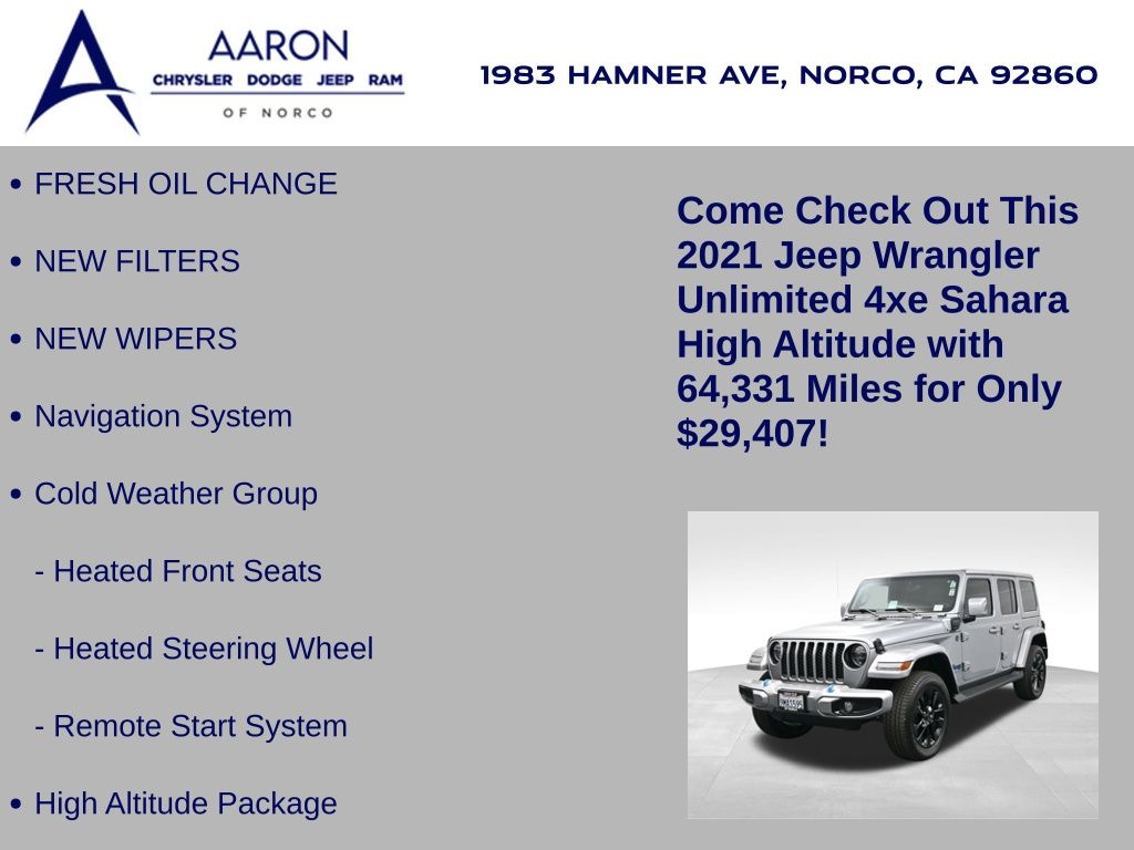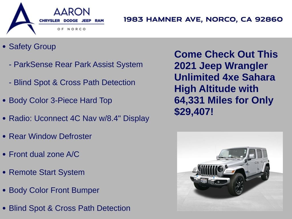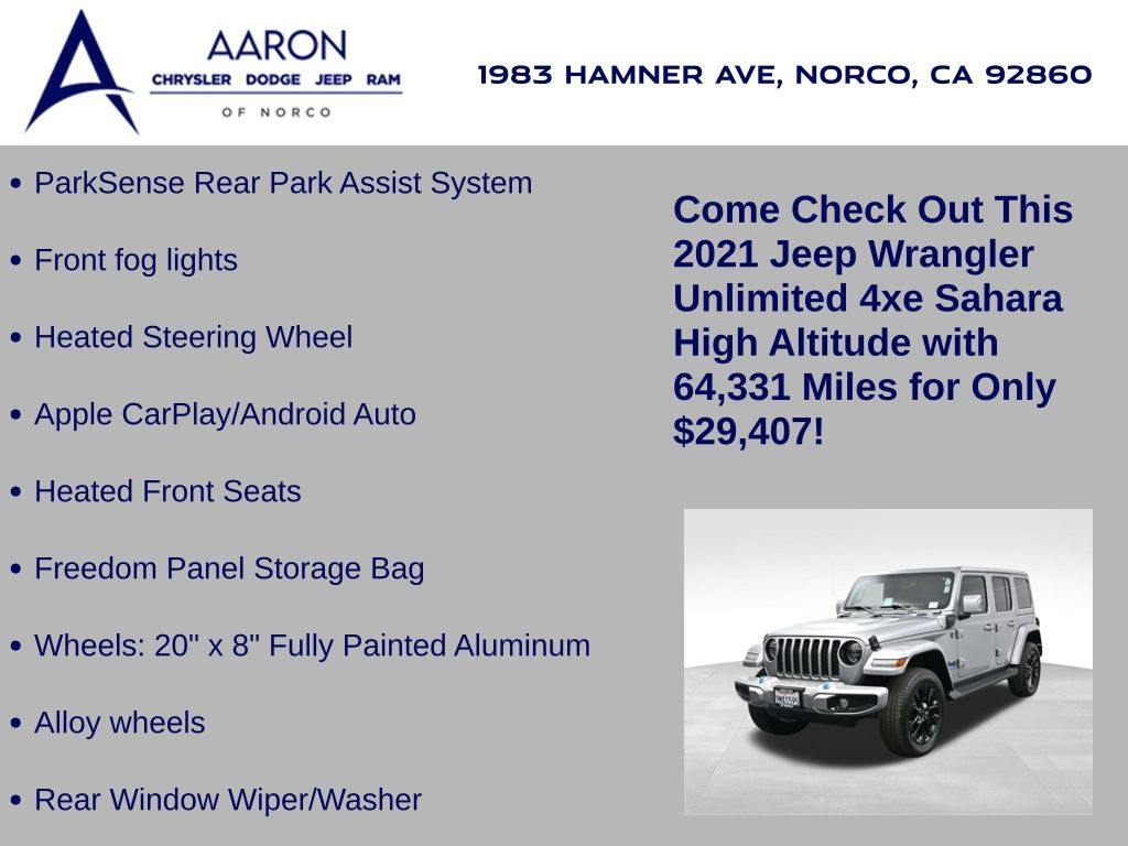 Priced below KBB Fair Purchase Price!FRESH OIL CHANGE, NEW FILTERS, NEW WIPERS, Wrangler Unlimited Sahara High Altitude 4xe, 4D Sport Utility, 2.0L I4 DOHC, 8-Speed Automatic, 4WD, Alloy wheels, Apple CarPlay/Android Auto, Blind Spot & Cross Path Detection, Body Color 3-Piece Hard Top, Body Color Front Bumper, Cold Weather Group, Freedom Panel Storage Bag, Front dual zone A/C, Front fog lights, Heated Front Seats, Heated Steering Wheel, High Altitude Package, Navigation System, ParkSense Rear Park Assist System, Radio: Uconnect 4C Nav w/8.4" Display, Rear Window Defroster, Rear Window Wiper/Washer, Remote Start System, Safety Group, Wheels: 20" x 8" Fully Painted Aluminum.Clean CARFAX.CARFAX One-Owner.