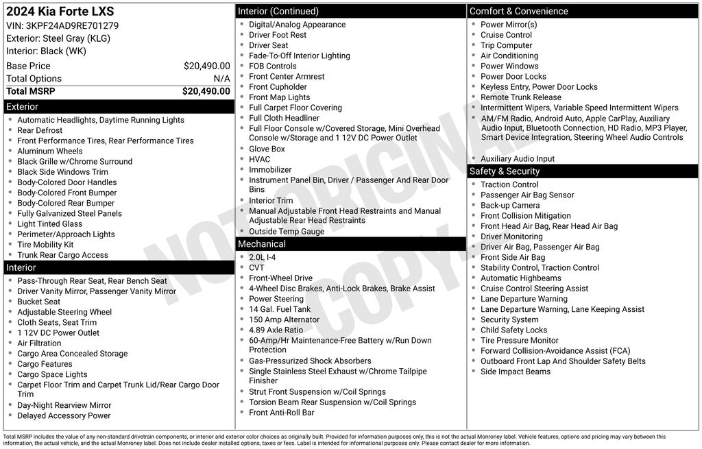 Steel Gray 2024 Kia Forte LXS FWD CVT 2.0L I4 MPI 16" x 6.5J Alloy Wheels, 4 Speakers, Apple CarPlay & Android Auto, Cloth Seat Trim, Radio: 8" Display Audio.28/39 City/Highway MPG