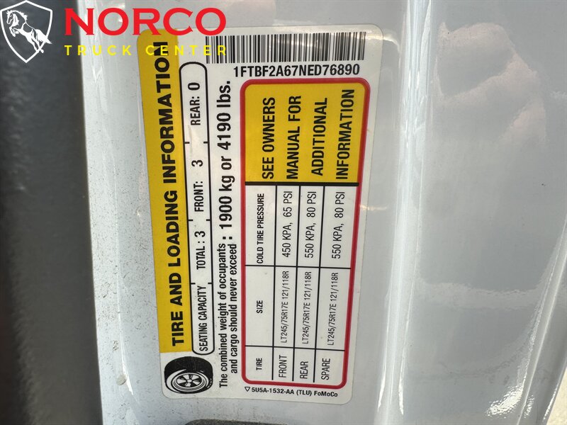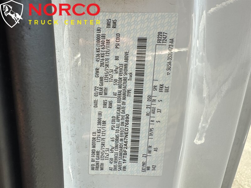 INSTALLED FEATURES: Air filtration, Front air conditioning, Front air conditioning zones: single, Airbag deactivation: passenger switch, Front airbags: dual, Side airbags: front, Side curtain airbags: front, Antenna type: mast, Auxiliary audio input: Bluetooth / USB, Radio: AM/FM / voice operated, Speed sensitive volume control, Total speakers: 4, ABS: 4-wheel, Braking assist, Electronic brakeforce distribution, Front brake type: ventilated disc, Power brakes, Rear brake type: ventilated disc, Armrests: front center, Door sill trim: scuff plate, Floor material: rubber/vinyl, Steering wheel trim: urethane, Assist handle: front, Cupholders: front, Power outlet(s): 12V front / USB front / USB-C front, Power steering, Reading lights: front, Rearview mirror: manual day/night, Steering wheel: tilt and telescopic, Steering wheel mounted controls: audio / multi-function / phone / voice control, Storage: accessory hook / door pockets, Vanity mirrors: passenger, Door handle color: black, Front bumper color: black, Grille color: black, Mirror color: black, Pickup bed light, Rear bumper color: black, Tailgate: lift assist / removable, Window trim: black, Connected in-car apps: app marketplace integration, Infotainment: SYNC, Infotainment screen size: 4.2 in., Clock, Digital odometer, External temperature display, Gauge: oil pressure / tachometer / transmission temperature, Instrument cluster screen size: 2.3 in., Powertrain hour meter, Warnings and reminders: low fuel level / maintenance due, Headlights: auto delay off / auto on/off / halogen / quad headlights / wiper activated, Side mirror adjustments: manual / manual folding / manual telescoping, Towing mirrors, Alternator: 157 amps, Battery: maintenance-free, Battery rating: 650 CCA, Battery saver, Automatic hazard warning lights, Camera system: rearview, Child seat anchors, Crumple zones: front, Impact sensor: alert system / door unlock / post-collision safety system, Programmable safety key, Rearview monitor: in dash, Emergency locking retractors: front, Front seatbelts: 3-point, Seatbelt pretensioners: front, Seatbelt warning sensor: front, Driver seat manual adjustments: 6 / lumbar / reclining, Front headrests: 2 / adjustable, Front seat type: 40-20-40 split bench, Passenger seat manual adjustments: 4 / reclining, Upholstery: vinyl, Anti-theft system: vehicle immobilizer, Hill holder control, Roll stability control, Stability control, Traction control, Trailer stability control, Front shock type: gas, Front spring type: coil, Front stabilizer bar, Front suspension classification: independent, Front suspension type: twin I-beam, Rear shock type: gas, Rear spring type: leaf, Rear suspension classification: solid live axle, Rear suspension type: multi-leaf, Electronic messaging assistance: voice operated / with read function, Hands-free phone call integration: voice operated, Smart device app compatibility: FordPass Connect, Smart device app function: engine start / lock operation / maintenance status / vehicle location, Wi-Fi: hotspot, Wireless data link: Bluetooth, Tow hooks: front, Trailer hitch, Trailer wiring: 4-pin / 7-pin, Spare tire mount location: underbody, Spare tire size: full-size, Spare wheel type: steel, Tire Pressure Monitoring System, Wheels: painted steel, Front wipers: variable intermittent, Solar-tinted glass: front