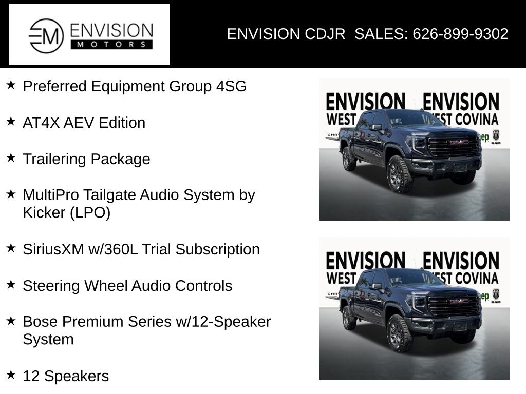 WE SPECIALIZE IN ALL CREDIT PROFILES! See what we can do for you! Call to find out (626) 899-9302.Clean CARFAX.Odometer is 7556 miles below market average! 10-Speed Automatic, 4WD, Obsidian Rush Leather, 12 Speakers, 120-Volt Bed Mounted Power Outlet, 120-Volt Interior Power Outlet, 1st & 2nd Row AEV All-Weather Floor Liners (LPO), 2 Charge/Data USB Ports Inside Center Console, 2 Type-C Charge-Only Rear USB Ports, 2 USB Ports, AEV Branded Front Head Restraints, AEV Stamped-Steel Rear Bumper, AEV Tailgate Decal w/Exterior Badging, AT4X AEV Edition, Bed View Camera, Bose Premium Series w/12-Speaker System, Color-Keyed Carpeting Floor Covering, Deep-Tinted Glass, Driver-Selectable Full-Locking Front Differential, Driver-Selectable Full-Locking Rear Differential, Electric Rear-Window Defogger, Floor-Mounted Center Console, Front Prem Floor Liners w/Removable Carpet Insert, Front Rain-Sensing Wipers, Gloss Black Door Handles, Gloss Black Header w/Drk Nickel Grille Insert Bars, HD Surround Vision, Heated 2nd Row Outboard Seats, Heated Driver & Front Outboard Passenger Seating, Heavy-Duty Air Filter, Hill Descent Control, Hitch Guidance, Hitch View, In-Vehicle Trailering System App, Integrated Trailer Brake Controller, Keyless Open & Start, LED Cargo Area Lighting, Multicolor 15" Diagonal Head-Up Display, MultiPro Tailgate Audio System by Kicker (LPO), OnStar Services Capable, Perimeter Lighting, Power Door Locks, Power Front Passenger Windows w/Express Up/Down, Power Front Windows w/Driver Express Up/Down, Power Rake & Telescoping Steering Column, Power Rear Windows w/Express Down, Power Sliding Rear Window w/Rear Defogger, Power Sunroof, Preferred Equipment Group 4SG, Push Button Start, Rear Cross Traffic Braking, Rear Pedestrian Detection, Rear Prem Floor Liners w/Removable Carpet Insert, Rear Wheelhouse Liners, Remote Vehicle Starter System, Rocker Protection (LPO), SiriusXM w/360L Trial Subscription, Spray-On Pickup Bedliner w/GMC Logo, Steering Wheel Audio Controls, Theft Deterrent System (Unauthorized Entry), Trailer Camera Provisions, Trailer Side Blind Zone Alert, Trailer Tire Pressure Monitor System, Trailering Package, Ultrasonic Front & Rear Park Assist, Universal Home Remote, Ventilated Driver & Front Passenger Seats, Wheels: 18" x 8.5" 12-Spoke High Gloss Black Alum, Wi-Fi Hotspot Capable, Wireless Charging.Titanium Rush Metallic2025 GMC Sierra 1500 AT4X 4WD 10-Speed Automatic 3.0L I6**********All Pricing and Advertised Prices for any/all vehicles offered for sale does not include dealer installed accessories which can be purchased for an additional cost.********** The Factory Rebates may not be available on this vehicle if you elect to take advantage of a Special Alternative APR or Special Lease program. Some Factory Rebates are California Resident specific and may vary for residents of other states. NO sales to Dealers, Brokers or Exporters. For out of state purchase, customers must be present to purchase. If shipping is required, dealership must facilitate; no exceptions. Please contact us for special Multi-Vehicle or Fleet pricing. Prices are plus government fees and taxes, any finance charges, $85 documentary fee, $29 electronic registration fee, any emission testing charge and $1.75 per new tire state tire fee. *** We make every effort to provide accurate information, but please verify before purchasing. Leasing & financing available on approved credit. Trade-ins accepted. Subject to prior sale.