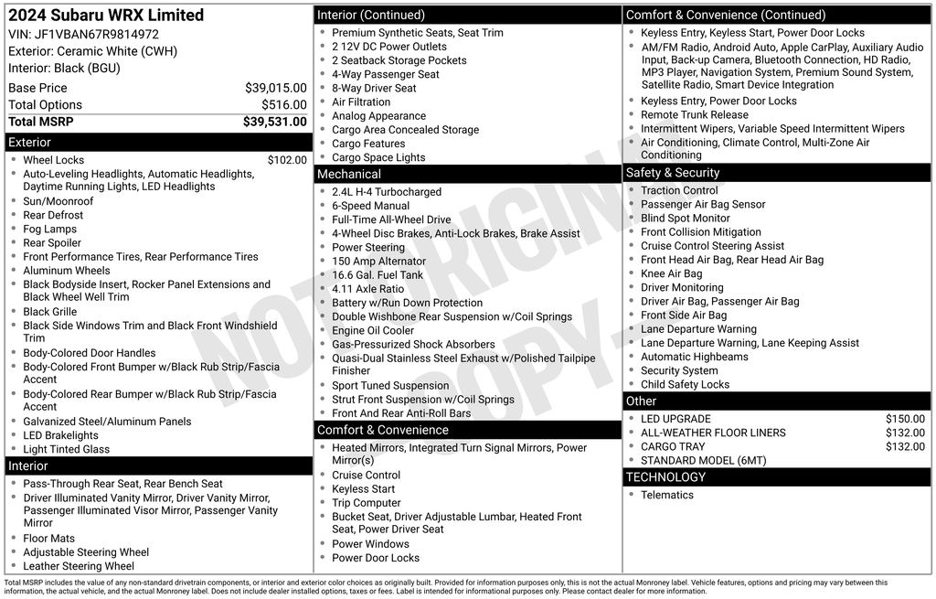 Ceramic White 2024 Subaru WRX Limited AWD 6-Speed Manual 2.4L DOHCRecent Arrival! Odometer is 3098 miles below market average! 19/26 City/Highway MPG