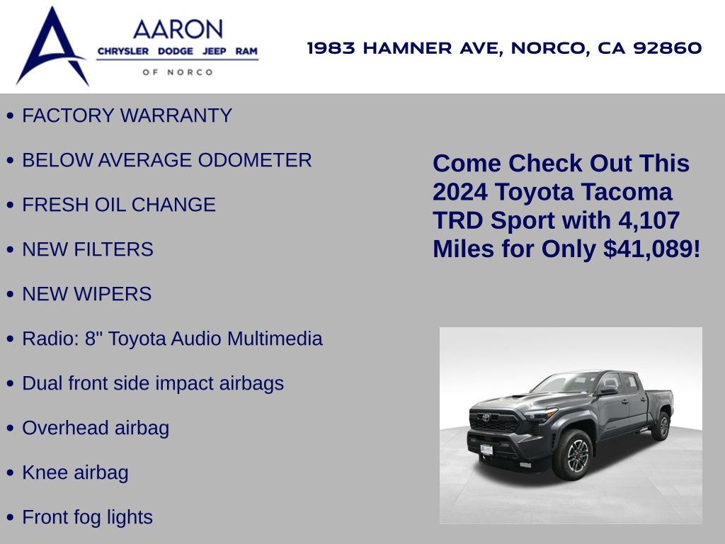 FACTORY WARRANTY, BELOW AVERAGE ODOMETER, FRESH OIL CHANGE, NEW FILTERS, NEW WIPERS, Tacoma TRD Sport, 4D Double Cab, 2.4L 4-Cylinder, 8-Speed Automatic, RWD, Alloy wheels, Apple CarPlay/Android Auto, Dual front side impact airbags, Front fog lights, Knee airbag, Overhead airbag, Radio: 8" Toyota Audio Multimedia.