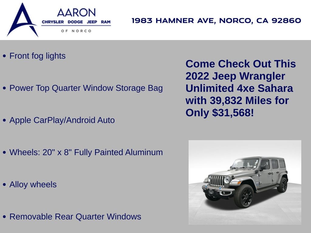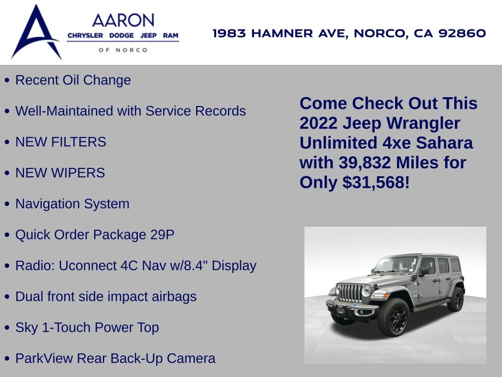 Adventure meets efficiency in this highly equipped 2022 Jeep Wrangler Unlimited Sahara 4xe, the iconic off-road SUV now reimagined with plug-in hybrid electric capability and modern luxury. With only 39,832 miles, a 1-owner Carfax history, and no accidents reported, this Wrangler delivers exceptional value, daily drivability, and the trail-rated performance you expect from Jeepwhile offering up to 49 MPGe combined and an estimated 21 miles of all-electric range. Under the hood, the 4xe pairs a 2.0L turbocharged engine with dual electric motors and a 17 kWh battery to deliver 375 horsepower and 470 lb-ft of torque through a TorqueFlite 8-speed automatic transmission and full-time 4WD system. Whether tackling highways or rock crawls, this Wrangler is equipped to handle both with features like Selec-Trac 4x4, 2-speed transfer case, and electronic stability control, along with Blue Tow Hooks, Dana 44 heavy-duty axles, hill-start assist, and 4-wheel disc ABS brakes. Finished in Silver Zynith Clear-Coat Paint with premium body-color fenders and 3-piece black hardtop, this Sahara stands out while offering practical touches like 275/55R20 all-season tires, power heated mirrors, and 20-inch aluminum wheels. Inside, enjoy leather-trimmed seats, Uconnect 4C NAV with 8.4-inch touchscreen, Apple CarPlay, Android Auto, Alpine Premium Audio, and 115V household-style outlet. The Cold Weather Group adds heated front seats, heated steering wheel, and remote start, while the Safety Group and Advanced Safety Group provide Blind Spot Monitoring, Rear Cross-Path Detection, ParkSense rear park assist, Adaptive Cruise Control, and Forward Collision Warning Plus. This Wrangler also includes the Trailer Tow Package, HD electrical group, and rear window defroster and washer, giving you everything you need for weekend towing or weekday commuting. Backed by Jeeps 5-year/60,000-mile powertrain warranty, this low-mileage Sahara 4xe offers future-forward driving without compromising classic Wrangler capability. Whether you're an eco-conscious commuter or weekend over-lander, this plug-in hybrid Jeep is ready to electrify your next adventure. Contact us today to schedule your test drive before this highly equipped, clean-title 4xe disappears from our lot.