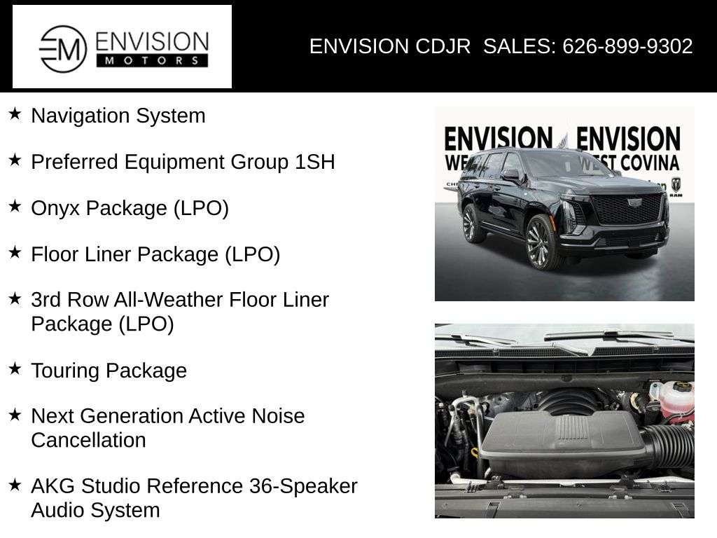 WE SPECIALIZE IN ALL CREDIT PROFILES! See what we can do for you! Call to find out (626) 899-9302.Odometer is 2119 miles below market average! 4WD, Jet Black Leather, 2-Speed Active Transfer Case, 3rd Row All-Weather Floor Liner Package (LPO), Air Ride Adaptive Suspension, AKG Studio Reference 36-Speaker Audio System, Black Illuminated Cadillac Emblem (LPO), Blind Zone Steering Assist w/Trailering, Door Lock & Latch Shields, Electronic Limited-Slip Differential, Floor Console w/Covered Storage, Floor Liner Package (LPO), Front Auxiliary 12-volt Power Outlet, Glass Breakage Sensor, Gloss Black Escalade Nameplate (LPO), Heated & Ventilated Driver & Front Passenger Seats, Hitch Guidance w/Hitch View, Illuminating Front & Rear Sill Plates, Integrated Cargo Liner (LPO), Integrated Trailer Brake Controller, Navigation System, Next Generation Active Noise Cancellation, Night Vision, Onyx Package (LPO), Platinum Interior Trim, Power Lumbar Massage Driver Seat, Power Lumbar Massage Front Passenger Seat, Power Open/Close Doors, Power Panoramic Tilt-Sliding Sunroof, Power-Retractable Assist Steps, Preferred Equipment Group 1SH, Premium All-Weather Floor Liners (LPO), Rear Seat Entertainment System, Reconfigurable Full-Color Head-Up Display, Smart Trailer Integration Indicator, Soft Closing Front & Rear Doors, Theft-Deterrent Alarm System, Touring Package, Trailering App, Trailering Assist Guidelines, Vehicle Inclination Sensor, Vehicle Interior Movement Sensor, Wheels: 24" Black Alloy (LPO), Wheels: 24" Transit (LPO).Black Raven2025 Cadillac Escalade Sport Platinum 4WD 10-Speed Automatic 6.2L V8**********All Pricing and Advertised Prices for any/all vehicles offered for sale does not include dealer installed accessories which can be purchased for an additional cost.********** The Factory Rebates may not be available on this vehicle if you elect to take advantage of a Special Alternative APR or Special Lease program. Some Factory Rebates are California Resident specific and may vary for residents of other states. NO sales to Dealers, Brokers or Exporters. For out of state purchase, customers must be present to purchase. If shipping is required, dealership must facilitate; no exceptions. Please contact us for special Multi-Vehicle or Fleet pricing. Prices are plus government fees and taxes, any finance charges, $85 documentary fee, $29 electronic registration fee, any emission testing charge and $1.75 per new tire state tire fee. *** We make every effort to provide accurate information, but please verify before purchasing. Leasing & financing available on approved credit. Trade-ins accepted. Subject to prior sale.