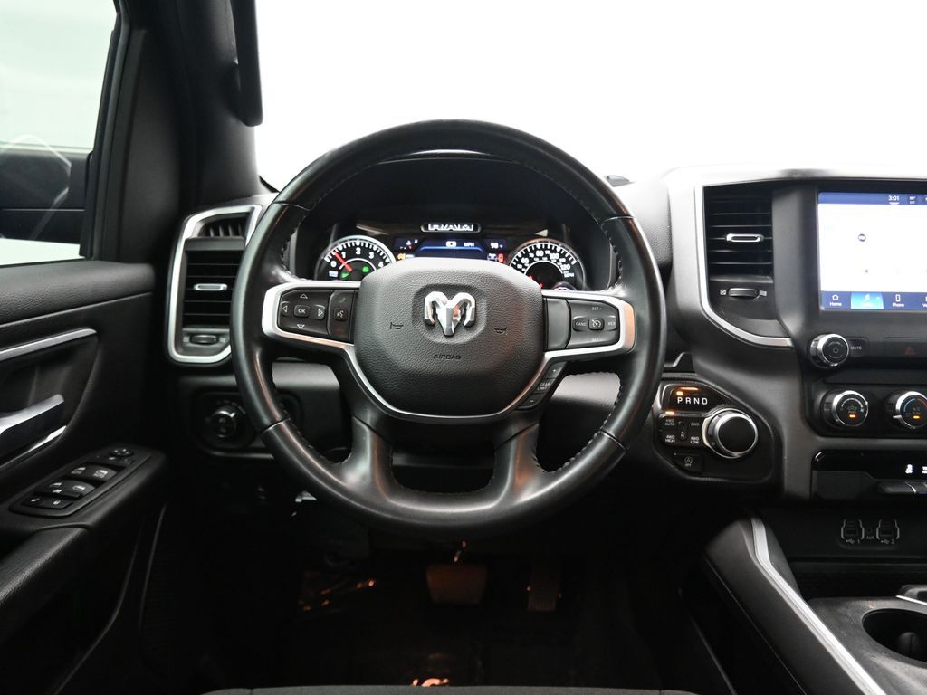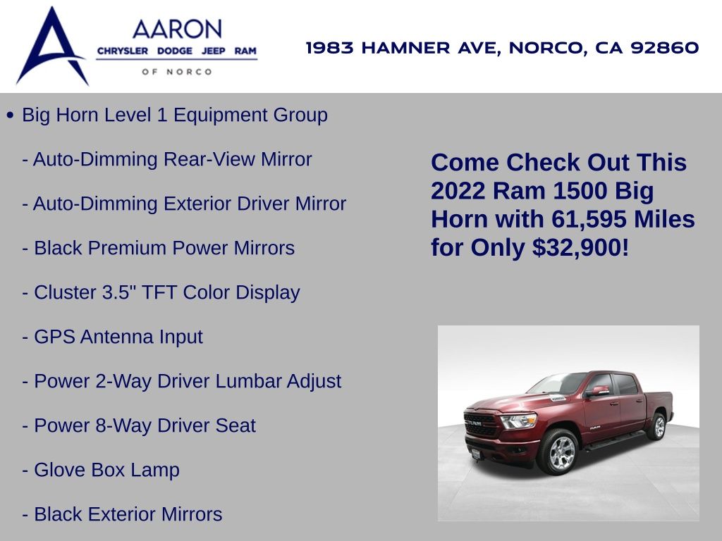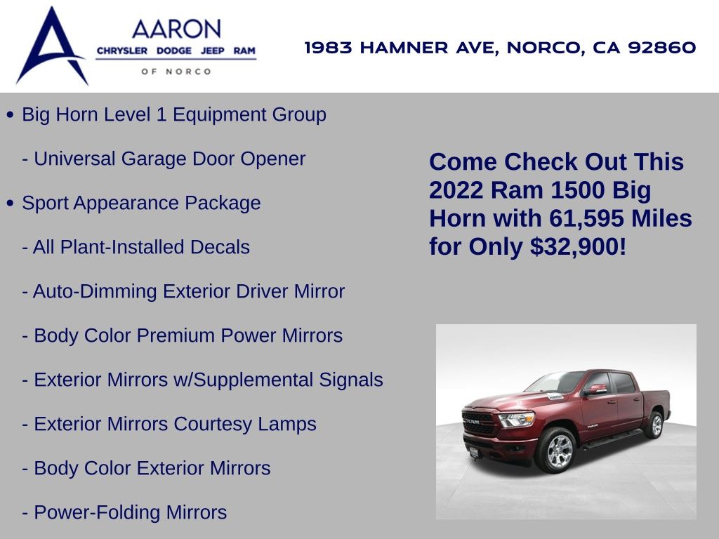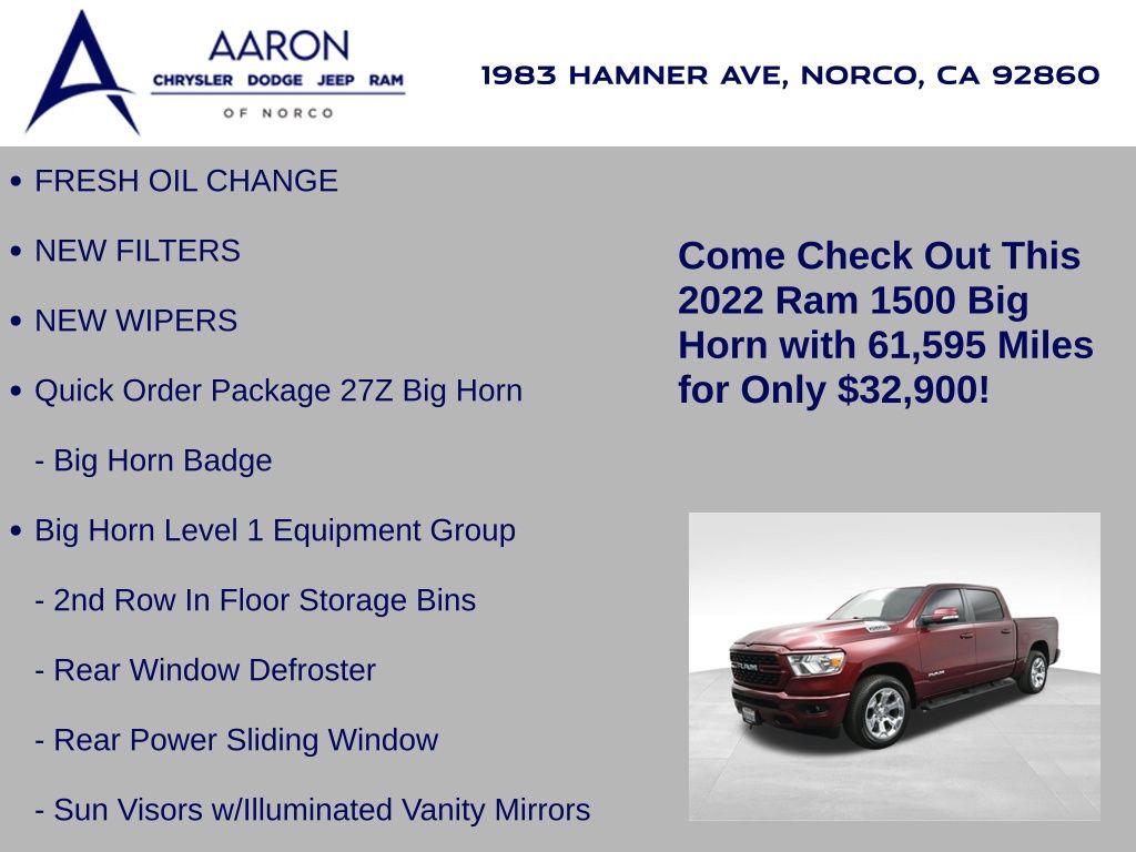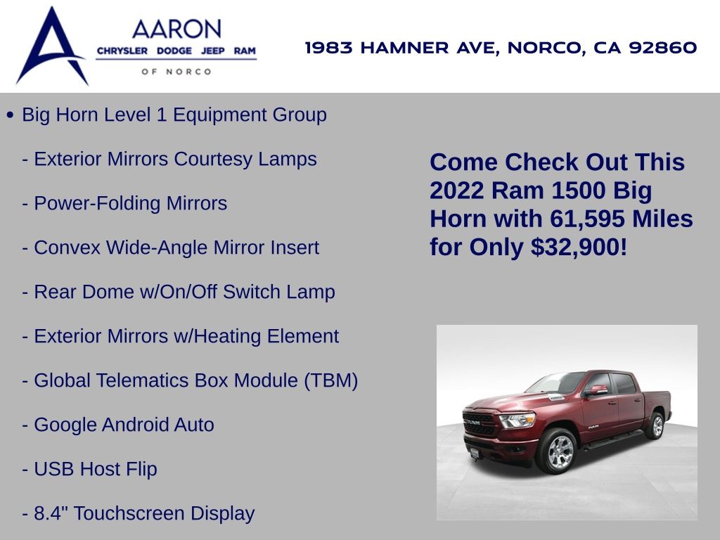 2022 Ram 1500 Big Horn Crew Cab 4x4, 5.7L HEMI V8 with eTorque, 8-speed auto, 1-Owner, no accidents, just over 61,000 miles, 19 MPG combined.Equipped with Level 1 Equipment Group, Diamond Black paint, and Big Horn Package 2, adding Uconnect 5 with 8.4-inch display, Apple CarPlay, Android Auto, and premium cloth seating. Para la version en espanol, vea abajo.Capability includes 4x4 drivetrain, Class IV receiver hitch, trailer sway damping, ParkView rear backup camera, 7-pin wiring harness, heavy-duty suspension, and 20-inch chrome aluminum wheels.Comfort and convenience features include power driver seat with lumbar, leather-wrapped steering wheel, tilt/telescoping column, rear sliding window, integrated voice command, and SiriusXM with 6-month trial.Safety technology adds electronic stability control, electronic roll mitigation, hill-start assist, tire pressure monitoring, speed control, and advanced multistage airbags.We keep it straightforward with transparent pricing, thorough reconditioning, and easy financing. Our no-pressure team is here to answer questions and provide a stress-free process. Ready to see it up close? Contact us today to schedule a no-obligation test drive or virtual tour.2022 Ram 1500 Big Horn Crew Cab 4x4, motor HEMI V8 5.7L con eTorque, transmision automatica de 8 velocidades, 1 dueno, sin accidentes, poco mas de 61,000 millas, 19 MPG combinado.Equipado con Level 1 Equipment Group, pintura Diamond Black y paquete Big Horn 2, que anade Uconnect 5 con pantalla de 8.4, Apple CarPlay, Android Auto y asientos de tela premium.Su capacidad incluye traccion 4x4, enganche Clase IV, control de balanceo de remolque, camara de reversa ParkView, arnes de 7 pines, suspension de servicio pesado y rines de aluminio cromados de 20 pulgadas.Las comodidades abarcan asiento electrico del conductor con soporte lumbar, volante en piel, columna de direccion ajustable, ventana trasera corrediza, comandos de voz integrados y SiriusXM con prueba de 6 meses.La seguridad suma control de estabilidad, mitigacion electronica de vuelcos, asistente de arranque en pendiente, monitoreo de presion de llantas, control de velocidad y bolsas de aire avanzadas multietapa.Mantenemos un proceso transparente, reacondicionamiento minucioso y financiamiento sencillo. Nuestro equipo sin presion esta listo para responder tus dudas y darte tranquilidad. Da el siguiente paso escribiendonos para una cotizacion personalizada o para agendar una prueba de manejo conveniente.