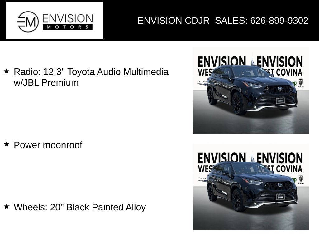 WE SPECIALIZE IN ALL CREDIT PROFILES! See what we can do for you! Call to find out (626) 899-9302.22/29 City/Highway MPG Power moonroof, Radio: 12.3" Toyota Audio Multimedia w/JBL Premium, Wheels: 20" Black Painted Alloy.Midnight Black2024 Toyota Highlander XSE FWD 8-Speed Automatic 2.4L I4 PDI Turbocharged DOHC 16V LEV3-SULEV30 265hp**********All Pricing and Advertised Prices for any/all vehicles offered for sale does not include dealer installed accessories which can be purchased for an additional cost.********** The Factory Rebates may not be available on this vehicle if you elect to take advantage of a Special Alternative APR or Special Lease program. Some Factory Rebates are California Resident specific and may vary for residents of other states. NO sales to Dealers, Brokers or Exporters. For out of state purchase, customers must be present to purchase. If shipping is required, dealership must facilitate; no exceptions. Please contact us for special Multi-Vehicle or Fleet pricing. Prices are plus government fees and taxes, any finance charges, $85 documentary fee, $29 electronic registration fee, any emission testing charge and $1.75 per new tire state tire fee. *** We make every effort to provide accurate information, but please verify before purchasing. Leasing & financing available on approved credit. Trade-ins accepted. Subject to prior sale.