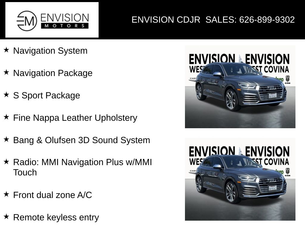 WE SPECIALIZE IN ALL CREDIT PROFILES! See what we can do for you! Call to find out (626) 899-9302.Odometer is 2767 miles below market average! ABS brakes, Adaptive suspension, Alloy wheels, Audi Connect PRIME & PLUS, Audi Virtual Cockpit, Bang & Olufsen 3D Sound System, Carbon Atlas Inlays, Compass, Electronic Stability Control, Fine Nappa Leather Seating Surfaces, Fine Nappa Leather Upholstery, Front dual zone A/C, Heated door mirrors, Heated front seats, Heated Front Sport Seats, Illuminated entry, Leatherette Covered Center Console, Low tire pressure warning, Navigation Package, Navigation System, Power Liftgate, Power moonroof, Radio: MMI Navigation Plus w/MMI Touch, Red Brake Calipers w/S Logo, Remote keyless entry, S Sport Package, Sport Adaptive Air Suspension, Sport Rear Differential, Traction control.Daytona Gray Pearl Effect2018 Audi SQ5 3.0T Premium Plus quattro 8-Speed Automatic with Tiptronic 3.0L TFSI**********All Pricing and Advertised Prices for any/all vehicles offered for sale does not include dealer installed accessories which can be purchased for an additional cost.********** The Factory Rebates may not be available on this vehicle if you elect to take advantage of a Special Alternative APR or Special Lease program. Some Factory Rebates are California Resident specific and may vary for residents of other states. NO sales to Dealers, Brokers or Exporters. For out of state purchase, customers must be present to purchase. If shipping is required, dealership must facilitate; no exceptions. Please contact us for special Multi-Vehicle or Fleet pricing. Prices are plus government fees and taxes, any finance charges, $85 documentary fee, $29 electronic registration fee, any emission testing charge and $1.75 per new tire state tire fee. *** We make every effort to provide accurate information, but please verify before purchasing. Leasing & financing available on approved credit. Trade-ins accepted. Subject to prior sale.Awards: * 2018 KBB.com 10 Most Fun SUVs * 2018 KBB.com 10 Most Awarded Brands