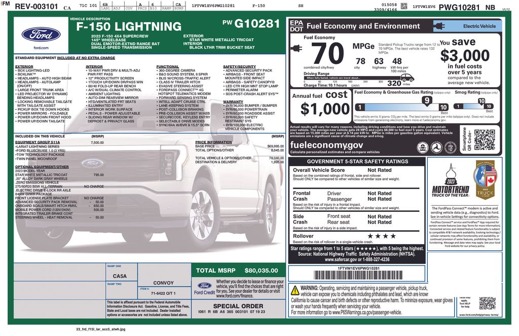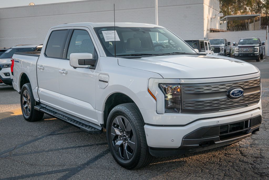 Star White Metallic Tri-Coat 2023 Ford F-150 Lightning Pro AWD Single-Speed Automatic Electric Motor 360 Degree Camera, 6 Speakers, Alloy wheels, Automatic temperature control, Forward Sensing System, Front dual zone A/C, Heated front seats, Manual-Folding Power Glass Heated Mirrors, Navigation System, Pro Trailer Backup Assist, Pro Trailer Hitch Assist, Radio: FM Stereo w/6 Speakers, Split folding rear seat, SYNC 4 w/Enhanced Voice Recognition, Tow Technology Package, Trailer Brake Controller, Wheels: 18" Machined w/Black High Gloss Pockets.78/63 City/Highway MPG