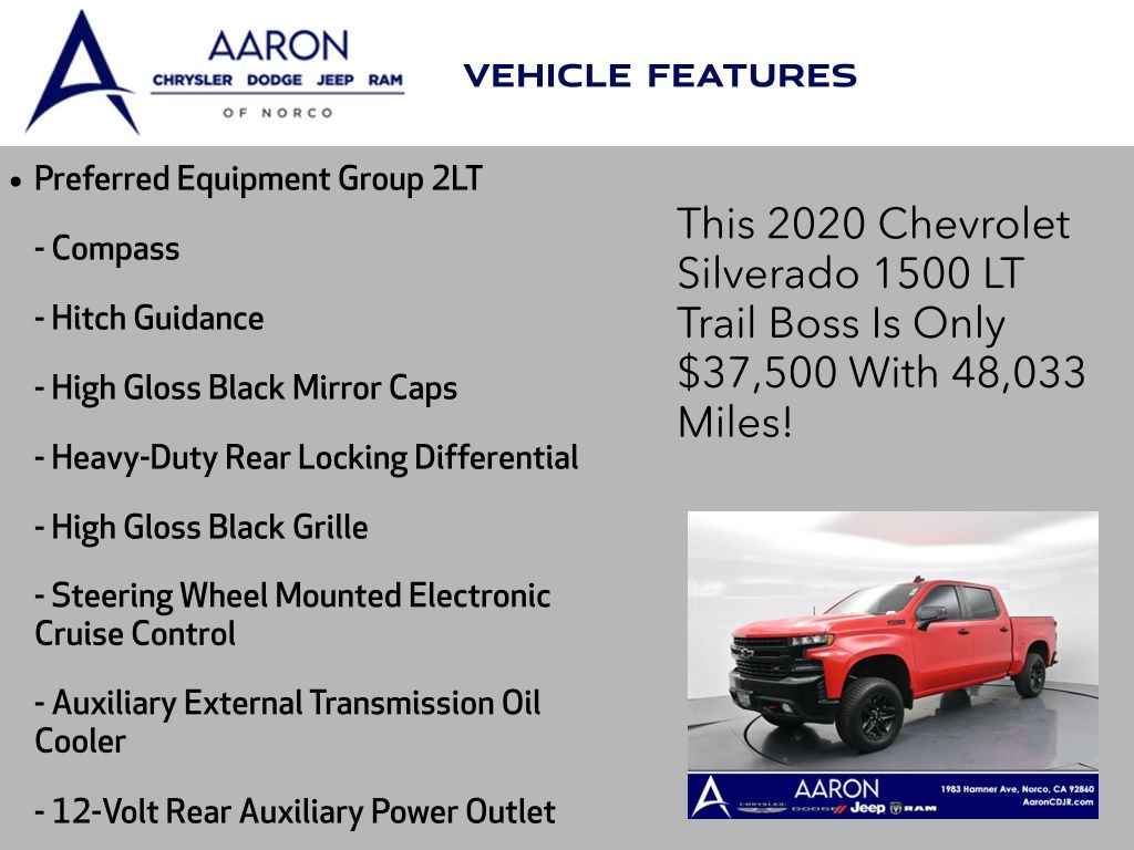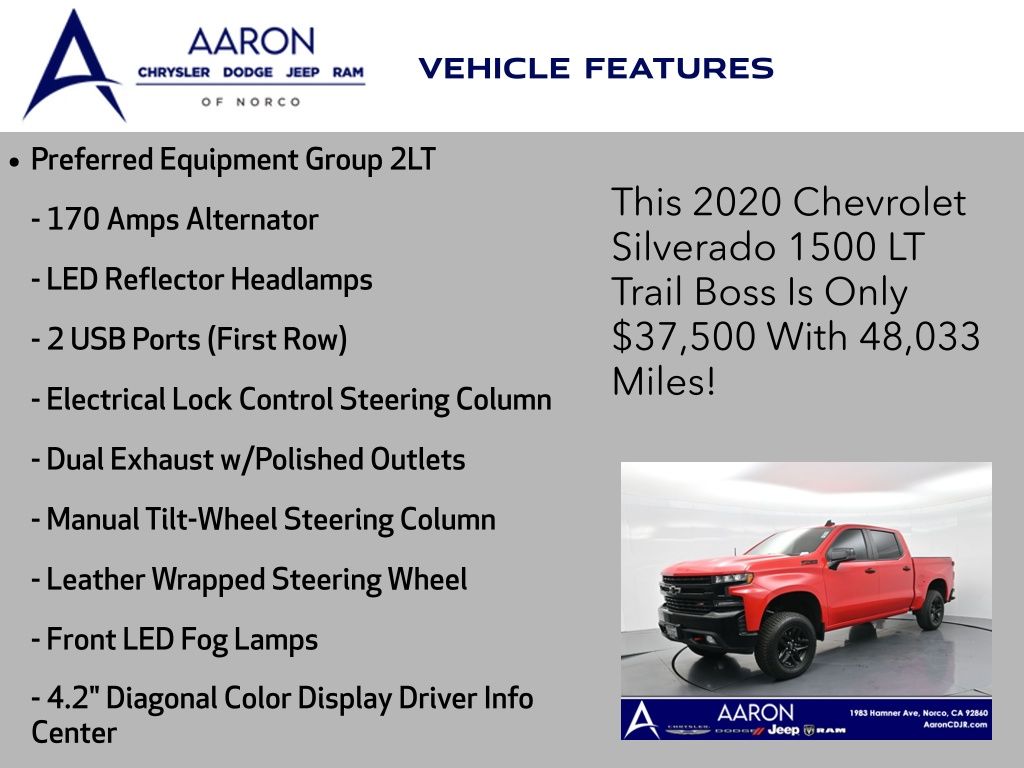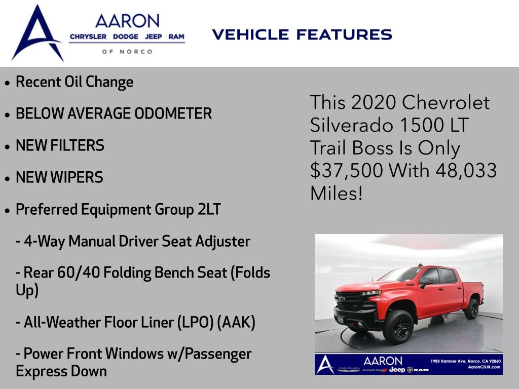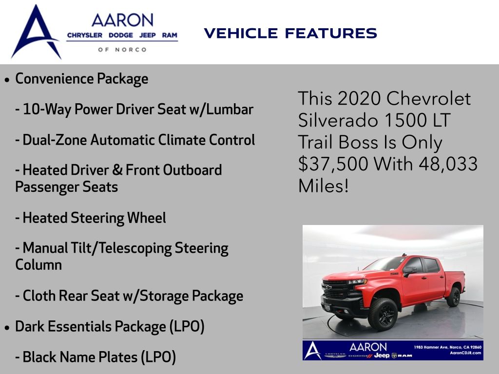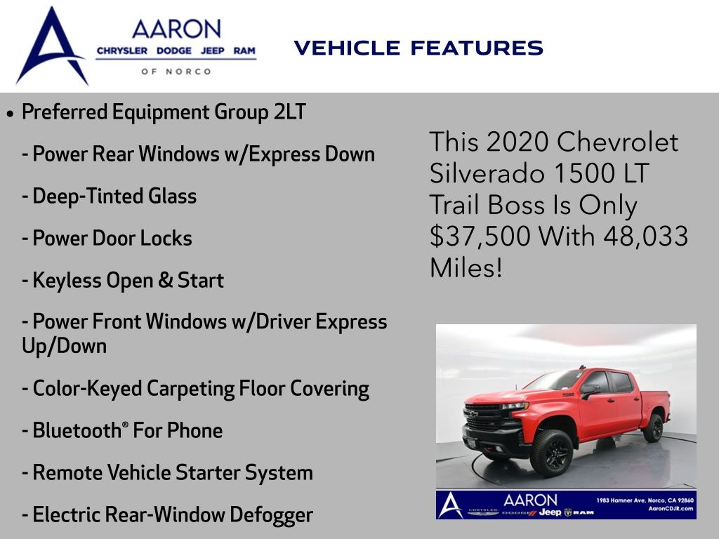 This 2020 Chevrolet Silverado 1500 LT Trail Boss Crew Cab 4x4 in eye-catching Red Hot delivers rugged off-road capability, full-size truck utility, and everyday comfort. Powered by the robust 5.3L EcoTec3 V8 paired with a smooth-shifting 10-speed automatic transmission, its equipped to handle heavy loads, challenging terrain, and long highway hauls with ease. The Trail Boss package adds Z71 off-road suspension with Rancho shocks, skid plates, hill descent control, a two-speed transfer case, and Goodyear Wrangler Duratrac off-road tires mounted on painted aluminum wheels. Its bold exterior is accented by black badging, recovery hooks, LED signature lighting, dual exhaust with polished tips, and a factory spray-in bedliner for durability. Inside, the Jet Black cabin offers heated front seats, a heated steering wheel, dual-zone automatic climate control, and a Chevrolet Infotainment 3 system with 8-inch touchscreen, Apple CarPlay, Android Auto, Bluetooth, and 4G LTE Wi-Fi hotspot capability. Additional convenience features include a remote start system, rear window defogger, rear seat storage package, trailer brake controller, and multiple USB ports. Safety is supported by a rear vision camera, tire pressure monitoring, StabiliTrak stability control, and Teen Driver mode. With 48,033 miles, a clean CARFAX history, and documented service records, this Silverado LT Trail Boss is in excellent condition and ready for its next adventure. Combining the comfort and technology you want with the off-road prowess you need, this Trail Boss is equally at home on job sites, trails, or the open road. Come see how it can work and play as hard as you do.