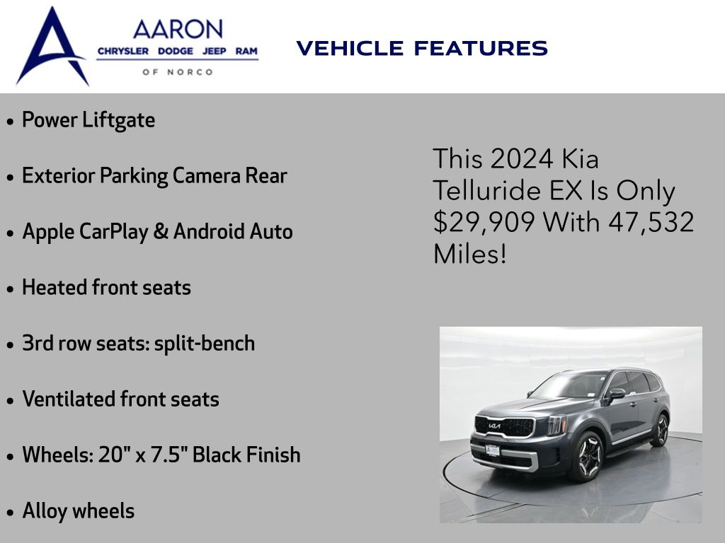 This 2024 Kia Telluride EX in Gravity Gray offers a refined balance of modern design, advanced safety, and family-friendly versatility. Powered by a 3.8L DOHC V6 with dual CVVT paired to an 8-speed automatic transmission, it delivers confident performance with an EPA-estimated 20 MPG city and 26 MPG highway. The EX trim elevates comfort with leather seat trim, heated front seats, a power-adjustable drivers seat with 2-way lumbar support, dual-zone automatic climate control, and a leather-wrapped steering wheel. The interior also features a premium infotainment system with a 12.3-inch touchscreen, navigation, Apple CarPlay, Android Auto, Bluetooth, and a wireless phone charger. Thoughtful details like Smart Power Tailgate, Smart Key with push-button start, and a 10-way power drivers seat enhance convenience, while the second-row captains chairs and sliding/reclining third row make it easy to accommodate passengers or cargo. Safety technology includes Forward Collision-Avoidance Assist, Blind-Spot View Monitor, Highway Driving Assist, Lane Keeping Assist, and Rear Cross-Traffic Collision-Avoidance Assist, providing peace of mind on every trip. Exterior highlights include LED headlights, black finish 20-inch alloy wheels, body-color door handles, and silver roof rails. With 47,532 miles, a clean CARFAX 1-owner history, and a full suite of comfort and technology features, this Telluride EX is ready to provide years of reliable service. Offering a spacious cabin, upscale amenities, and strong value, this Kia Telluride is perfect for families and adventurers alike. Experience it today and see why its one of the most awarded SUVs in its class.