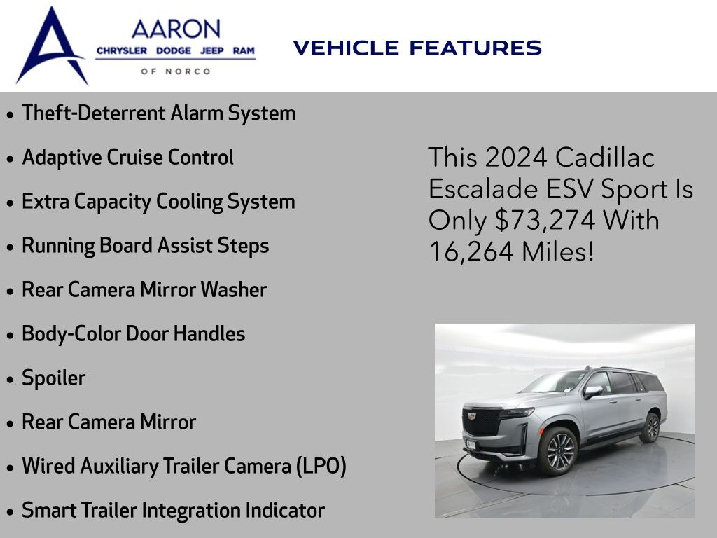 Luxury, power, and innovation converge in this stunning 2024 Cadillac Escalade ESV Sport 2WD, a full-size SUV that sets the benchmark for first-class comfort, high-end technology, and commanding V8 performance. With only 16,264 miles, a clean Carfax with no accidents, and 1-owner corporate fleet use, this Escalade offers like-new condition with unmatched value. Powered by a legendary 6.2L V8 engine paired with a 10-speed automatic transmission, the ESV delivers robust torque and smooth acceleration with surprising efficiency for its size. Finished in Argent Silver Metallic over a refined Jet Black leather interior, this extended-wheelbase Escalade Sport features bold 22-inch 12-spoke dark alloy wheels, LED lighting throughout, gloss black exterior accents, and the signature Sport-exclusive blackout trim package that gives it a distinctive, performance-inspired presence. Inside, the ESVs cavernous cabin is a masterclass in luxury, offering semi-aniline leather seating, a 16.9-inch OLED infotainment screen, 14.2-inch digital cluster, and a dual 12.6-inch rear seat entertainment systemall surrounded by ambient lighting and precision-crafted materials. Premium amenities include a panoramic sunroof, AKG Studio 19-speaker premium audio system, power 60/40 split-folding third row, heated and ventilated front and second-row seats, wireless Apple CarPlay/Android Auto, wireless device charging, and a head-up display. The Heavy-Duty Trailering Package adds serious capability, with an auxiliary trailer camera, trailer blind zone alert, and integrated trailer brake controller, while the Adaptive Cruise Control, HD Surround Vision, Enhanced Automatic Emergency Braking, and Night Vision System ensure top-tier safety for every passenger. With Cadillac Smart System and 3 years of OnStar Remote Access Plan, this Escalade offers not only unmatched luxury but advanced connectivity and peace of mind. The extended ESV body delivers enormous cargo space without compromising ride quality, thanks to Magnetic Ride Control and Auto-Leveling Rear Air Suspension. Whether you're transporting family, clients, or your weekend adventure gear, this Escalade ESV Sport blends power, prestige, and versatility like no other SUV. Don't miss your chance to experience Cadillacs flagship. Schedule your private test drive today.