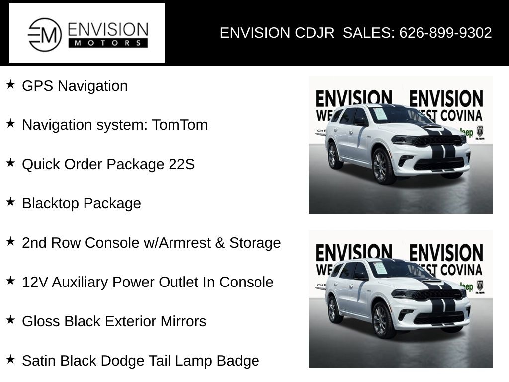 WE SPECIALIZE IN ALL CREDIT PROFILES! See what we can do for you! Call to find out (626) 899-9302.Certified.Odometer is 20156 miles below market average! AWD, 1 USB Charging Port in Console, 12V Auxiliary Power Outlet In Console, 2nd Row Console w/Armrest & Storage, 3rd Row Floor Mat & Full Console, Blacktop Package, Gloss Black Badges, Gloss Black Exterior Mirrors, GPS Navigation, Illuminated Rear Cupholders, Navigation system: TomTom, Quick Order Package 22S, Satin Black Dodge Tail Lamp Badge, Wheels: 20" x 8.0" Black Noise Aluminum.White Knuckle Clearcoat2021 Dodge Durango R/T AWD 8-Speed Automatic HEMI 5.7L V8 Multi Displacement VVTFCA US LLC Certified Pre-Owned Details: * Roadside Assistance * Limited Warranty: 3 Month/3,000 Mile (whichever comes first) after new car warranty expires or from certified purchase date * Vehicles Up to 75,000 Miles and/or 5 Model Years. 24-Hour Towing & Roadside Assistance, Car Rental Allowance, CARFAX® Vehicle History ReportTM and an Introductory 3-month Subscription to SiriusXM® Satellite Radio & Certified Warranty Upgrades * 125 Point Inspection * Vehicle History * Transferable Warranty * Warranty Deductible: $100 * Powertrain Limited Warranty: 84 Month/100,000 Mile (whichever comes first) from original in-service date**********All Pricing and Advertised Prices for any/all vehicles offered for sale does not include dealer installed accessories which can be purchased for an additional cost.********** The Factory Rebates may not be available on this vehicle if you elect to take advantage of a Special Alternative APR or Special Lease program. Some Factory Rebates are California Resident specific and may vary for residents of other states. NO sales to Dealers, Brokers or Exporters. For out of state purchase, customers must be present to purchase. If shipping is required, dealership must facilitate; no exceptions. Please contact us for special Multi-Vehicle or Fleet pricing. Prices are plus government fees and taxes, any finance charges, $85 documentary fee, $29 electronic registration fee, any emission testing charge and $1.75 per new tire state tire fee. *** We make every effort to provide accurate information, but please verify before purchasing. Leasing & financing available on approved credit. Trade-ins accepted. Subject to prior sale.