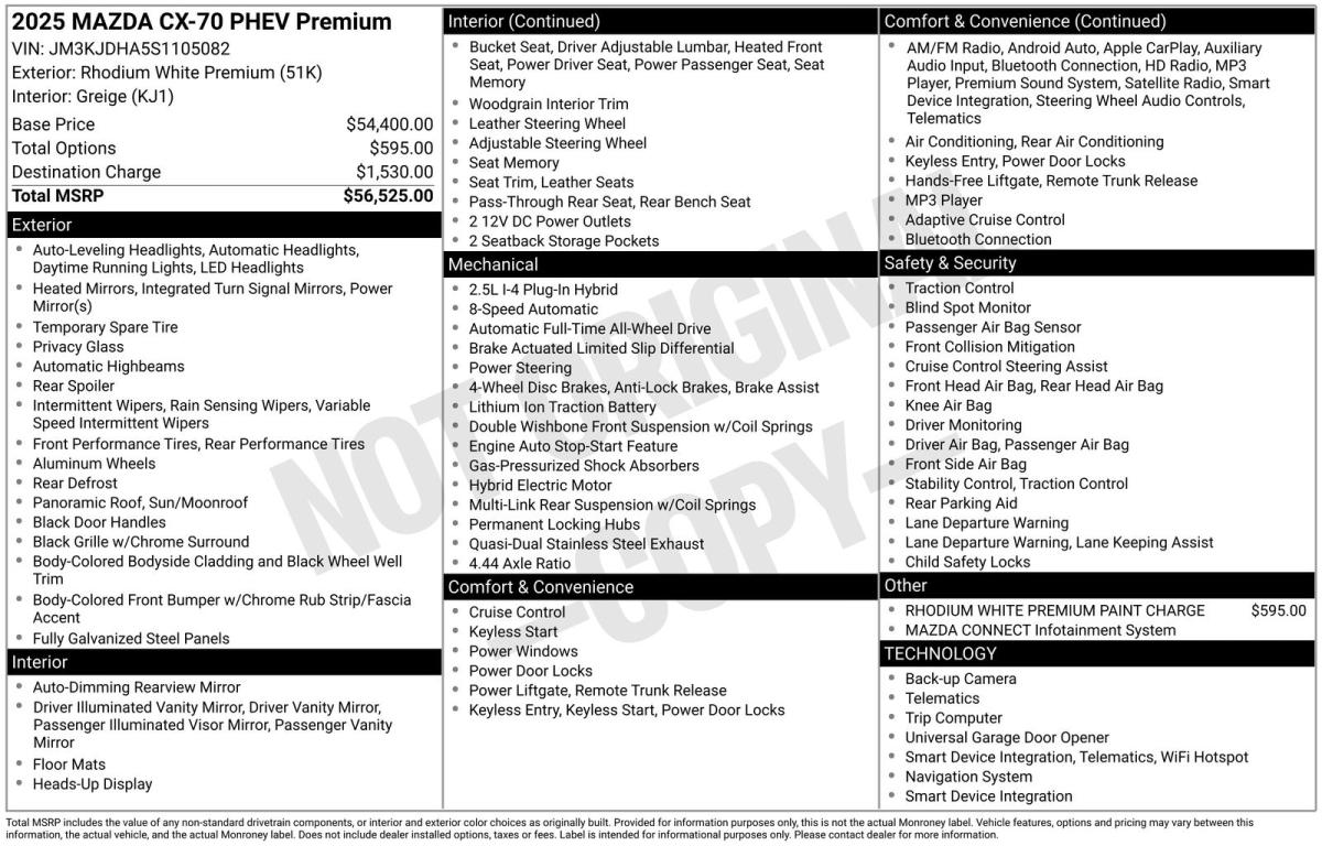 Experience the epitome of modern luxury and performance with this exceptional 2025 Mazda CX-70 PHEV Premium. This stunning SUV is a testament to Mazda's commitment to craftsmanship, innovation, and driver-centric design.Boasting a striking Rhodium White Premium exterior, this CX-70 PHEV Premium is more than just a head-turner. It's equipped with a host of premium features that elevate the driving experience:- Rhodium White Premium Paint Charge- Navigation system: MAZDA CONNECT- 12 Speakers- AM/FM radio: SiriusXM- Radio: AM/FM w/Bose Premium Audio Sound System- Heated Front Bucket Seats- Leather Seat Trim- Power moonroof- Power Liftgate- Heads-Up DisplayStep inside and you'll be greeted by a meticulously designed cabin that seamlessly blends style and functionality. The leather-trimmed seats offer unparalleled comfort, while the Bose Premium Audio Sound System delivers a truly immersive listening experience. The intuitive MAZDA CONNECT navigation system ensures you'll always find your way with ease.Beneath the sleek exterior lies the heart of this remarkable vehicle – a 2.5L I4 DOHC 16V LEV3-SULEV30 engine paired with an 8-Speed Automatic transmission and Mazda's advanced AWD system. This powertrain delivers a thrilling blend of efficiency and performance, making every drive a true pleasure.But the CX-70 PHEV Premium is more than just a joy to drive. It's also designed with your safety and convenience in mind. Features like Automatic Emergency Notification, Blind Spot Monitoring, and Rear Cross-Traffic Alert provide added peace of mind, while the Power Liftgate and Heated Front Seats ensure your everyday tasks are made easier.Discover the perfect balance of style, technology, and capability with this exceptional 2025 Mazda CX-70 PHEV Premium. Experience the difference for yourself and schedule a test drive today. We're confident you'll be impressed by the craftsmanship, performance, and value this vehicle has to offer.