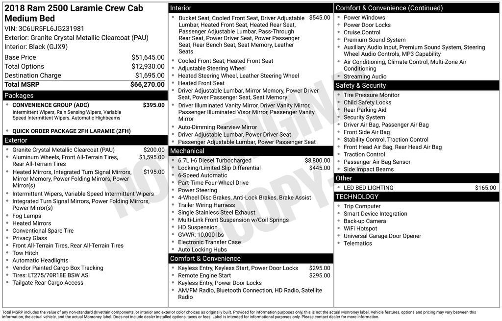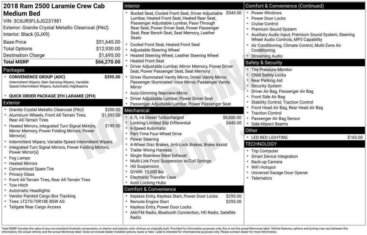 2018 Ram 2500 Laramie Crew Cab 4×4 6'4" Box Granite Crystal Metallic with Black Leather InteriorPowered by the legendary 6.7-liter Cummins Turbo Diesel engine, this Ram 2500 Laramie delivers the power, refinement, and durability that make it one of the most trusted heavy-duty pickups on the road. Equipped with four-wheel drive, a 3.73 axle ratio, and HD suspension, its built to handle serious work and weekend adventures with ease. The Granite Crystal Metallic finish with polished 20-inch aluminum wheels and chrome inserts gives this truck a confident, premium stance that still turns heads today. Inside, the Black leather-trimmed bucket seats and dual-zone automatic climate control bring comfort and style to every drive.Attention-grabbing highlightsNo accidents reported and a well-documented service history showing consistent maintenance and care. Recent services include oil and filter change (July 2025) and four-wheel alignment (September 2025). It has also passed California emissions inspection and was recently inspected and detailed by our service team at Aaron Ford of Poway. This truck stands out for its condition, equipment, and presentation ready for immediate delivery.Factory-equipped options 6.7L I6 Cummins Turbo Diesel Engine ($8,800) Anti-Spin Differential Rear Axle ($445) Convenience Group ($395) Power Folding Chrome Trailer Tow Mirrors ($195) Leather-Trimmed Bucket Seats ($545) 20-inch Painted Aluminum Wheels with Chrome Inserts ($1,595) Granite Crystal Metallic Paint ($200)Original MSRP: $65,515Performance and capabilityThe 6.7L Cummins engine provides the torque and longevity diesel truck buyers demand. HD suspension, auto-locking hubs, and heavy-duty shock absorbers deliver stability whether youre towing, hauling, or cruising the highway. With a payload rating of over 3,000 pounds and factory trailer wiring, its ready to work as hard as you do. ParkSense front and rear sensors and the ParkView backup camera make maneuvering a breeze.Interior comfort and technologyInside youll find the refined Laramie touch heated leather seating, dual-zone automatic climate control, Uconnect infotainment with streaming audio, and a premium sound system with two front LCD displays. Convenience features like power sliding rear window, auto-dimming mirror, and multiple power outlets make daily use easy and comfortable. The fit and finish throughout reflect the care put into this truck from day one.Condition and confidenceIt arrived at our store in excellent mechanical and cosmetic condition and has been freshly serviced and inspected. This Laramie runs and drives exactly as you expect from a well-maintained Cummins truck strong, smooth, and ready to go. The interior shows minimal wear and the paint retains a deep metallic shine that shows off the care taken over the years.Why this one stands outDiesel power, 4×4 traction, premium Laramie trim, and a clean history make this Ram 2500 a smart buy for someone who wants real capability without sacrificing comfort or appearance. Well-optioned and freshly serviced, its ready for its next owner with nothing left to do but drive.Call or email to confirm availability and request a custom video walk-around today. Trade-ins are welcome and financing is available on approved credit. Experience why our customers say Aaron Ford of Poway makes buying your next truck simple and transparent.Family Owned ~ Community Driven ~ You Get More at Aaron Ford of Poway.All vehicles are subject to prior sale. Price does not include applicable government fees and taxes, finance charges, $30 electronic filing charge, $85 document fee, and emission testing charges.