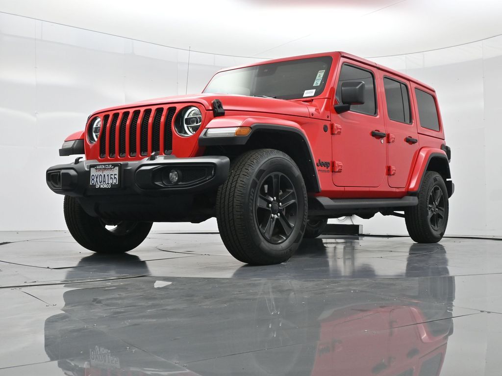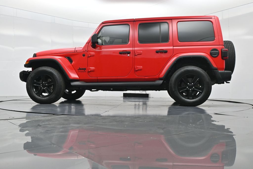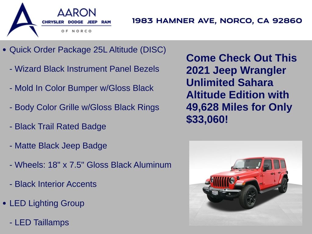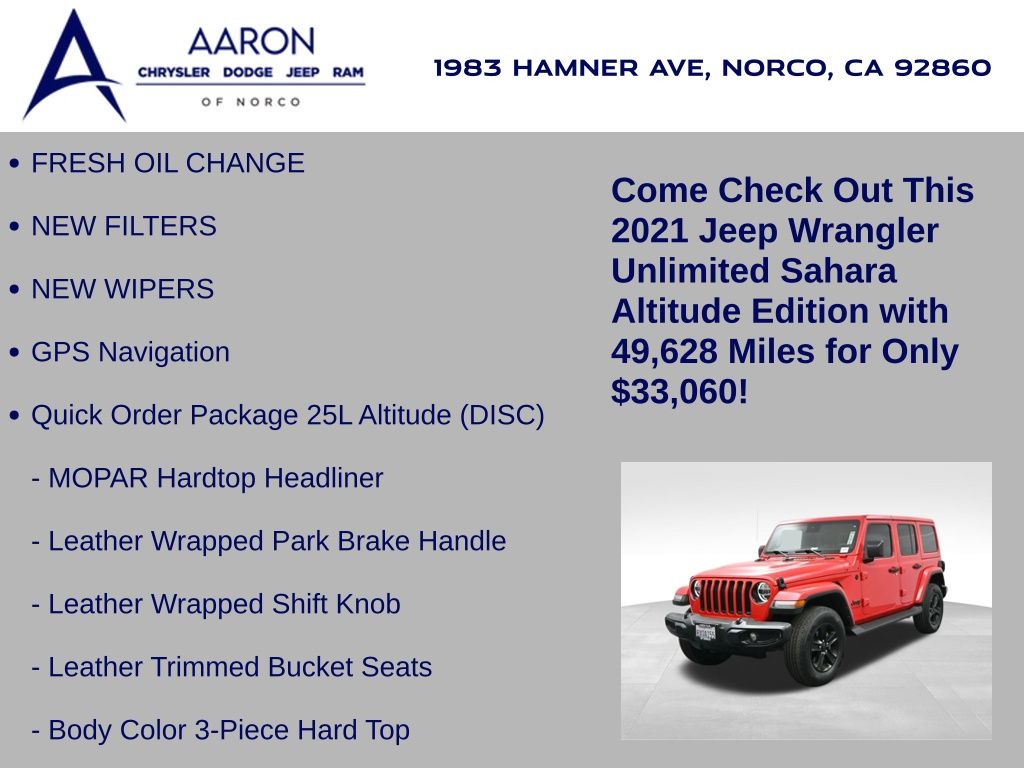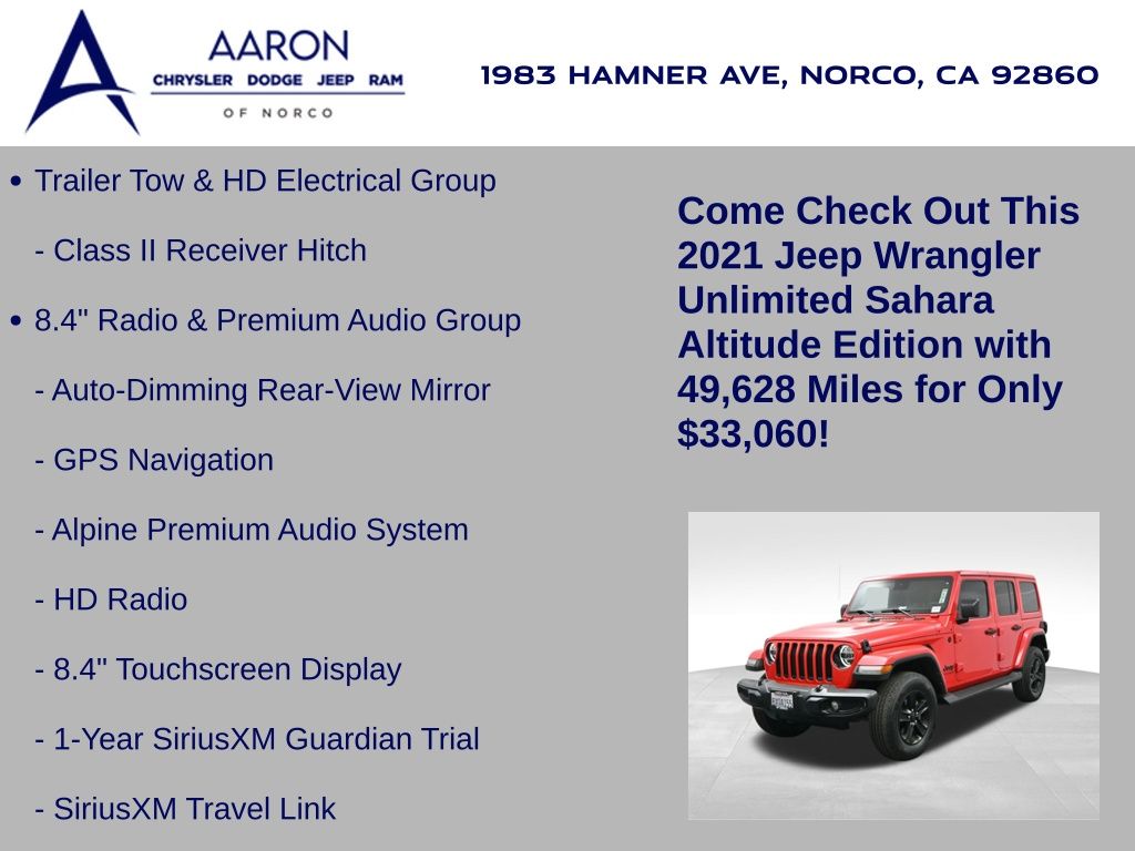 Boldly styled and exceptionally equipped, this 2021 Jeep Wrangler Unlimited Sahara Altitude offers the perfect blend of off-road capability, urban refinement, and everyday comfort, finished in Firecracker Red Clearcoat over a sleek Black interior and showing just 49,628 miles. Under the hood, a 3.6 liter V6 24V VVT engine delivers robust performance paired with an eight speed automatic transmission and Jeeps proven Command Trac four wheel drive system for outstanding traction on any terrain. This Sahara Altitude trim is loaded with features including heated leather trimmed bucket seats, heated steering wheel, remote start, and dual zone automatic climate control for year-round comfort. The cabin includes a leather wrapped dash and shift knob, ambient LED lighting, a seven inch digital driver display, and the Uconnect 4C NAV system with an 8.4 inch touchscreen, premium Alpine audio, integrated navigation, Apple CarPlay, Android Auto, and voice command. Exterior upgrades include the Altitude Appearance Package with 18 inch gloss black aluminum wheels wrapped in all terrain tires, black three piece hardtop, black grille and exterior accents, body color fenders and bumpers, LED headlights and taillamps, and proximity keyless entry. Safety and convenience are enhanced with ParkSense rear park assist, blind spot monitoring, rear cross path detection, trailer tow package with four and seven pin wiring, Class II hitch, backup camera, and a 240 amp alternator. Interior versatility includes fold flat 60 40 rear seats, rear cargo storage tray, Mopar all weather floor mats, and multiple USB ports for passenger connectivity. With a clean one owner Carfax, regular oil changes, recent maintenance including new filters, and personal lease history, this Wrangler Sahara Altitude stands ready for both weekend escapes and daily commutes. Visit us today and discover why the Wrangler continues to set the benchmark for open air adventure and everyday capability.