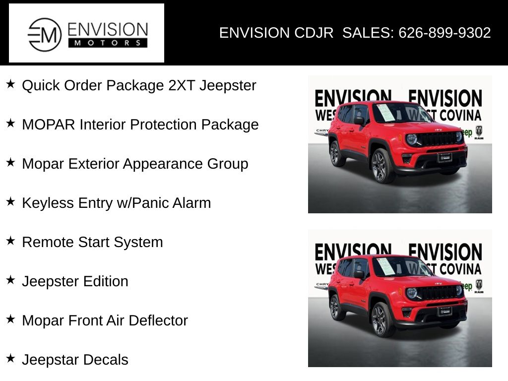 WE SPECIALIZE IN ALL CREDIT PROFILES! See what we can do for you! Call to find out (626) 899-9302.Certified.21/29 City/Highway MPG Deep Tint Sunscreen Glass, Jeepstar Decals, Jeepster Edition, Keyless Entry w/Panic Alarm, MOPAR All Weather Mats, MOPAR Bright Door Entry Guards, MOPAR Cargo Tray, Mopar Exterior Appearance Group, Mopar Front Air Deflector, MOPAR Front Splash Guards, MOPAR Interior Protection Package, MOPAR Side Window Deflectors, MOPAR Splash Guards - Rear, Quick Order Package 2XT Jeepster, Remote Start System, Wheels: 19" x 7.5" Aluminum.Colorado Red Clearcoat2021 Jeep Renegade Sport 4WD 9-Speed 948TE Automatic 2.4L I4FCA US LLC Certified Pre-Owned Details: * Vehicle History * Transferable Warranty * Warranty Deductible: $100 * Limited Warranty: 3 Month/3,000 Mile (whichever comes first) after new car warranty expires or from certified purchase date * Powertrain Limited Warranty: 84 Month/100,000 Mile (whichever comes first) from original in-service date * Vehicles Up to 75,000 Miles and/or 5 Model Years. 24-Hour Towing & Roadside Assistance, Car Rental Allowance, CARFAX® Vehicle History ReportTM and an Introductory 3-month Subscription to SiriusXM® Satellite Radio & Certified Warranty Upgrades * 125 Point Inspection * Roadside Assistance**********All Pricing and Advertised Prices for any/all vehicles offered for sale does not include dealer installed accessories which can be purchased for an additional cost.********** The Factory Rebates may not be available on this vehicle if you elect to take advantage of a Special Alternative APR or Special Lease program. Some Factory Rebates are California Resident specific and may vary for residents of other states. NO sales to Dealers, Brokers or Exporters. For out of state purchase, customers must be present to purchase. If shipping is required, dealership must facilitate; no exceptions. Please contact us for special Multi-Vehicle or Fleet pricing. Prices are plus government fees and taxes, any finance charges, $85 documentary fee, $29 electronic registration fee, any emission testing charge and $1.75 per new tire state tire fee. *** We make every effort to provide accurate information, but please verify before purchasing. Leasing & financing available on approved credit. Trade-ins accepted. Subject to prior sale.