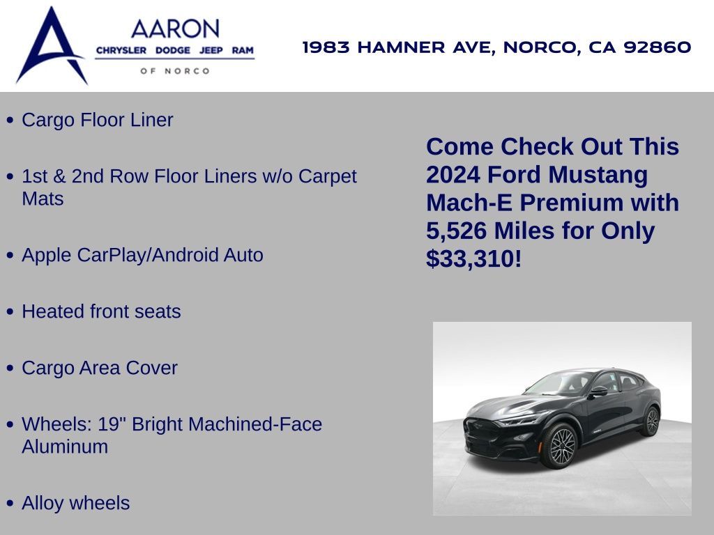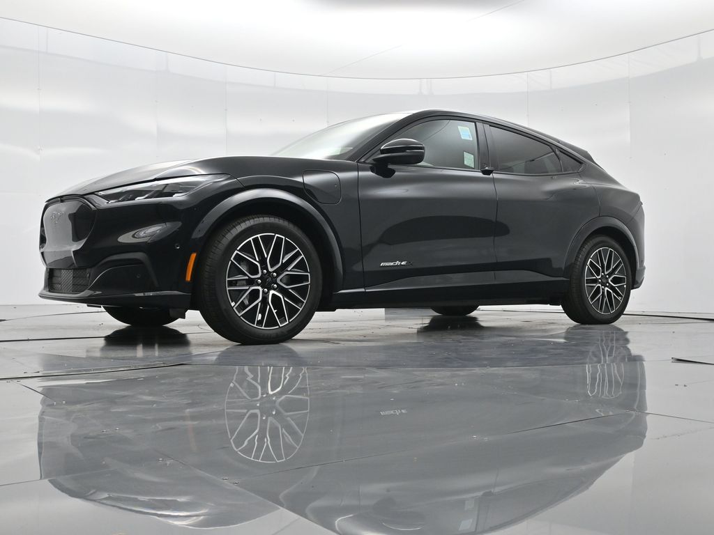 Electrify your drive with this nearly new 2024 Ford Mustang Mach-E Premium RWD, offering just 5,526 miles and finished in striking Shadow Black over a luxurious Black Perforated ActiveX interior. Powered by Fords next-generation electric architecture, this Mach-E delivers seamless acceleration from its single electric motor and extended-range battery, offering an EPA estimated 311 miles of range with 0 to 60 acceleration that rivals traditional sports cars. The rear wheel drive platform combined with a single-speed automatic transmission and 91 kilowatt-hour usable battery provide a smooth and responsive driving experience, while regenerative braking and driver selectable modes including Whisper, Engage, and Unbridled allow for tailored performance to match your style. Inside, the Premium trim surrounds you in modern luxury with heated front seats, a heated leatherette steering wheel, dual-zone automatic climate control, a panoramic fixed glass roof, and a 15.5 inch vertically mounted touchscreen powered by SYNC 4A with enhanced voice recognition, wireless Apple CarPlay and Android Auto, integrated navigation, and a premium B and O 10 speaker sound system. Safety is just as advanced, with Ford Co-Pilot360 including adaptive cruise control, evasive steering assist, lane keeping assist, blind spot monitoring, rear cross traffic alert, reverse brake assist, and a 360 degree camera system. Additional premium features include 19 inch bright machined face aluminum wheels, hands-free tailgate, ambient lighting, mobile power cord, SiriusXM with 360L, interior protection package, and cargo area cover. Backed by a clean one owner Carfax with service history and remaining factory warranty, this personal lease vehicle is in excellent condition and ready for its next chapter. With cutting edge tech, premium comfort, and zero emissions performance, the Mustang Mach-E Premium is redefining what a modern electric crossover should be. Come experience its innovation, range, and excitement today.