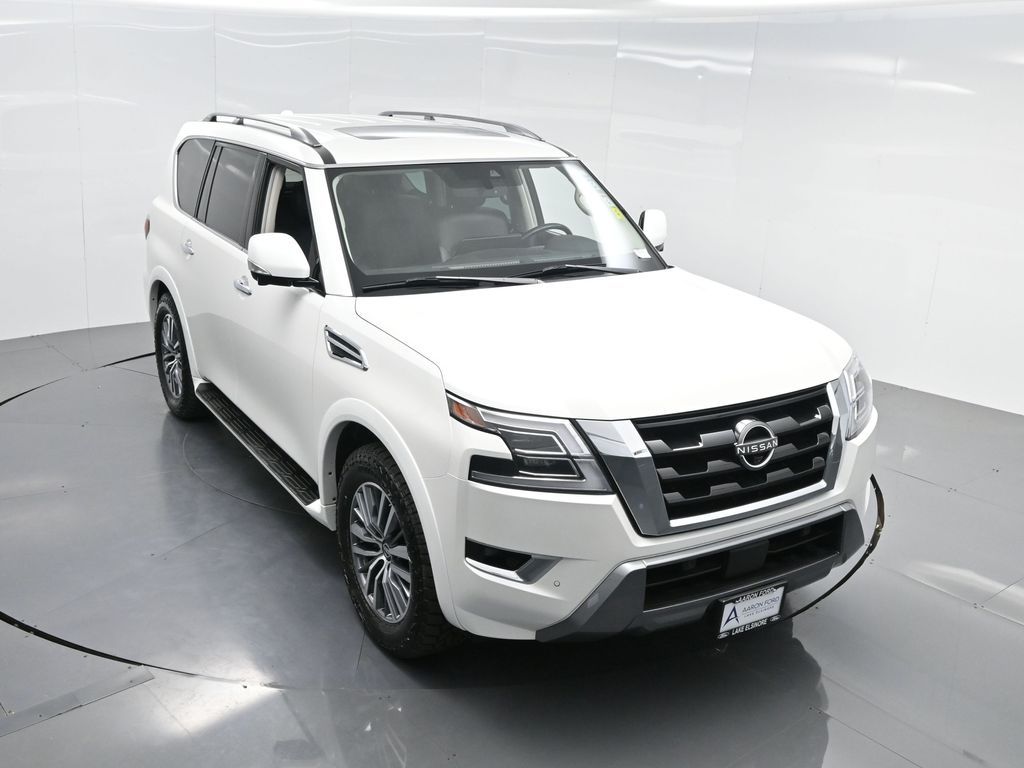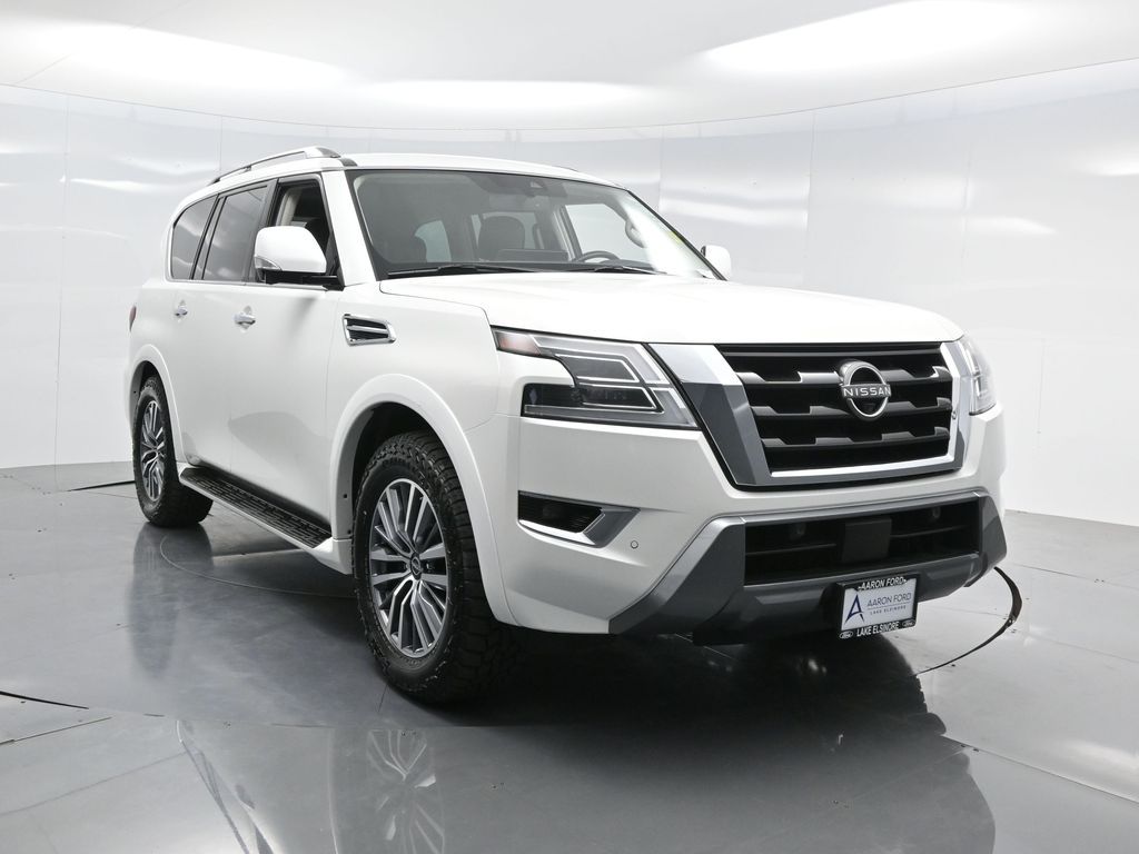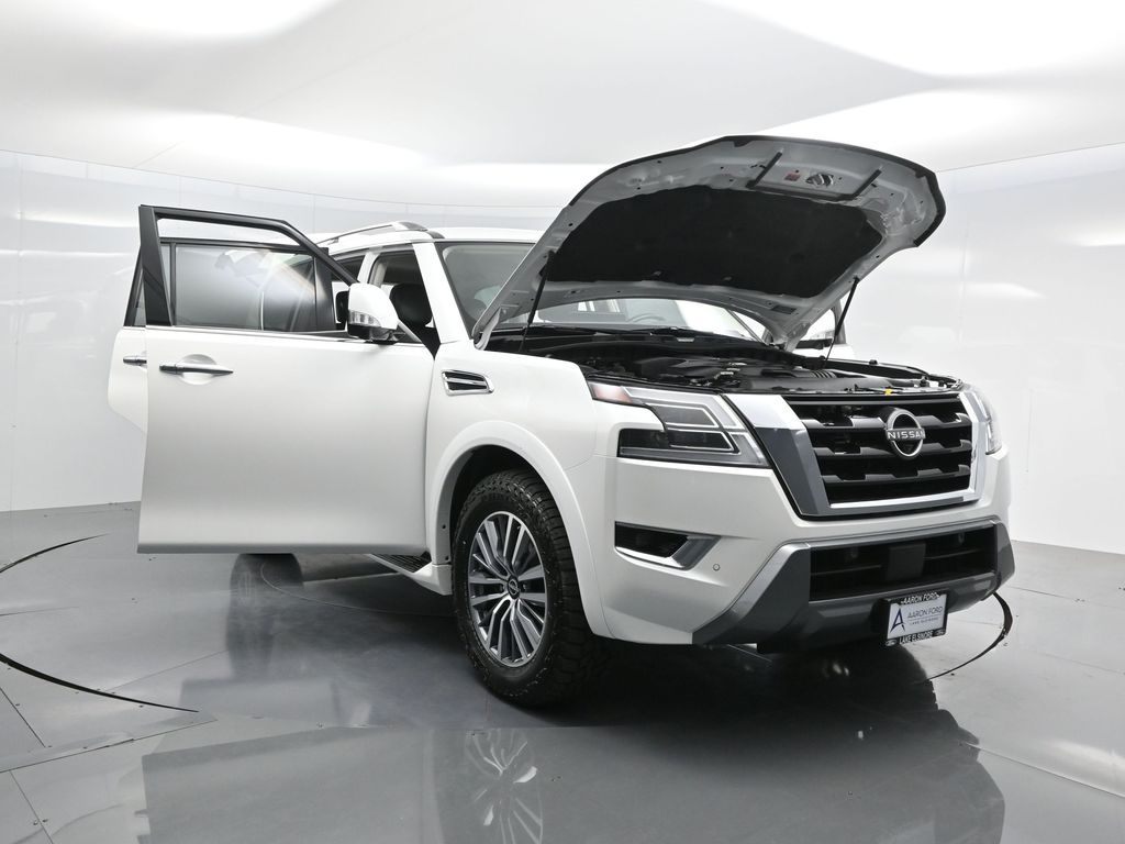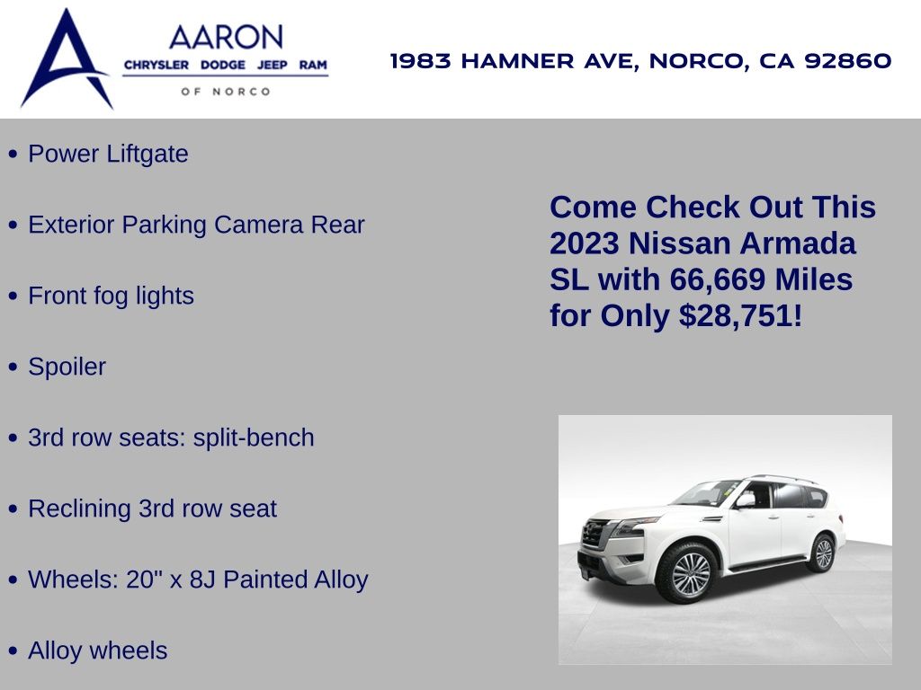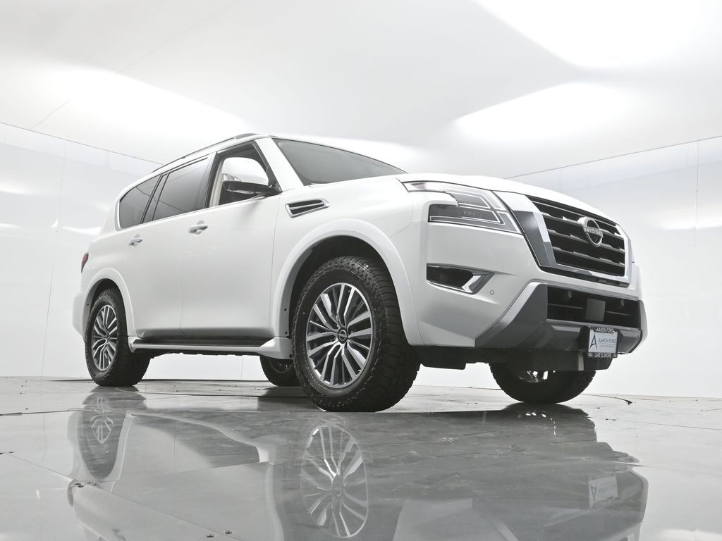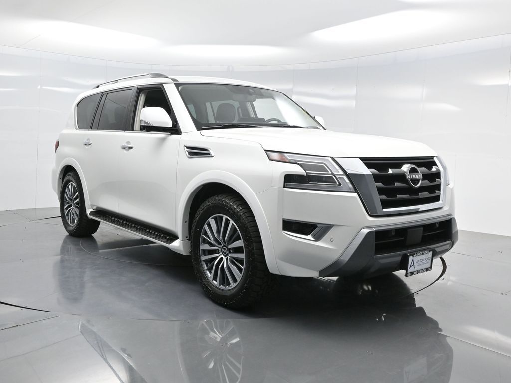 Command the road in full-size comfort and power with this 2023 Nissan Armada SL, finished in Aspen White TriCoat over a Charcoal leather interior and driven just 66,669 miles. Under the hood lies a robust 5.6 liter Endurance V8 engine producing 400 horsepower and 413 pound feet of torque, paired with a seven speed automatic transmission and rear wheel drive for responsive performance and confident towing. This SL trim offers an elevated driving experience with second row captains chairs, a power folding third row, heated front seats, heated leather wrapped steering wheel, dual zone automatic climate control, and power lift-gate for convenience and comfort. Inside the cabin, technology takes center stage with a 12.3 inch color touchscreen infotainment system, navigation, Apple CarPlay and Android Auto, SiriusXM radio with Traffic and Travel Link, Wi-Fi hotspot, and a 13 speaker premium Bose audio system with surround sound clarity. Nissan Safety Shield 360 surrounds you with driver assistance features including automatic emergency braking with pedestrian detection, lane departure warning, blind spot warning, rear cross traffic alert, rear automatic braking, intelligent forward collision warning, high beam assist, and an intelligent around view monitor with moving object detection. The exterior is equally refined, with 20 inch alloy wheels, LED lighting, fog lamps, roof rails, and power folding heated mirrors with LED turn signal indicators. Thoughtful features like remote engine start, trailer sway control, a tow hitch receiver, HomeLink universal garage door transmitter, and rear privacy glass enhance both capability and convenience. With a clean Carfax report, no accidents, one owner history, and consistent service records, this Armada is well cared for and ready for your next family adventure. Spacious, powerful, and equipped with the technology and features modern drivers demand, this 2023 Nissan Armada SL is a premium full-size SUV that blends luxury with long-haul confidence. Schedule your test drive today and experience the refinement and strength that sets the Armada apart.
