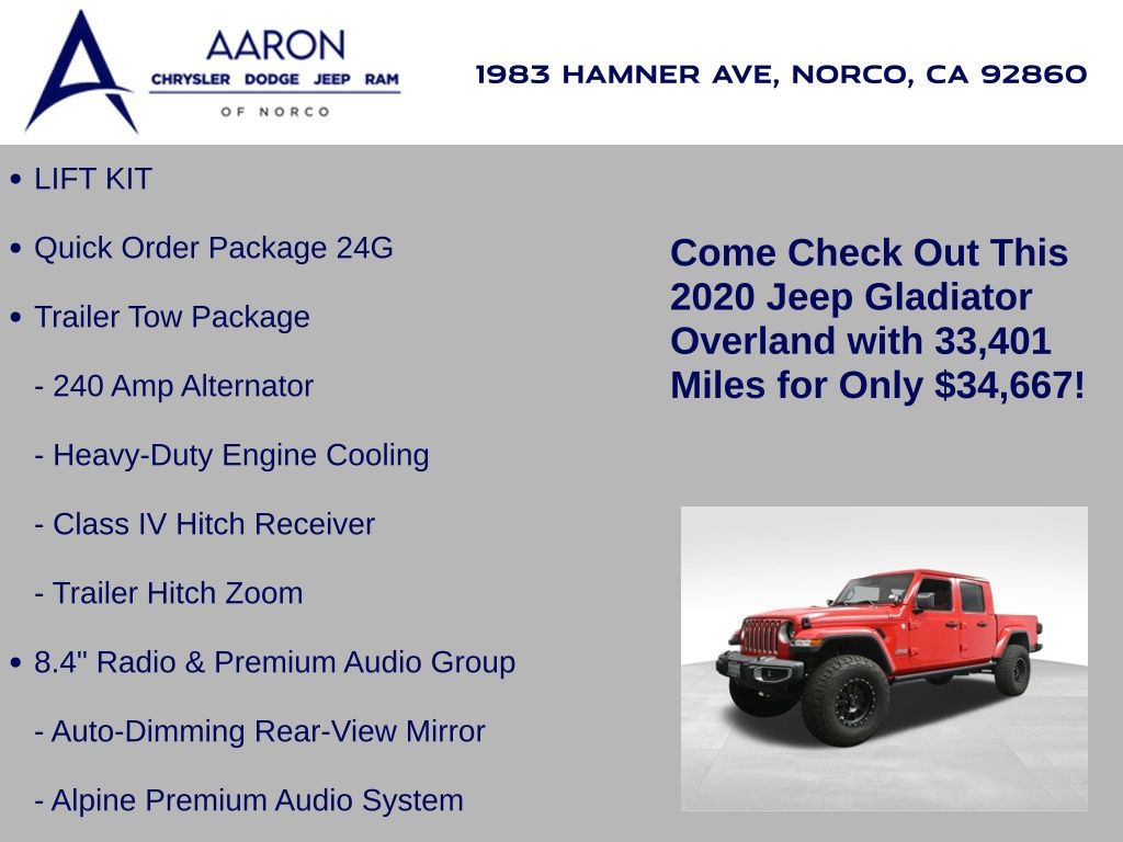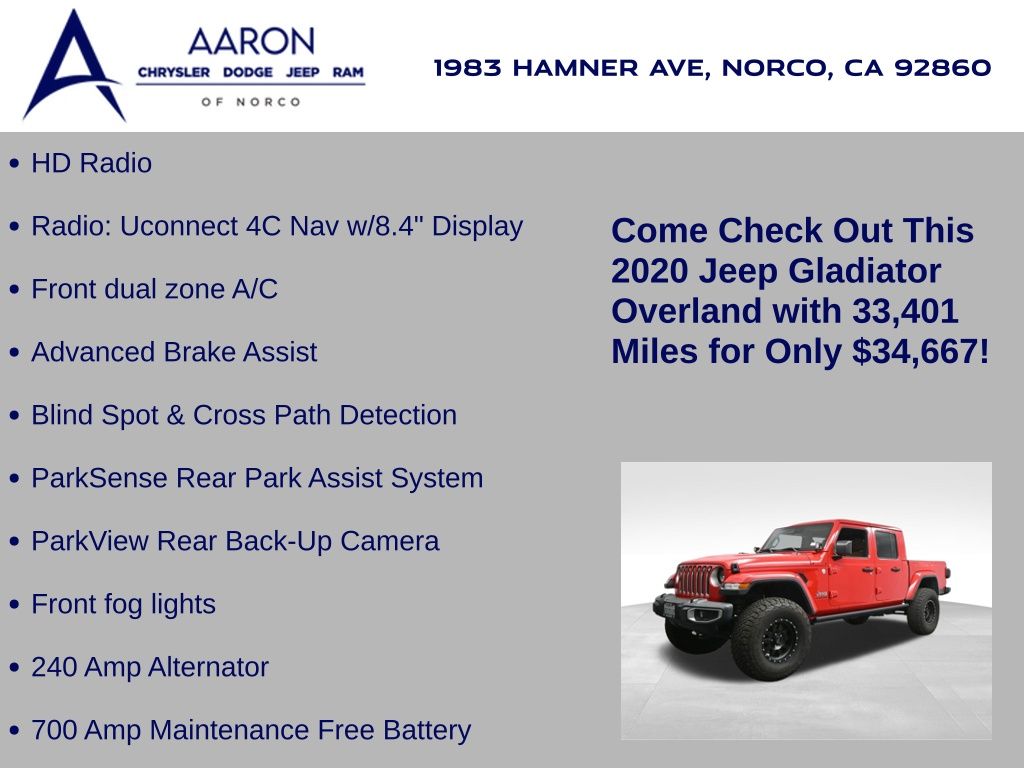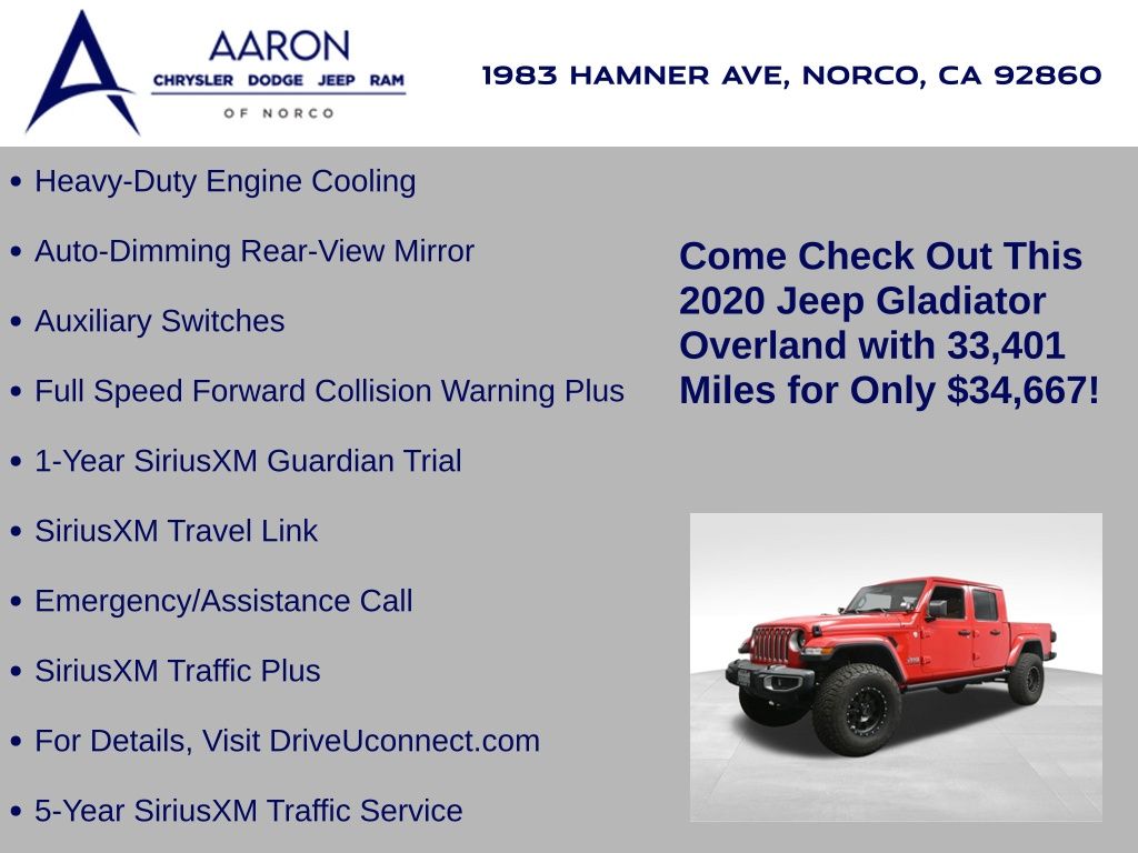Priced below KBB Fair Purchase Price!LIFT KIT, Gladiator Overland, 4D Crew Cab, 3.6L V6 24V VVT, 8-Speed Automatic, 4WD, Firecracker Red Clearcoat, 1-Year SiriusXM Guardian Trial, 240 Amp Alternator, 5-Year SiriusXM Traffic Service, 5-Year SiriusXM Travel Link Service, 700 Amp Maintenance Free Battery, 8.4" Radio & Premium Audio Group, Advanced Brake Assist, Advanced Safety Group, Alloy wheels, Alpine Premium Audio System, Auto-Dimming Rear-View Mirror, Auxiliary Switch Group, Auxiliary Switches, Blind Spot & Cross Path Detection, Class IV Hitch Receiver, Emergency/Assistance Call, For Details, Visit DriveUconnect.com, Front dual zone A/C, Front fog lights, Full Speed Forward Collision Warning Plus, HD Radio, Heavy-Duty Engine Cooling, ParkSense Rear Park Assist System, ParkView Rear Back-Up Camera, Quick Order Package 24G, Radio: Uconnect 4C Nav w/8.4" Display, Safety Group, SiriusXM Traffic Plus, SiriusXM Travel Link, Trailer Hitch Zoom, Trailer Tow Package.Clean CARFAX.Awards: * NACTOY 2020 North American Truck of the Year * 2020 KBB.com 10 Favorite New-for-2020 Cars