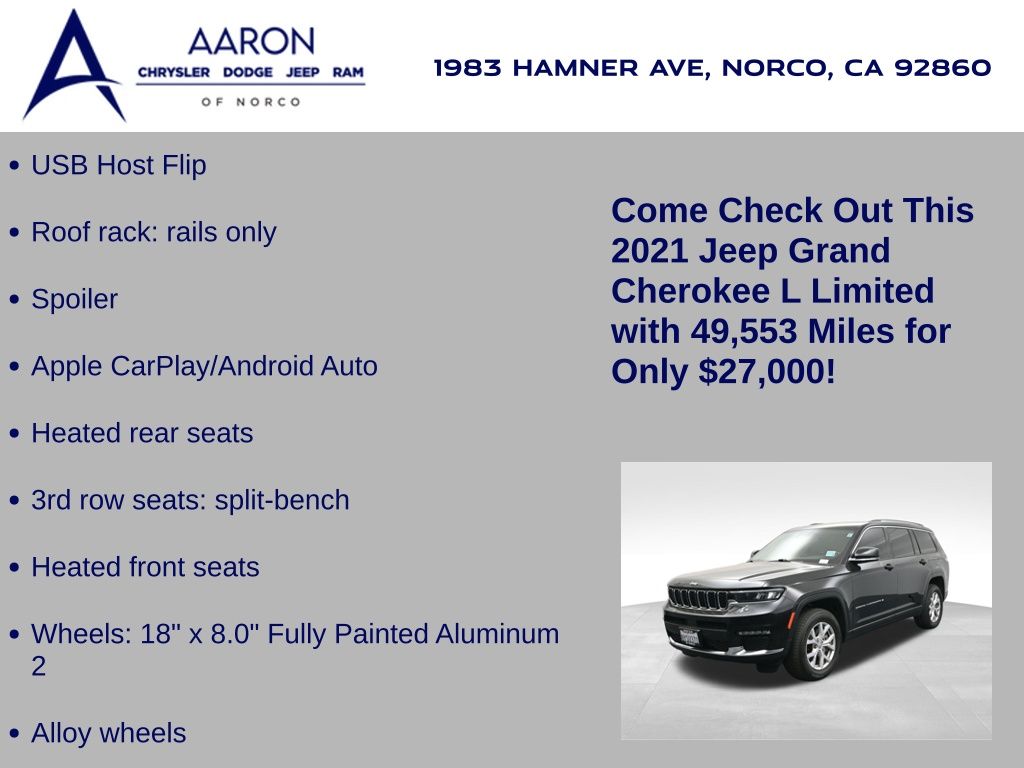 2021 Jeep Grand Cherokee L Limited 4x4 | Customer Preferred 22E | 3.6L V6 | 1-Owner | just under 50,000 miles | 18/25 MPG3-row with 2nd-row buckets, power lift gate, Uconnect 8.4-in, advanced safety. Para la version en espanol, vea abajo.Quadra-Trac I 4x4 with Selec-Terrain drive modes adds all-weather confidence, while driver aids include Full-Speed Forward-Collision Warning Plus, Active Lane-Management, ParkSense Front/Rear Park-Assist with Stop, ParkView backup camera and Blind-Spot/Rear Cross-Path detection. Heated and ventilated front seats, heated second row, heated wheel and a wireless charging pad elevate comfort.Renowned for capability, comfort and tech in the three-row SUV segment.Shop with confidence: we keep the process transparent from appraisal to delivery, complete every inspection and reconditioning step, and offer straightforward financing. Our knowledgeable, no-pressure team prices vehicles using live market data to keep deals fair and competitive.Take the next step by messaging us for a personalized quote or to arrange a convenient visit. We offer flexible options like virtual consultations and promise to resolve any questions transparently to build your confidence in us.2021 Jeep Grand Cherokee L Limited 4x4 | Customer Preferred 22E | V6 3.6L | 1 propietario | poco menos de 50,000 millas | 18/25 mpgSUV de 3 filas con asientos tipo capitan en la 2. fila, porton electrico, Uconnect de 8.4" y seguridad avanzada.El sistema Quadra-Trac I 4x4 con modos Selec-Terrain brinda confianza en todo clima, y suma asistencias como advertencia de colision frontal a velocidad completa, manejo activo de carril, ParkSense delantero/trasero con frenado, camara ParkView y monitoreo de punto ciego con alerta de cruce trasero. Asientos delanteros con calefaccion y ventilacion, segunda fila calefactable, volante termico y cargador inalambrico elevan el confort.Reconocida por su capacidad, comodidad y tecnologia entre las SUV de tres filas.Compra con tranquilidad: manejamos un proceso transparente, realizamos inspeccion y reacondicionamiento completos y ofrecemos financiamiento sencillo. Nuestro equipo sin presiones y con datos de mercado mantiene precios justos y competitivos.Da el siguiente paso: envianos un mensaje para una cotizacion personalizada o agenda una visita. Ofrecemos opciones flexibles como consultas virtuales y responderemos con transparencia para darte total confianza.