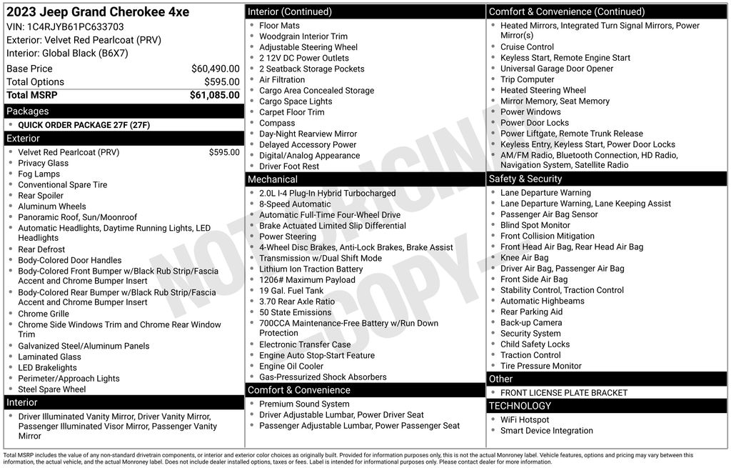 Velvet Red Pearlcoat 2023 Jeep Grand Cherokee 4xe 4WD 8-Speed Automatic 2.0L I4 DOHC 2.0L I4 DOHC, 4WD, Navigation System, Quick Order Package 27F.